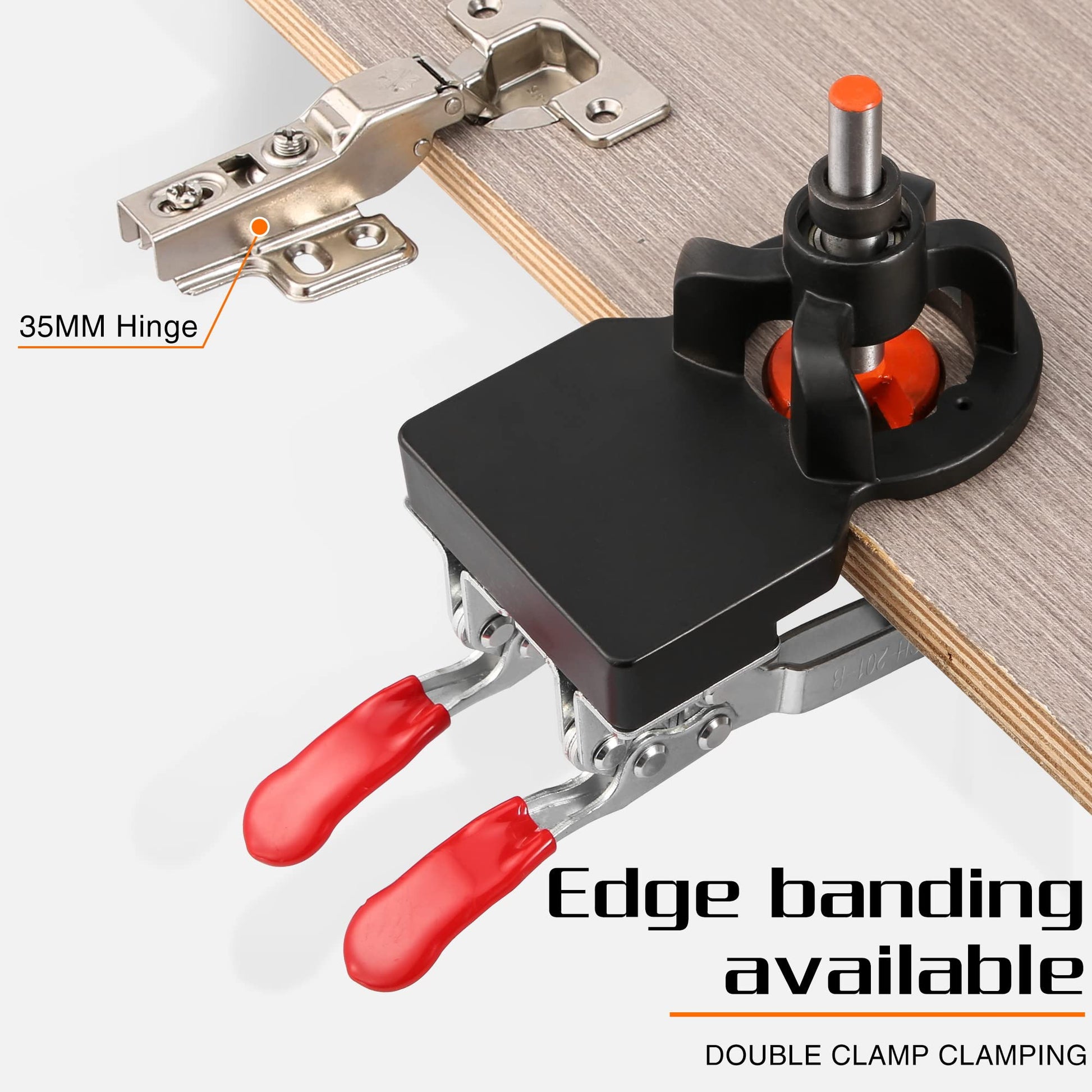 "Adjustable double clamping plate for precise positioning, clamping 15-25mm thickness of wood panels, convenient for quick multi-angle drilling and installation of cabinet door hinges.",