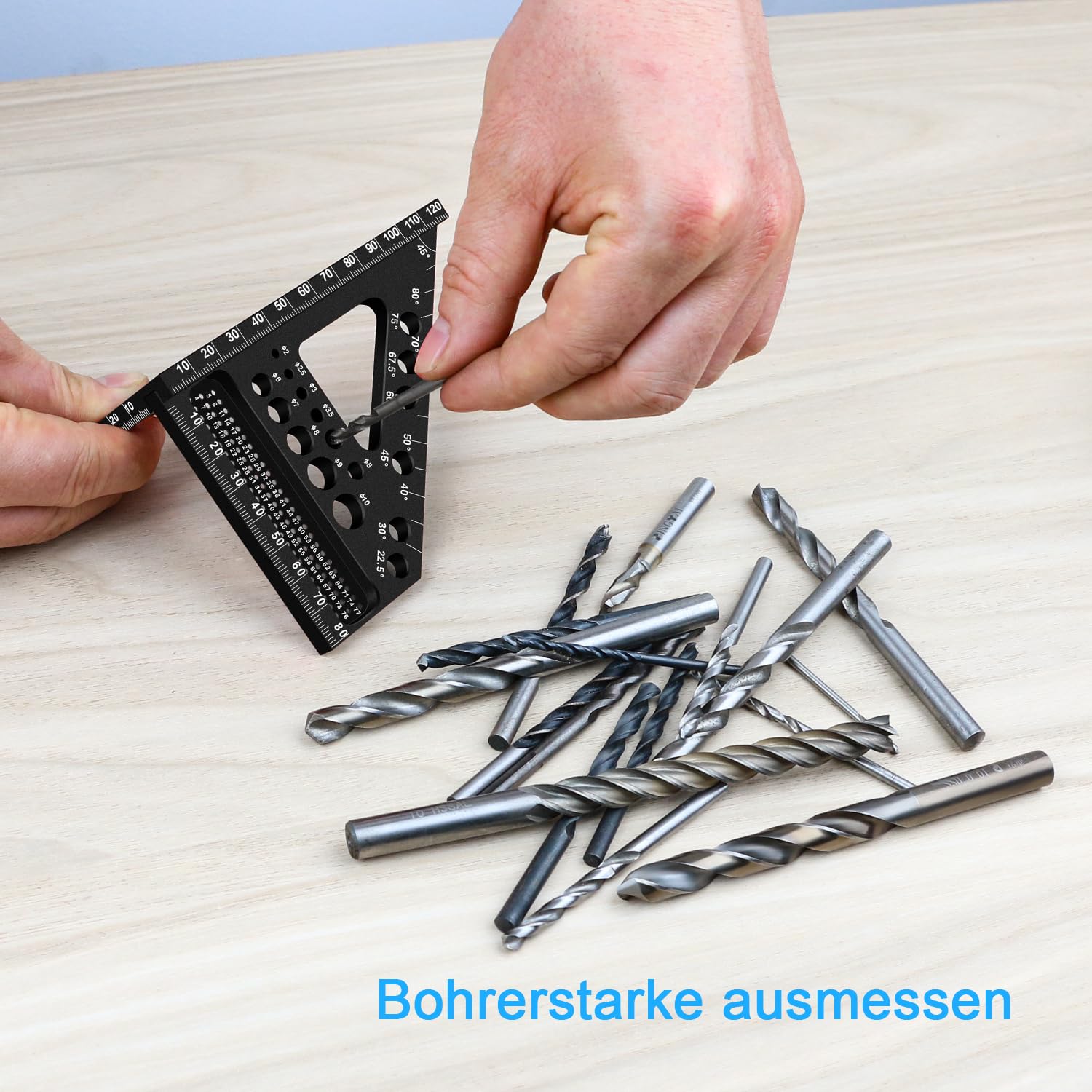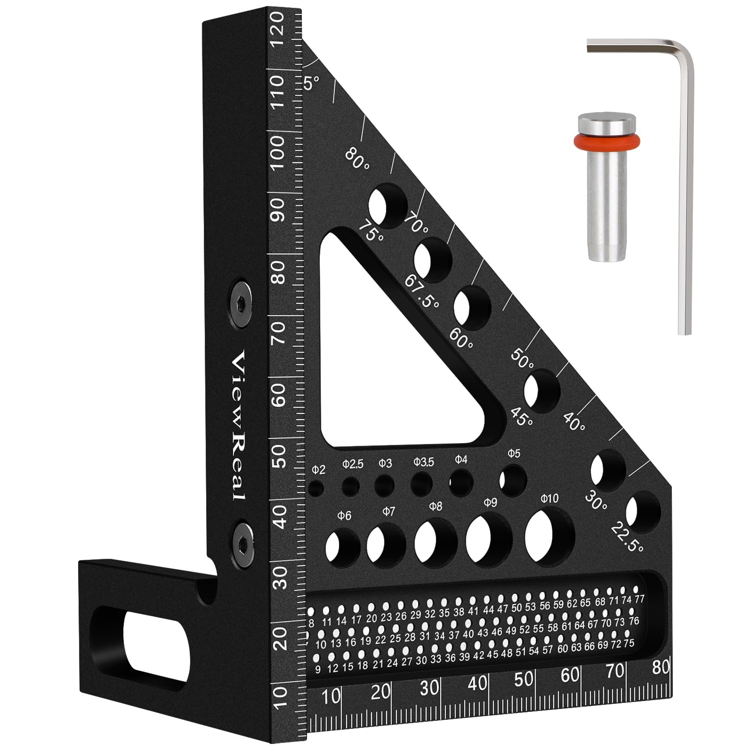["Robust material: 3D miter angle made of high-quality aluminum alloy material after oxidation treatment, high hardness, high toughness, wear-resistant, corrosion-resistant, and durable in use. Compared to other plastic angle rulers, it is more durable.", "Versatility and Multi-angle: The miter angle can be used for square, circular hole, parallel line, vertical line, drilling positioning, T-shaped scribe, 22.5-90° angle. Measure and transfer angle measurements. It includes preset angles of 22.5°, 30°, 45°, 60°, 67.5°, and 75° angle stop/marking gauge for parallel lines. Drill sizes with the drill guide.", "Wide Application: The carpenter's square is suitable for three-dimensional workpieces such as beams, square and tubular, hollow and solid, aluminum alloy, wood, stainless steel, marble, etc. Ideal for angle stops for woodworking, engineering, and construction tasks.", "Measurement Accuracy: laser-engraved metric scales and corner angles on both sides of the carpenter's square are clear and precise, making it convenient and easy to read the value or make markings during use. You don't have to flip the body when measuring. Just slide to mark the left and right 22.5-90 degree angles.", "Essential Tool: Our 3D miter angle is an essential tool for the woodworking industry. When equipped with this multifunctional ruler, a wise maintenance worker, carpenter, DIY enthusiast, engineer, or construction worker will perfectly solve various work requirements."]
