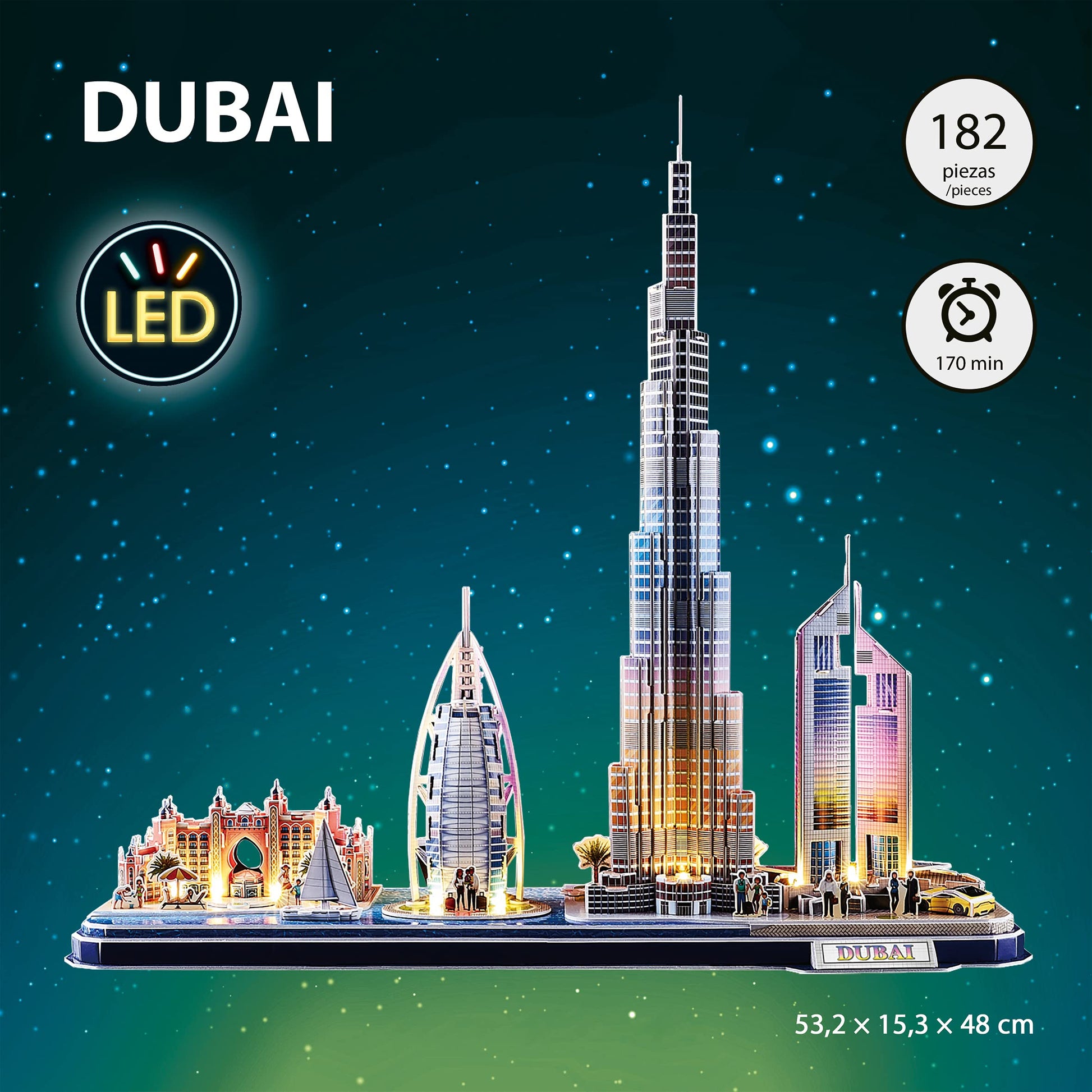 ["3D PUZZLE: The Dubai LED 3D puzzle consists of 182 pieces. This adult model kit can be assembled without the use of tools, and this 3D puzzle can be used as a decorative object once completed.", "EASY TO ASSEMBLE: The assembly time for this 3D puzzle for kids is approximately 170 minutes. This 3D puzzle for kids and 3D puzzle for adults is an ideal model to assemble alone, with family, or with friends.", "GOOD QUALITY: The 3D puzzles are very interesting as they recreate a model of the city of Dubai, incorporating the main and most visited monuments and LED lights, making it a great gift for adult model kit 3D puzzle for kids and 3D puzzle for adults to build.", "REALISTIC DESIGN: The design of the Dubai LED 3D puzzle for kids and 3D puzzle for adults is very realistic. This model has all kinds of details both on the front and back. Being a 3D puzzle for adults, this 3D puzzle can be placed as decoration on a shelf after assembly.", "GIFT FOR KIDS: These 3D puzzle for kids and 3D puzzle for adults are brilliant gifts that can be given as a birthday present, Christmas gift, Valentine's Day gift. It is a 3D puzzle for kids from 8 years old."]