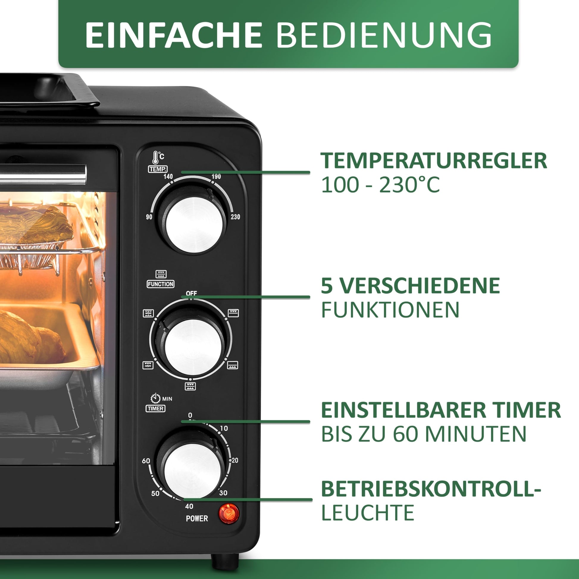 ["Compact design, easy operation, 1300 watts and many extras such as a removable grill plate that sits on top of the oven, top and bottom heat, convection, infinitely adjustable temperature setting, and a built-in 60-minute timer characterize the oven.","A very special extra is the removable grill plate with which you can prepare, arrange, cook, and of course grill your meals. With a capacity of 20 liters, you can easily and quickly prepare larger meals as well. Baking, toasting, grilling, defrosting... With this oven, you are prepared for everything.","An easy and quick preparation of your meals is guaranteed thanks to the temperature controller that goes up to 230°C. A compact design, easy operation, and many extras will convince you.","✅ Highlights: Capacity: 20 liters Top/bottom heat Convection Baking, toasting, grilling, defrosting Interior lighting Easy operation Large viewing window Power: 1300 W Infinitely adjustable temperature setting: 100 - 230°C 4 stainless steel heating elements Adjustable timer with signal up to 60 min Indicator light Convection Heat-resistant housing","✅ Details: External dimensions: approx. 40 x 34 x 29 cm (W-D-H) Internal dimensions: approx. 27.8 x 27.5 x 23 cm (W-D-H) Grill plate (grilling area): 27.5 x 25.7 cm (W-D) Power supply: 220V-240V/ 50/60 Hz Power cord length: approx. 90 cm Color: Black Delivery includes: Oven 2x baking tray Grill rack Handle"]