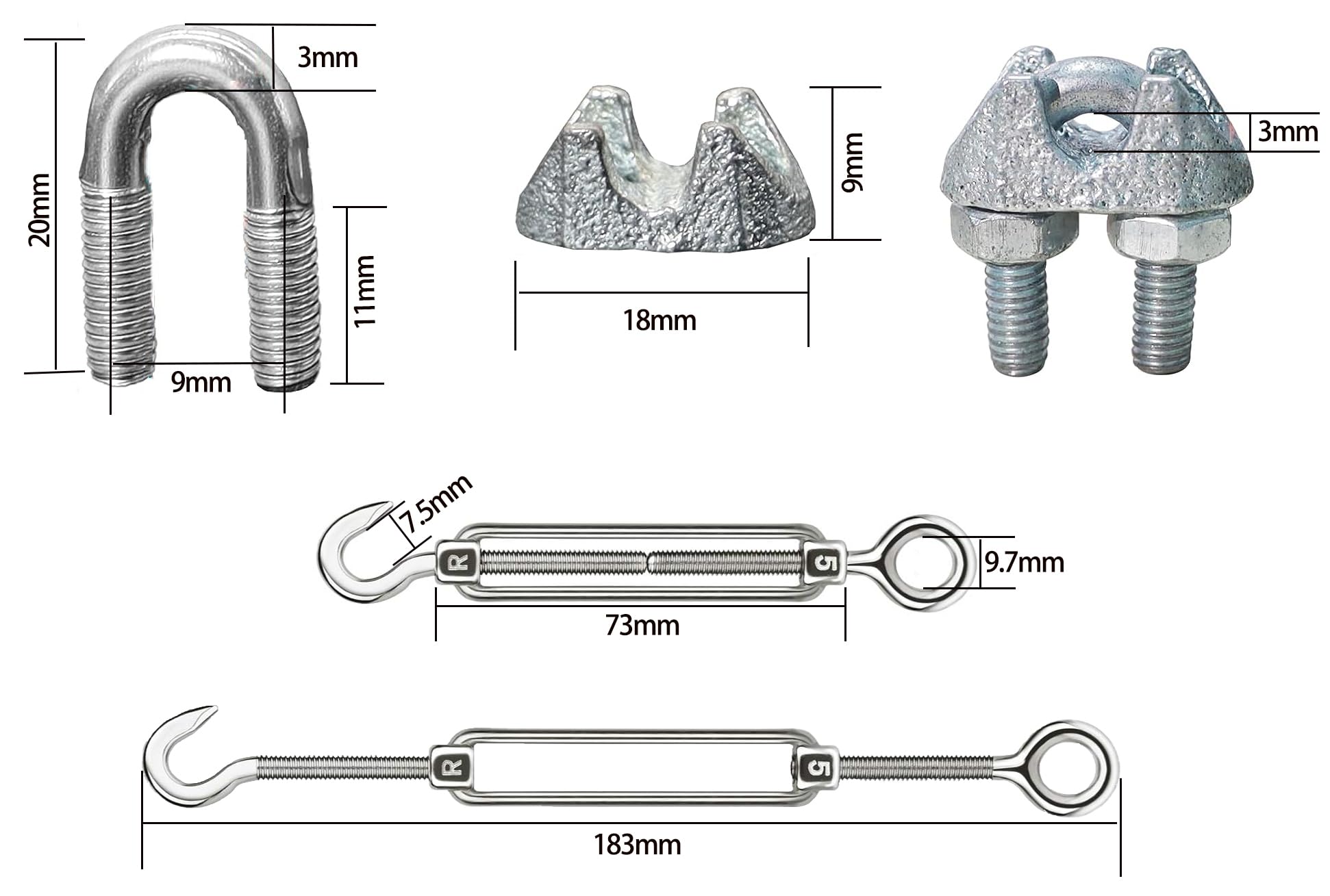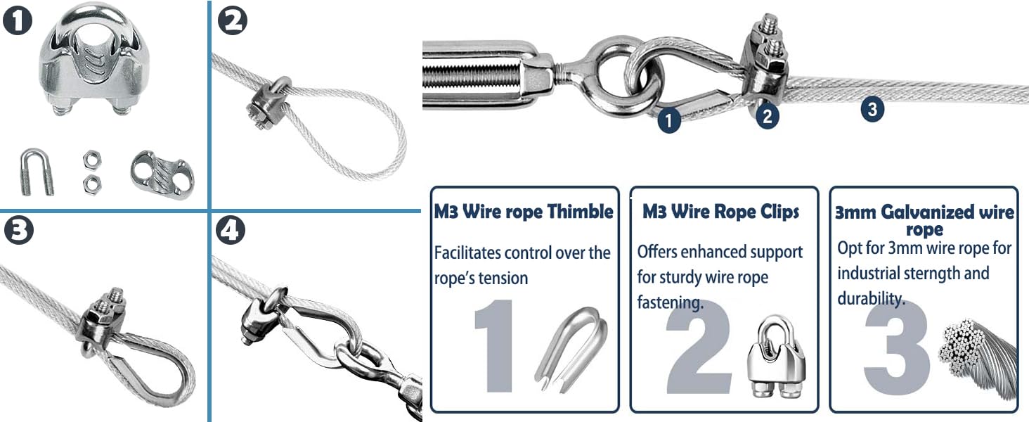 【3MM Steel Cable】- You only need M3 wire rope clamps to attach the wire rope, with the M5 steel cable tensioner it can easily be mounted in a wire rope line, then you can DIY a variety of places.