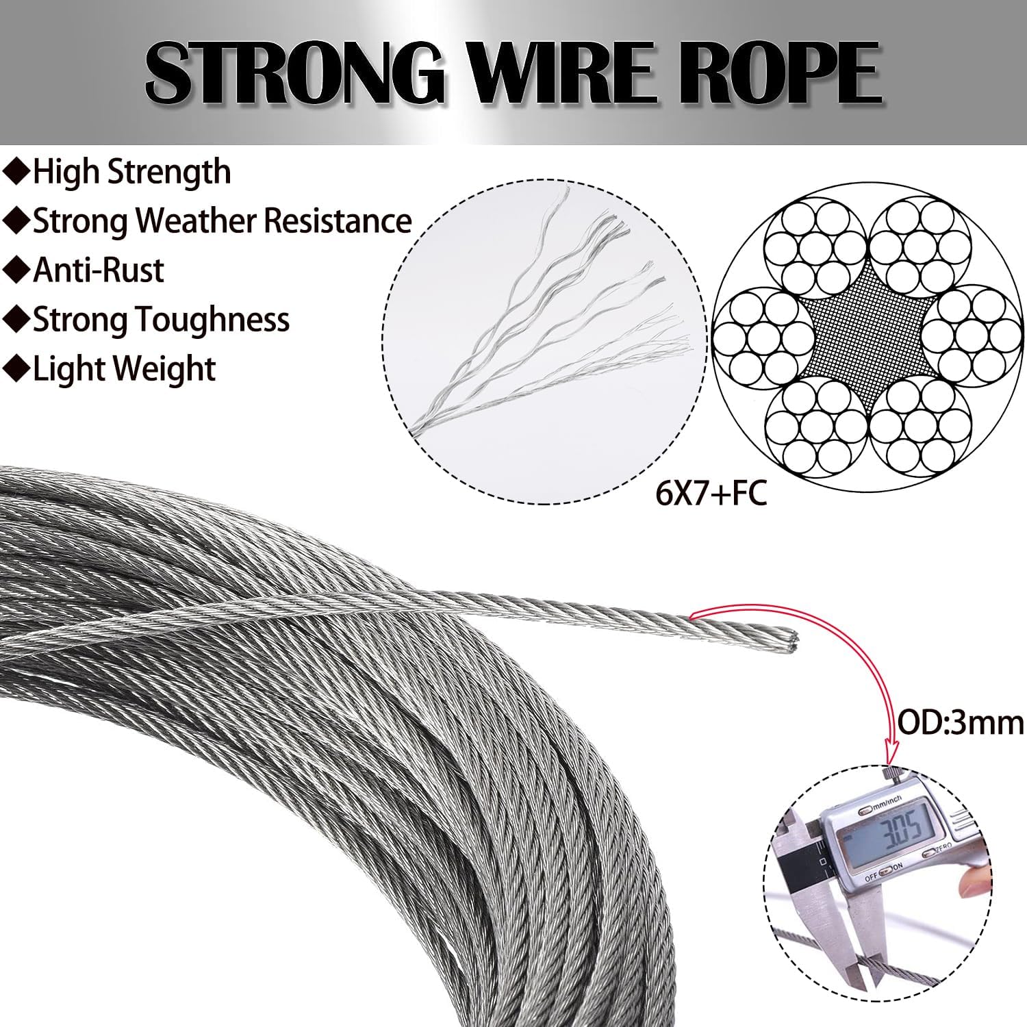 3mm stainless steel wire rope for climbing support, rust-free rope suitable for hanging lamps. Comes with M5 turnbuckles and wire rope thimbles. Length: 30m.
