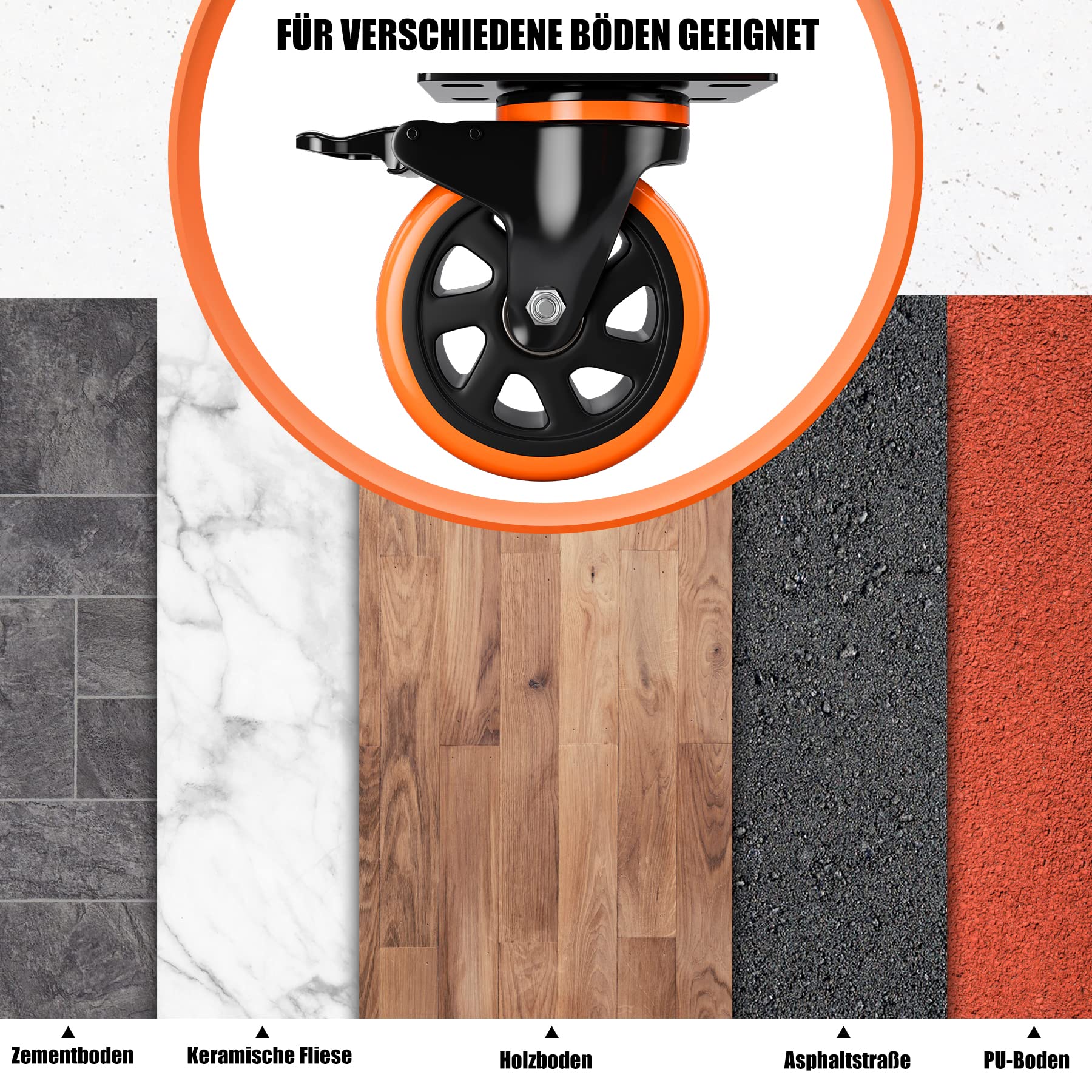 ["◎Sturdy Heavy Duty Casters: These sets of 4 heavy-duty casters feature a solid construction made of high-quality, thickened steel housing, thickened top plate, and double support bearings on each caster. Powerful load capacity of up to 1060 lbs, with each caster able to carry 265 lbs, saving energy and effort.","◎Double Safety Brake: Our casters can be rotated 360 degrees, and each swivel caster has a separate brake that locks the wheel and allows it to rotate at the same time. When the brake is engaged, it securely holds the device in place, preventing it from moving and causing harm to individuals.","◎Smooth & Traceless: Heavy-duty casters are made of high-quality polyurethane material that is wear-resistant and reduces vibrations, with quiet vibration dampers for smooth, quiet, and traceless gliding on a variety of floor surfaces, especially uneven surfaces. Additionally, each caster has a dust ring that prevents dust from entering the bearings, improving the performance of the industrial casters.","◎Easy to Assemble & Wide Application: Each caster pack includes 4 universal casters with brakes, two mounting kits: 16 x round head screws with 16 washers plus 1 x screwdriver, 16 x flat hexagon screws with 16 nuts plus 1 x wrench for two different types of installation. You can easily install wheels for trolleys, DIY furniture casters, workbenches, trolleys, cabinets, adding furniture casters for easy mobility.","◎Floor Protection: Transport casters move smoothly and tracelessly. The soft rubber wheel surface of the transport casters protects the floor even better. The Asibaade casters are suitable for all types of floors: wooden floors, tiles, carpets, concrete roads, etc."]