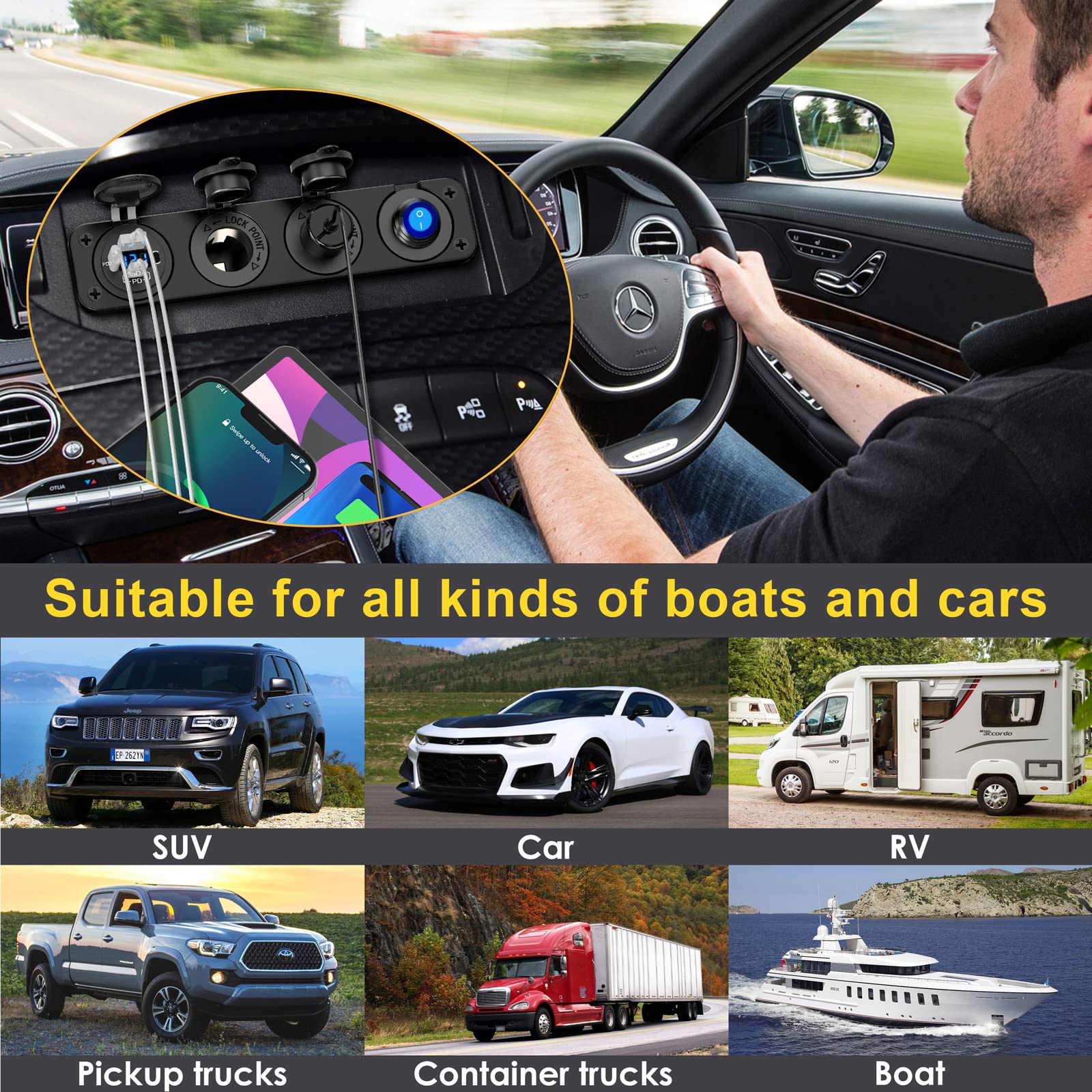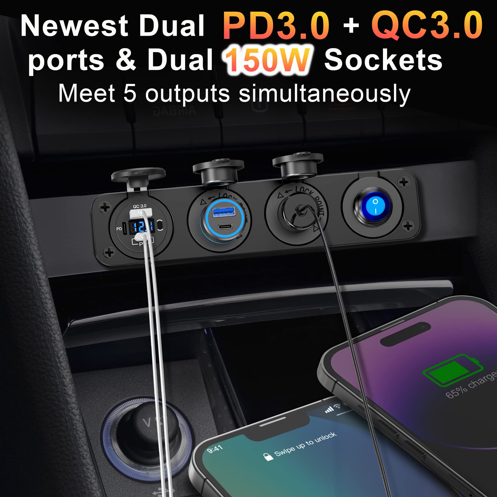 ["♧♧【Latest 4-in-1 Charging Socket Panel】 This multifunctional 12V switch panel is equipped with two USB-C ports + two cigarette lighter sockets + LED voltmeter digital display + waterproof toggle switch. One product meets all your needs and you can combine them as you wish.","♧♧【Dual high-quality 150W power outlets】 By installing two cigarette lighter sockets on the same control panel, this compact and space-saving design accommodates USB car chargers, GPS devices, digital cameras, dash cams, and other accessories, ensuring worry-free charging.","♧♧【Fast USB Charger with Voltmeter】 This 12V USB socket is an officially certified fast USB charger with two 30W USB-PD fast charging ports and an 18W QC3.0 USB-A fast charging port to meet the daily needs of mobile phones, tablets, wireless chargers, and other devices with a maximum output power of 66W. Additionally, the blue voltmeter allows real-time monitoring of your vehicle's voltage, keeping you informed of your vehicle's status at all times.","♧♧【Waterproof Toggle Switch】 The charger socket panel is equipped with a waterproof toggle switch that allows you to independently turn on and off the 12V USB socket and 2 cigarette lighter sockets. This function not only helps save power but also extends the product's lifespan. The toggle switch has an electrical life of over 10,000 cycles, ensuring long-lasting and reliable performance.","♧♧【Wide Compatibility】 The USB charger is designed to be compatible with a wide range of vehicles, including cars, boats, trucks, off-road vehicles, and RVs powered by a 12-24V power supply. Additionally, the 12V panel is waterproof to IP65 standards, making it suitable for use in harsh environments such as motorcycles, boats, and golf carts. This feature ensures that the charger remains protected from water, dust, and other environmental factors, allowing you to use it seamlessly in a variety of environments.","♧♧【Easy Installation】 Panel, screws, wiring with 15A fuse, etc. - it's nice to know that the product comes with all the necessary accessories for easy installation. It is important to carefully follow the installation instructions, especially if you are installing a product like this for the first time. This will ensure a smooth installation process and have the product ready to use in just 30 minutes."]
