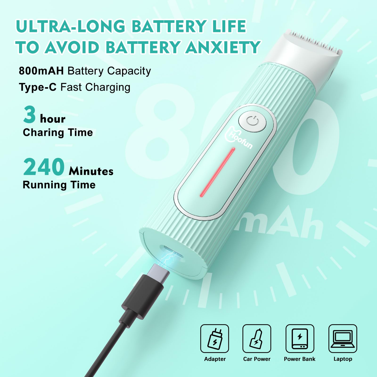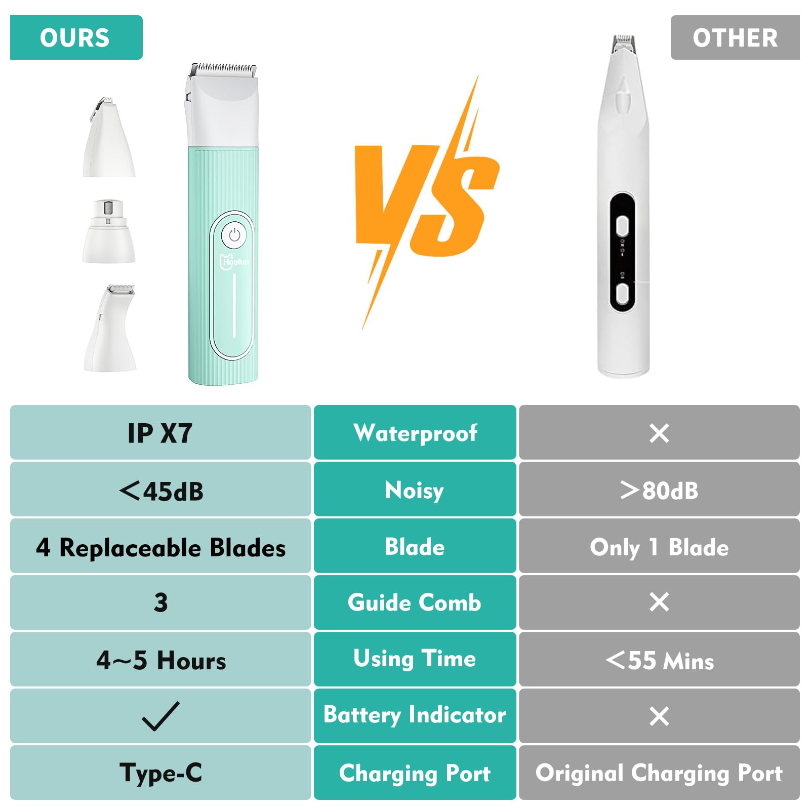 ["【Safe and Effective】 Many pets are often nervous due to the noise and vibrations of pet hair clippers, our dog trimmer uses superior motor and quiet technology to keep them calm and help pets polish their paws faster and easier.","【Complete Dog Trimmer】 Our Electric Dog Trimmer includes 3 trimming heads and 1 interchangeable nail grinding head, if you are looking for a clipper for grooming dogs, cats, or other furry friends, look no further, this dog clipper has everything you need for electric hair clippers full body trimming and manicure.","【Washable, Easy to Carry】 Our cat hair clipper is very light, easy to carry, recharge anytime and anywhere, only needs to be charged for 5 hours can be continuously used for 240 minutes. This professional dog clipper set can be washed directly under the faucet, IPX7 waterproof.","【Perfect PET HAIR CLIPPER】 Our pet hair clipper comes with 3 guide combs, your pet's hair will be perfectly trimmed to your desired length, comfortable for your pet's skin. Our long-haired dog clipper provides your pet with a safe, relaxing grooming experience!","【Cordless Use】 Cordless pet hair clipper allows you to move freely in any direction and reach difficult areas. The lightweight and ergonomic housing design makes operation easier."]