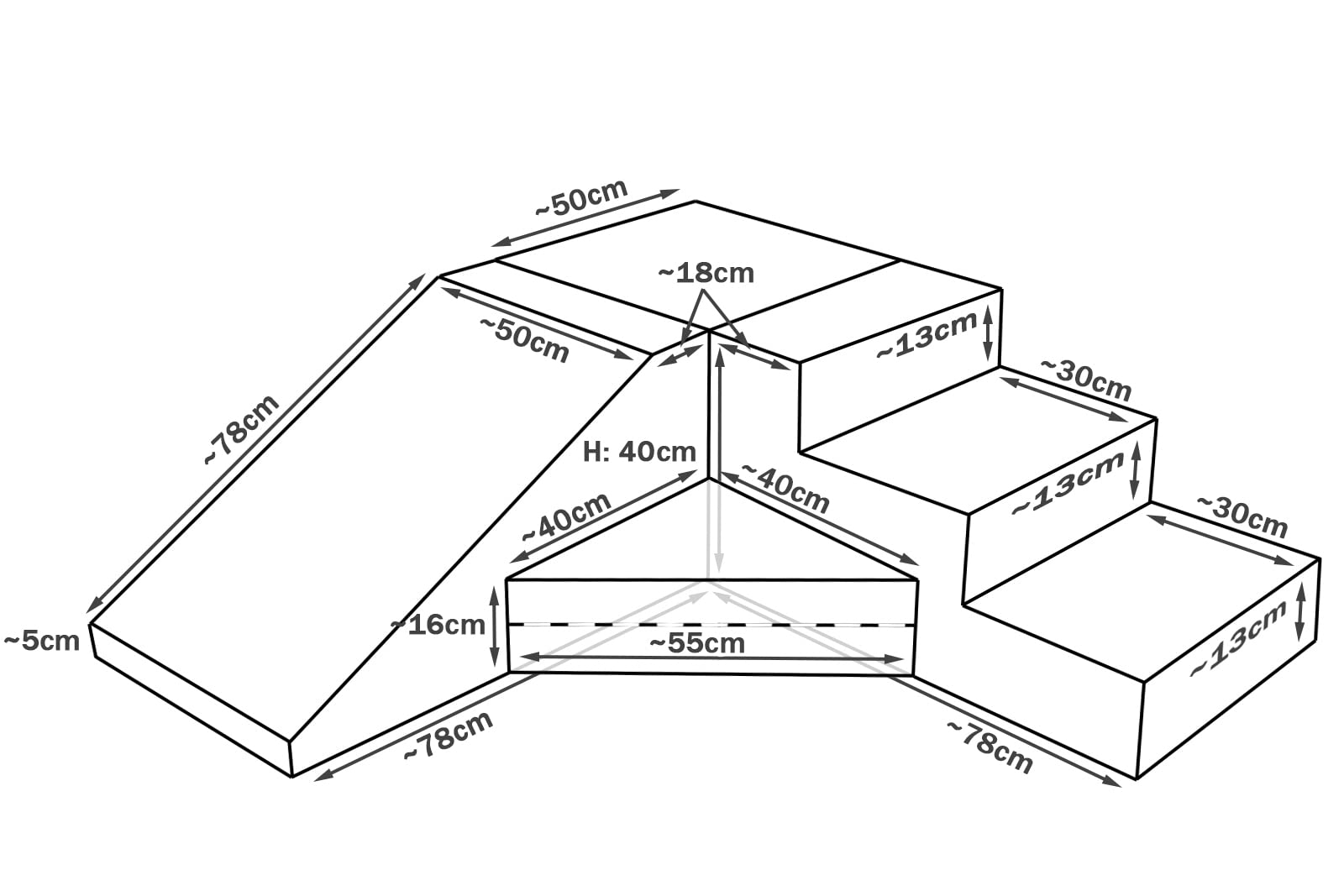 ["The building block set "Slide" consists of four colorful foam blocks.","The large blocks are ideal for cribs, kindergartens, inclusive and therapeutic facilities as well as movement and play areas.","All elements are soft and safe.","The blocks not only encourage movement and climbing or playing, but they can also be used as a seating area.","The core of the building blocks consists of stable and hygienic PUR foam (quality RG 21) with high dimensional stability."]