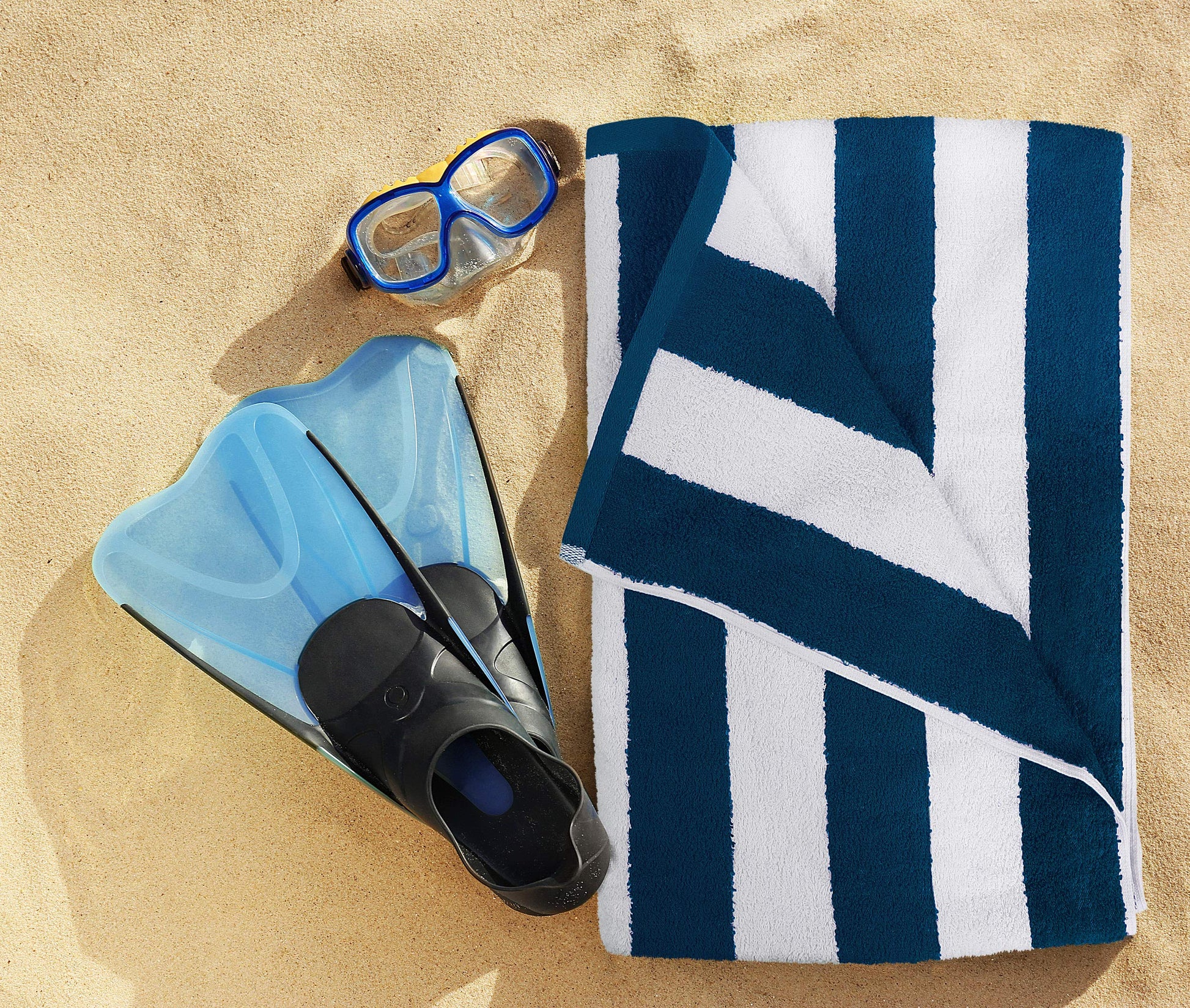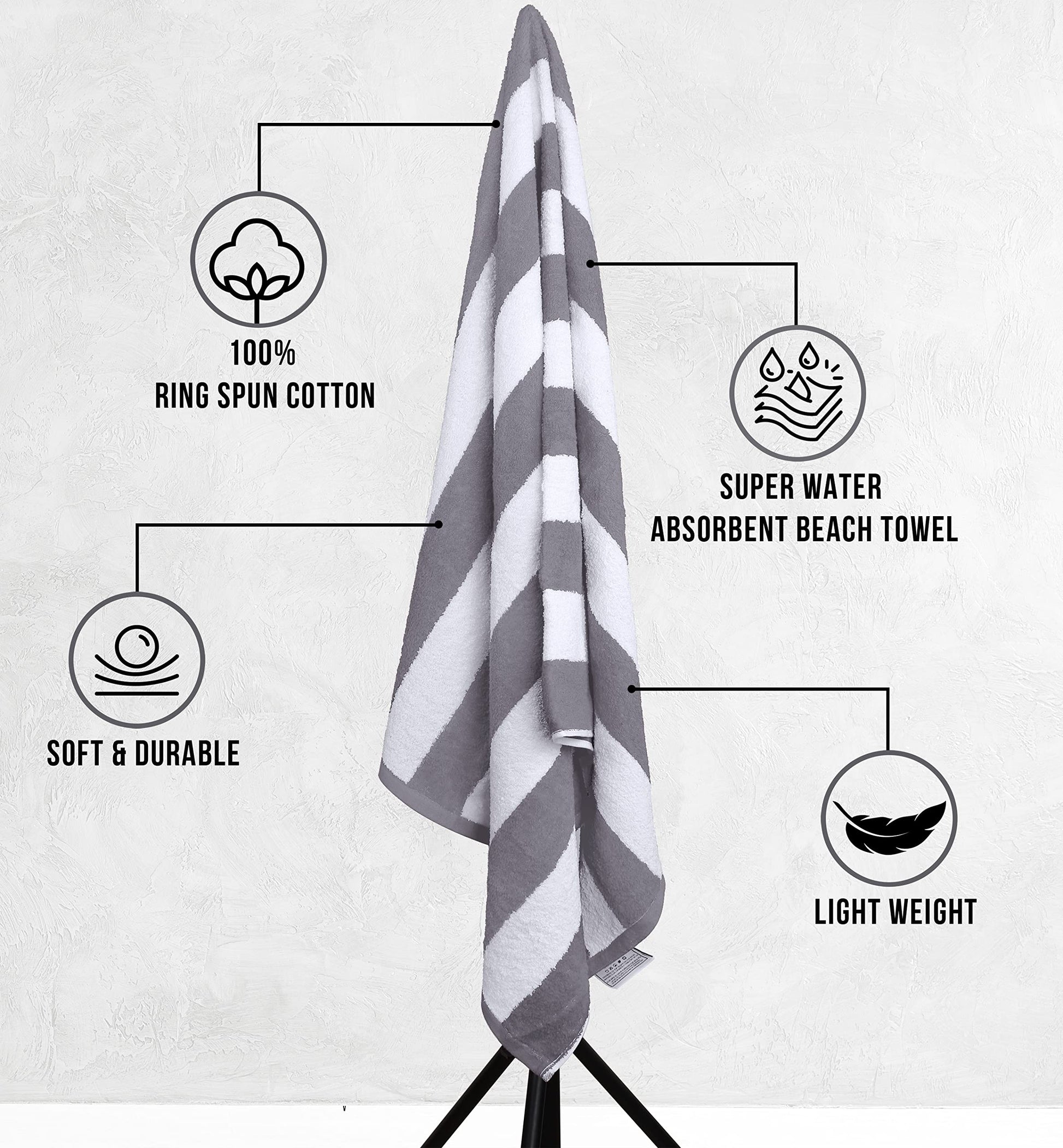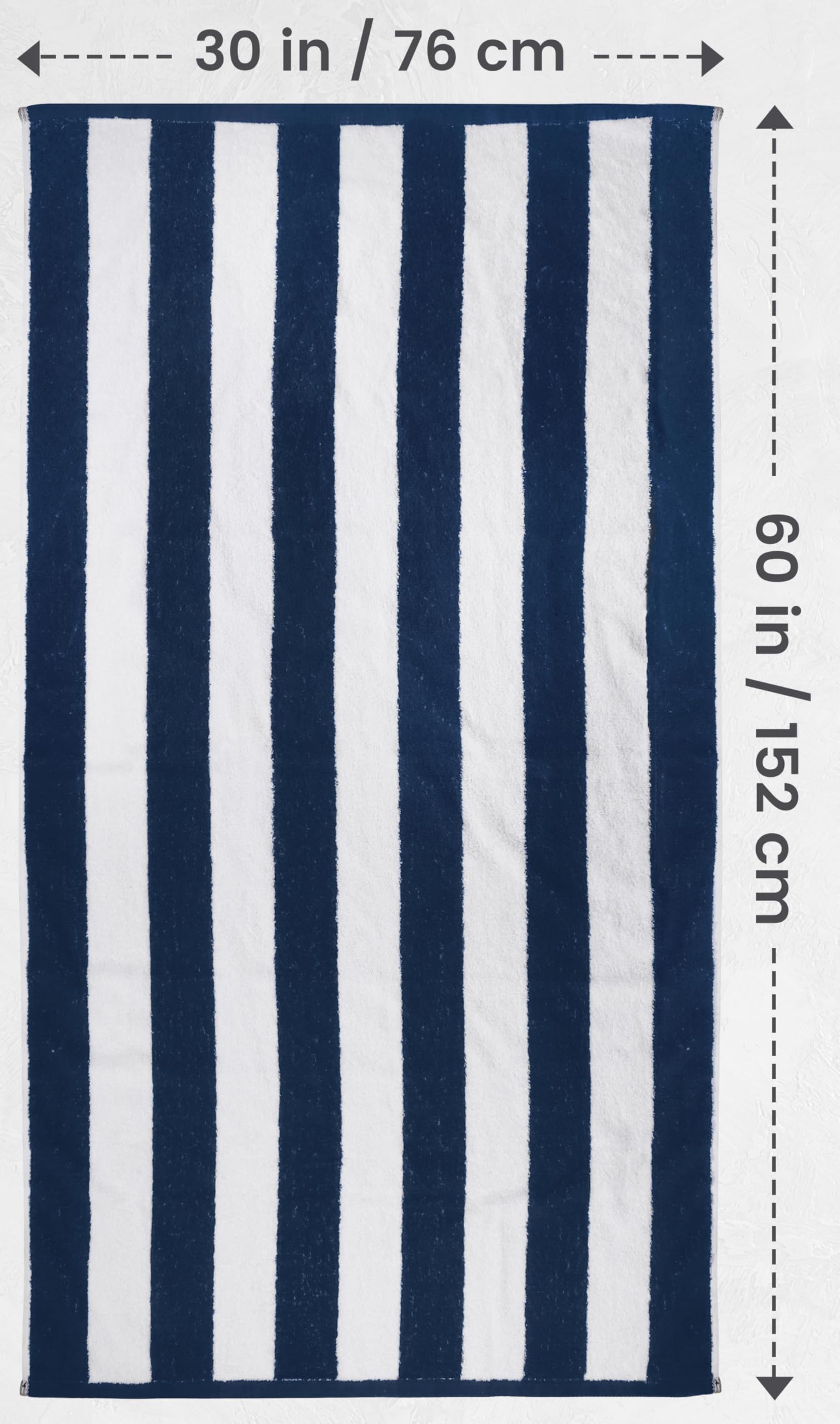 ["Do not use bleach, fabric softener, and iron as it can affect the quality; always wash towels separately to avoid lint.","The set includes four large beach towels in Cabana stripe measuring 30 x 60 inches each.","Made from 100% ring-spun cotton","Machine wash towels in warm water with mild detergent and dry on low heat; it is recommended to dry immediately to minimize mildew.","Highly absorbent yet lightweight. Gives the body a soft and delicate touch while absorbing moisture."]