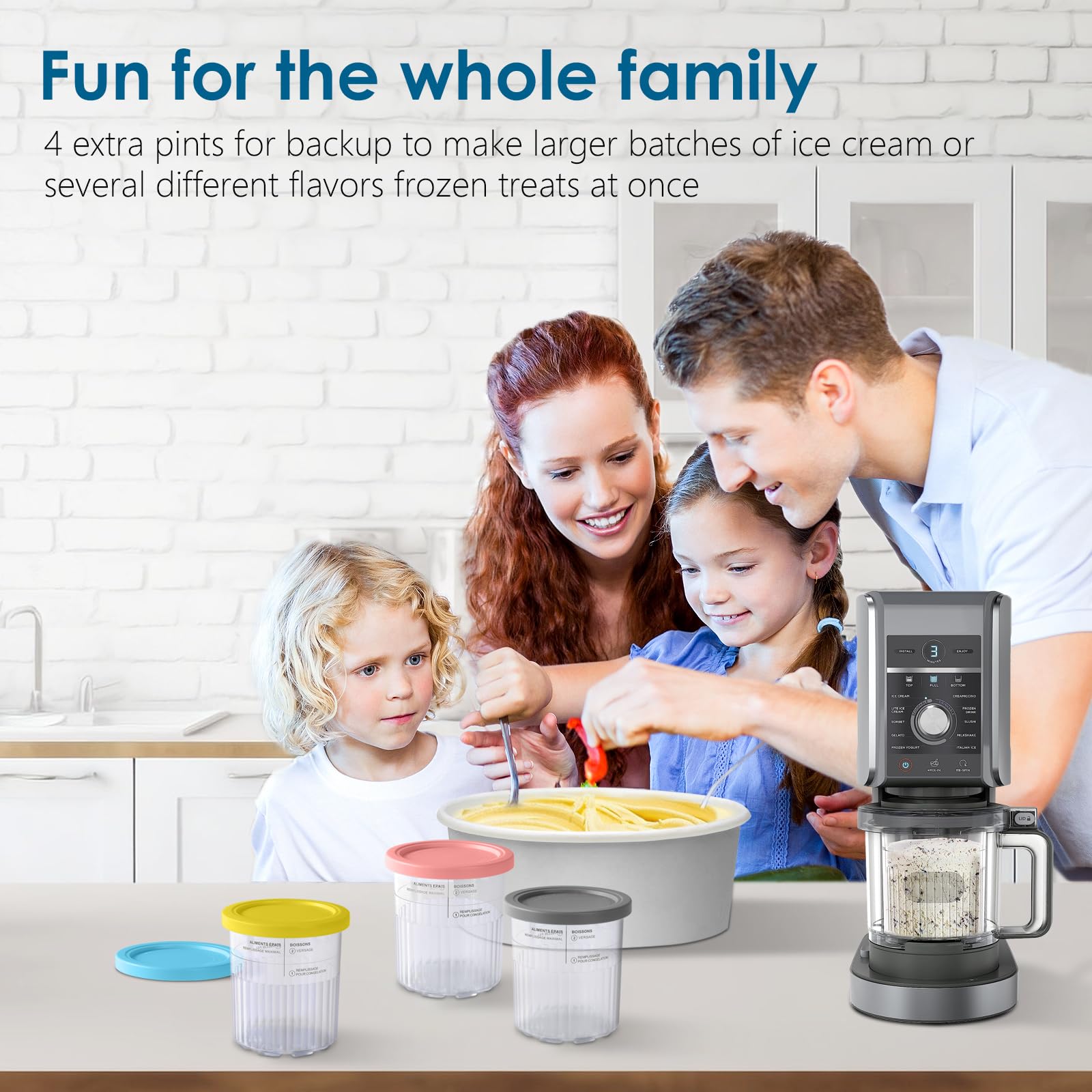 "PACKAGING: The package includes 4 pint glasses with colored lids for Ninja Creami Deluxe. Use the 4 additional ice cream containers to store all CREAMi Deluxe frozen treats such as ice cream, sorbets, frozen drinks, slushies, etc. The package contains 4 pint glasses with colored lids for Ninja Creami Deluxe."