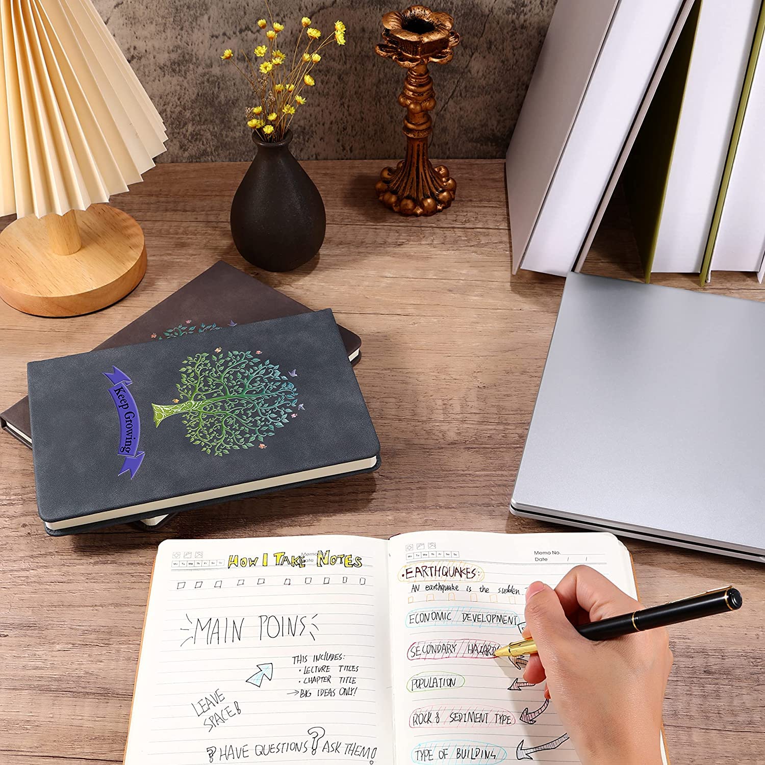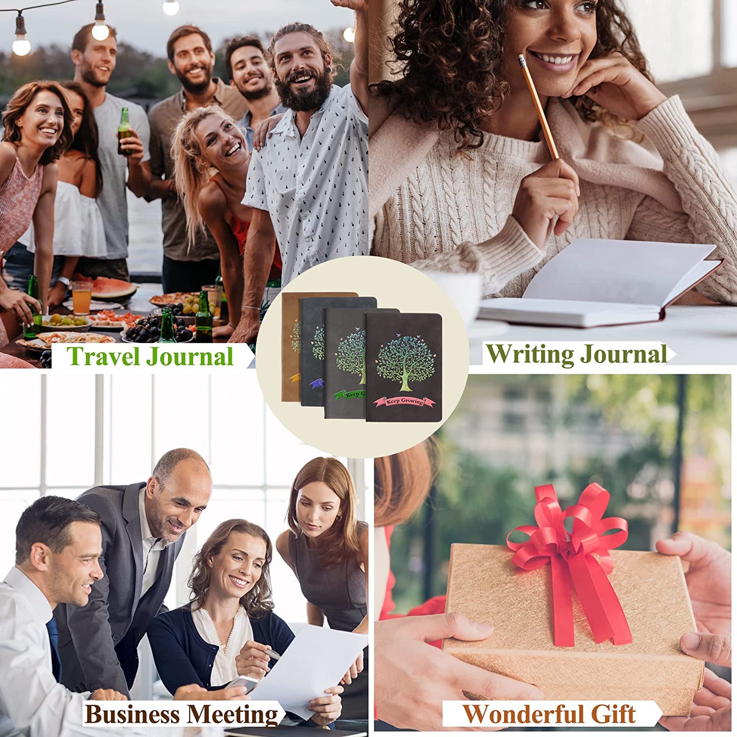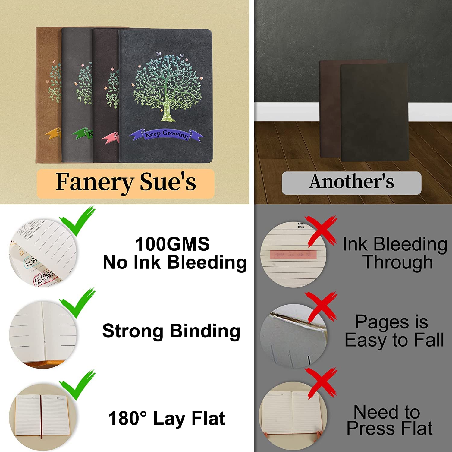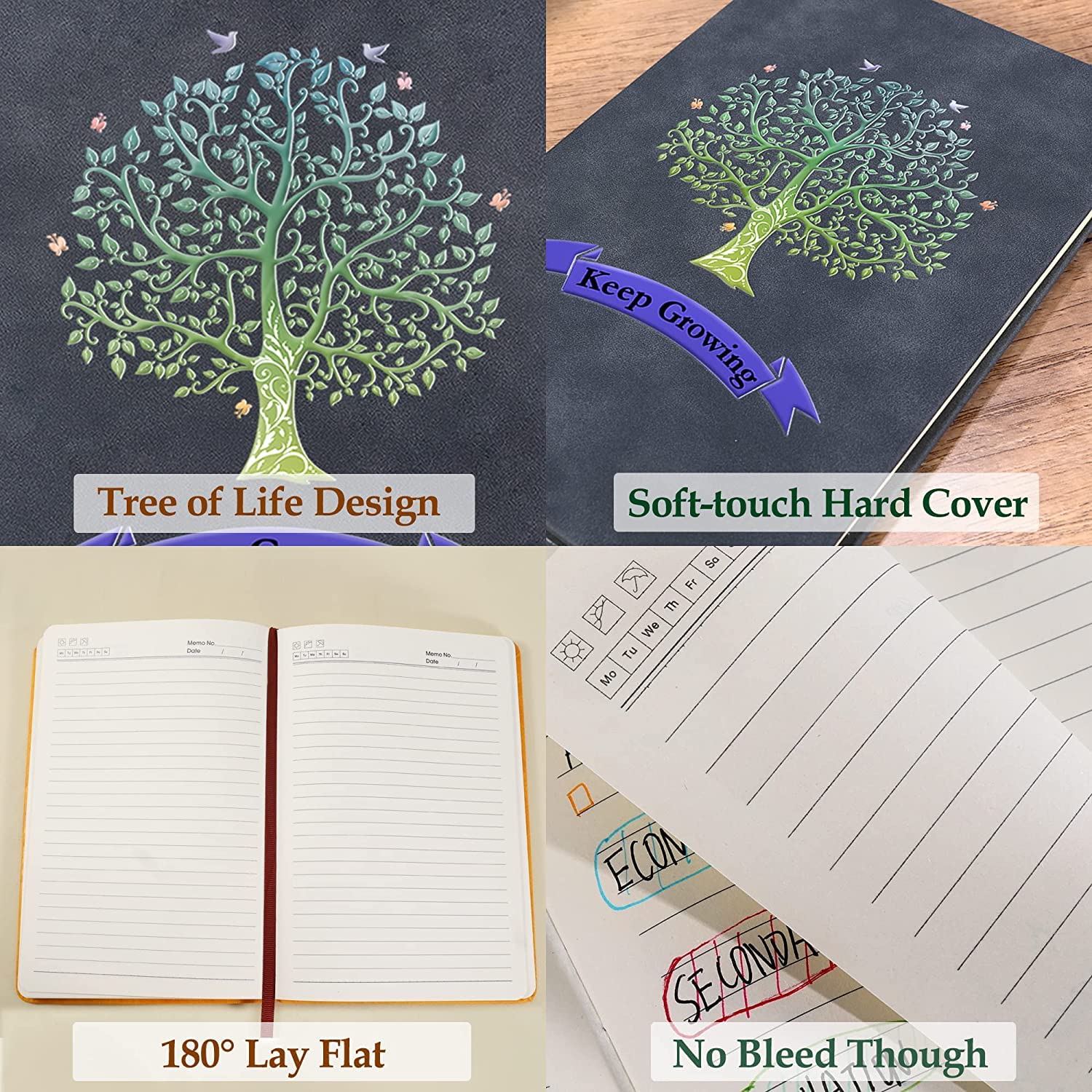 ["STYLISH AND QUALITY JOURNAL - These classic notebooks with wide ruling, a stylish writing journal, high-quality books at a surprisingly competitive price and quality. The best choice for daily use, offering plenty of space for notes, lists, and more. The classic Tree of Life artwork is a sight to behold. The stitched binding lays flat without assistance, and a colorful bookmark keeps your place.","180° lay-flat, large lined notebook - makes reading easier and efficient note-taking. Large 8.3 x 5.8 inch laptop case. The lined A5 notebook allows you to handwrite without distraction. Perfect as a travel journal, business notebook, teenage diary, back-to-school gift. Let your creativity flow more freely on the large lined notebook.","200 PAGE THICK PAPER - High-quality thick lined paper. Prevents ink bleed-through. Light yellow paper can protect your eyesight. Wide lined papers are perfect for various pens and fonts. The lined notebook gives you a good writing experience.","TOUGH FAUX LEATHER COVER - The matte finish of the faux leather exterior feels good in hand. The fashionable yet durable cover adapts to the body's movements without damage. Hardcover made of high-quality PU leather. Make it easier and more efficient to read while taking notes.","PAGES DO NOT FALL OUT - Exquisite binding provides security and durability. The pages will never fall out. The soft faux leather cover is printed with the Tree of Life and "Keep Growing." The Tree of Life symbolizes life, grace, and peace. It can bring opportunities for change, serenity, and clarity."]