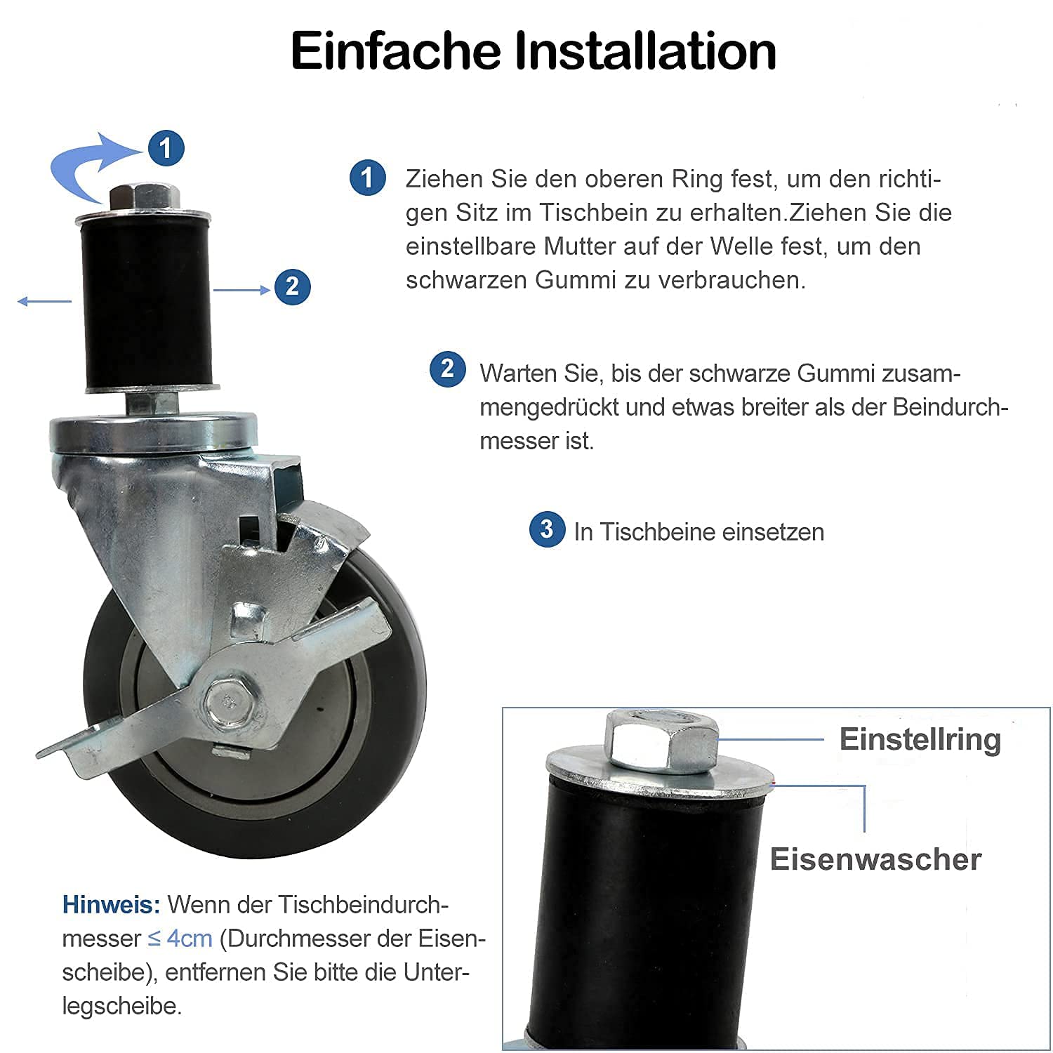 Leicht zu Montieren : Wählen Sie, ob Sie die Unterlegscheibe entsprechend dem Durchmesser des Tischbeins entfernen möchten. Ziehen Sie den Einstellring an der Oberseite jeder Rolle fest, bis sich der Gummi leicht ausdehnt.Schieben Sie die Räder in das Tischbein