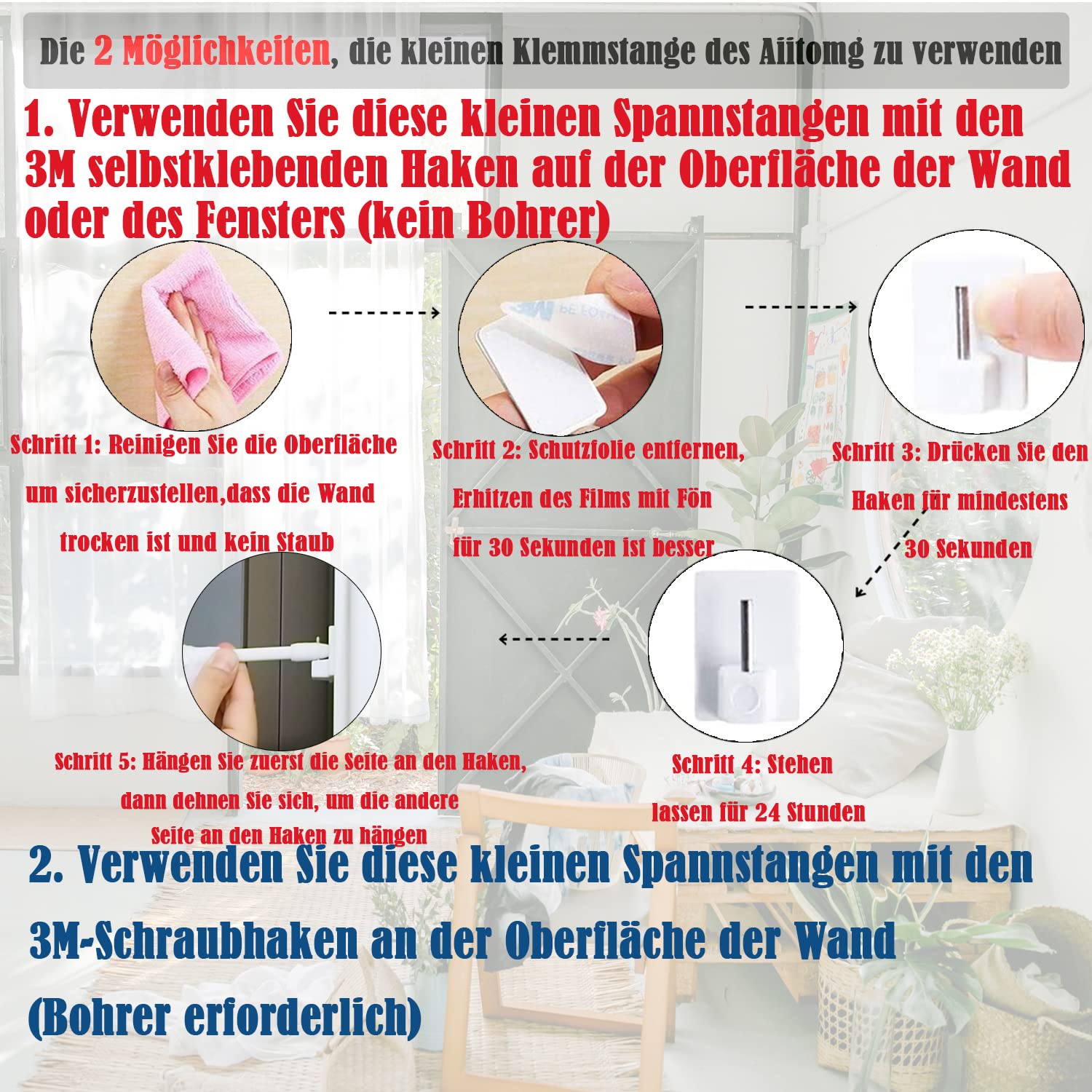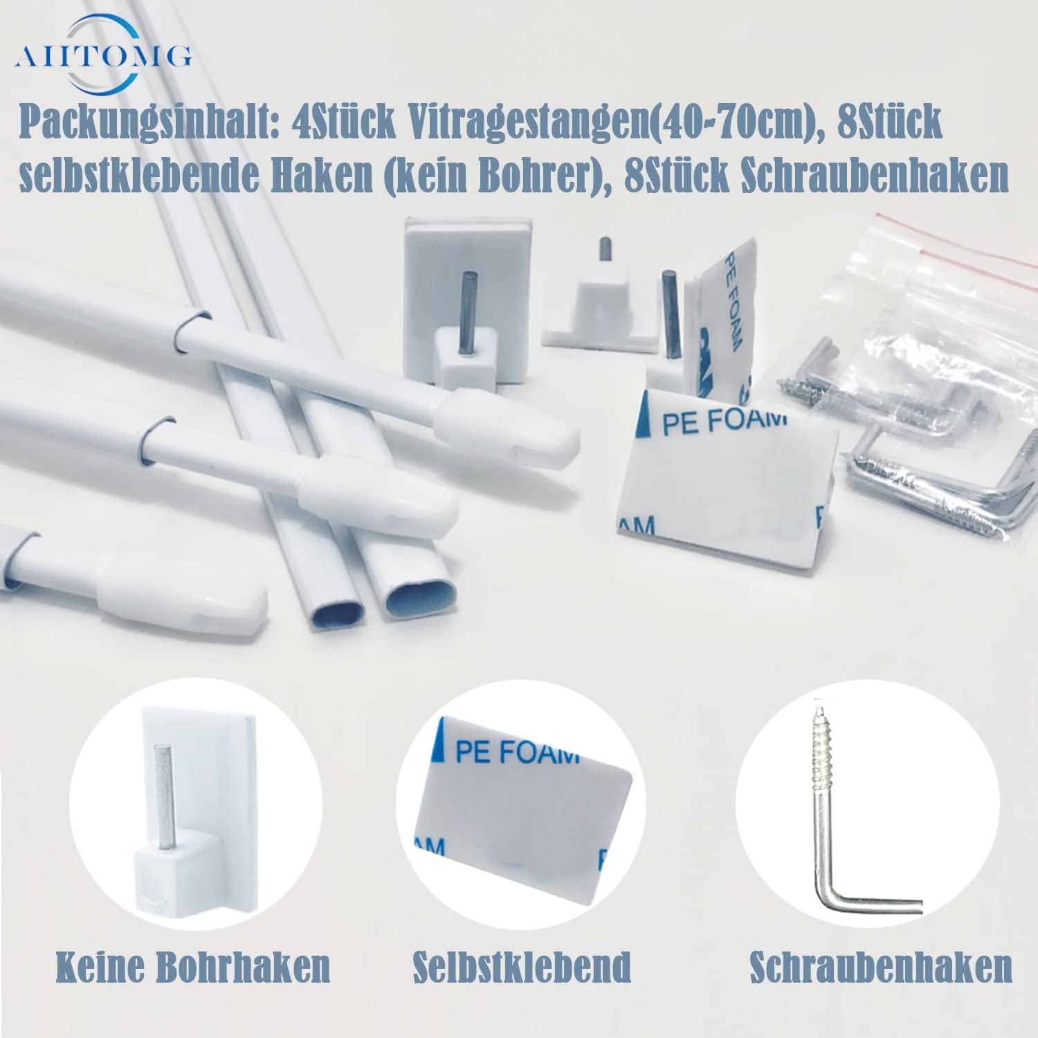 ["【2 Ways to Use the Small Tension Rods】A. Use these small tension rods with the self-adhesive hooks on the surface of the wall or window (no drilling required, maximum load capacity: 600g). B. Use these small tension rods with the screw hooks on the surface of the wall (drilling required, load capacity: 1200g)","【Package Contents:】4 pieces of tension rods (40-70cm), 8 self-adhesive hooks (no drilling required), 8 screw hooks","【Easy to Use, No Spring, Extendable and Lightweight】The extendable curtain rod is very durable, lightweight, and stable. Refer to the installation diagram in the left photo gallery for installation instructions. Please make sure to install according to the instructions provided and use the weight of the net curtain to not exceed the weight limit.","【Many Applications】These adjustable curtain rods can be used for all kinds of occasions at home, in the office, in hotels, gardens, etc. You can use them for many sizes of net curtains, closets, and more.","【Services】If you encounter any issues with the extendable curtain rod and the gifts, feel free to contact us. We will do our best to assist you (provide a replacement product or refund for you)"]