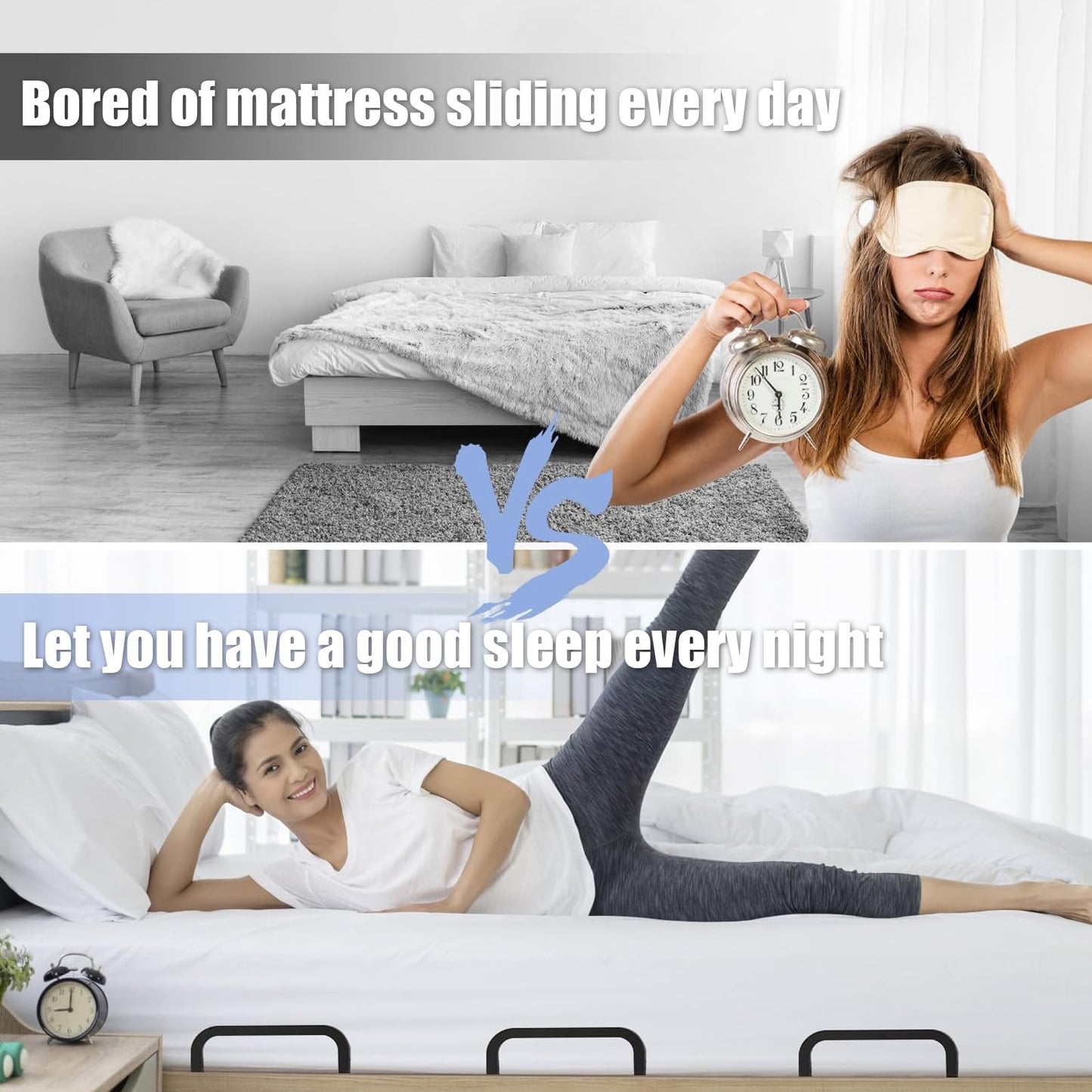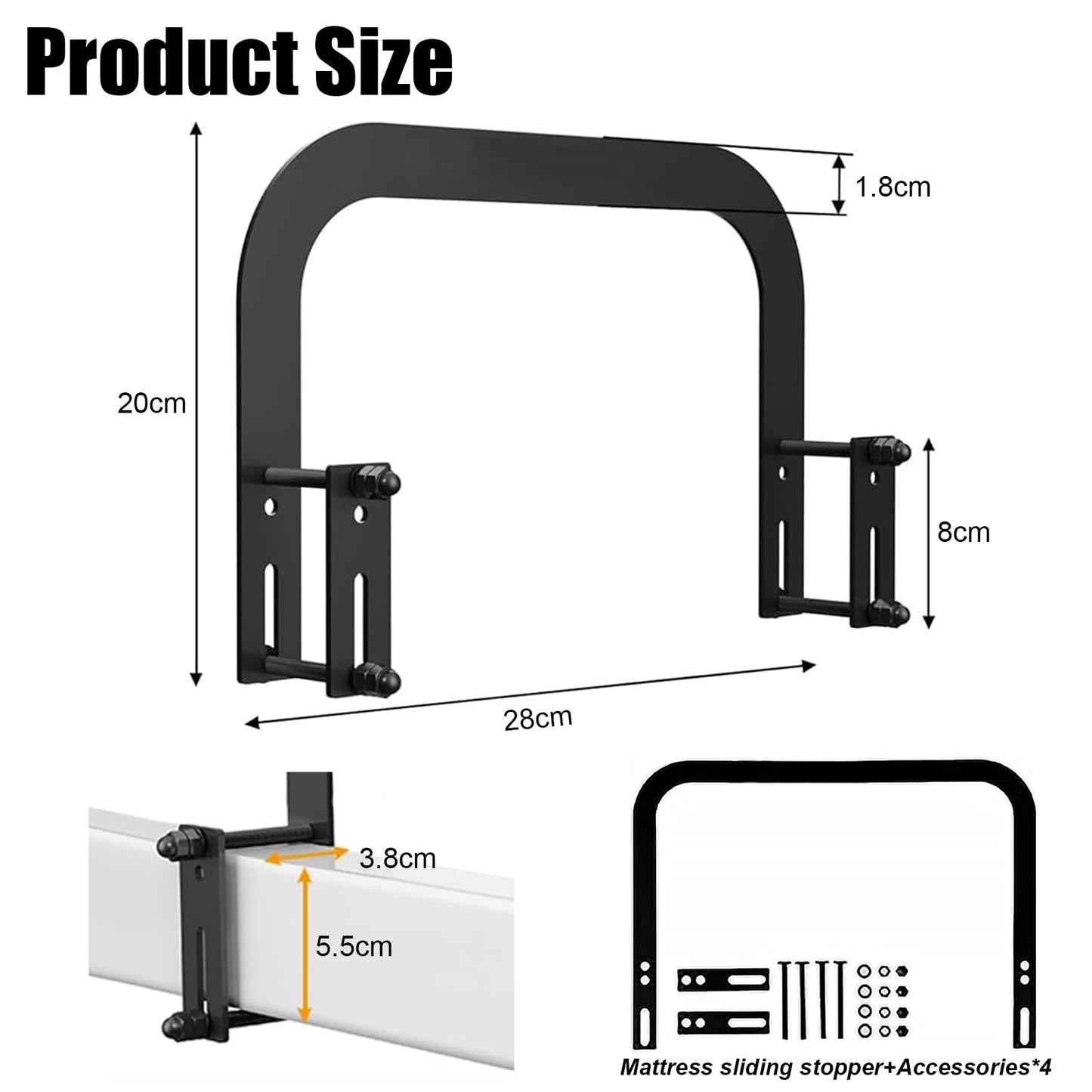["Adjustable Mattress Stabilizers"] Our non-slip mattress holder features an adjustable design that can clamp onto bed frames up to a maximum width of 1.5 inches and a maximum height of 2.2 inches. This makes it the ideal solution to ensure stability on a variety of mattress sizes.