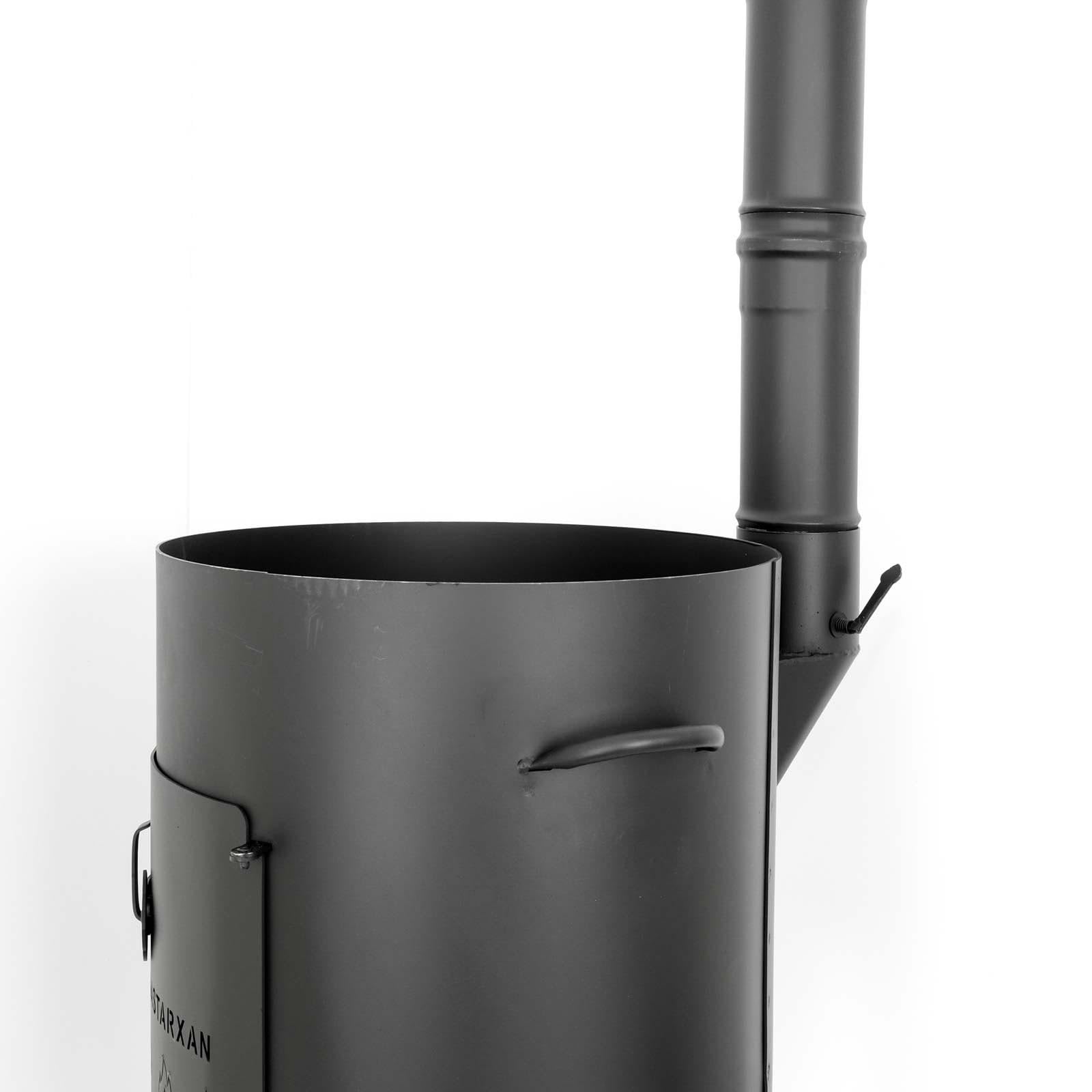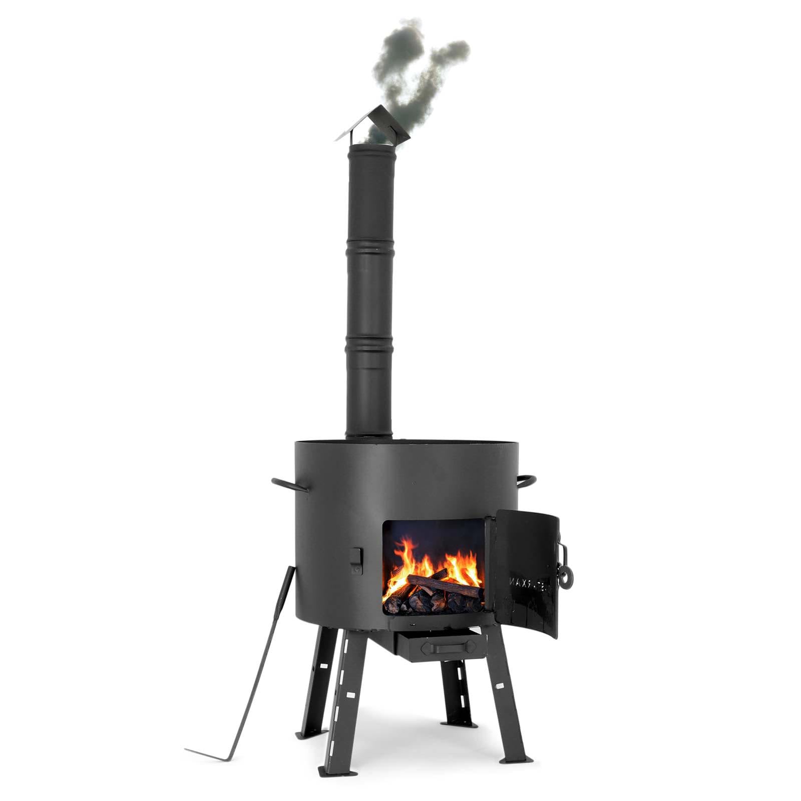 41cm fire pit made of 2mm steel with flu pipe. Outdoor kitchen with 12L pot and flat-bottomed kazan. Ideal for camping and cooking outdoors with ladle, soup ladle, and grill grate.