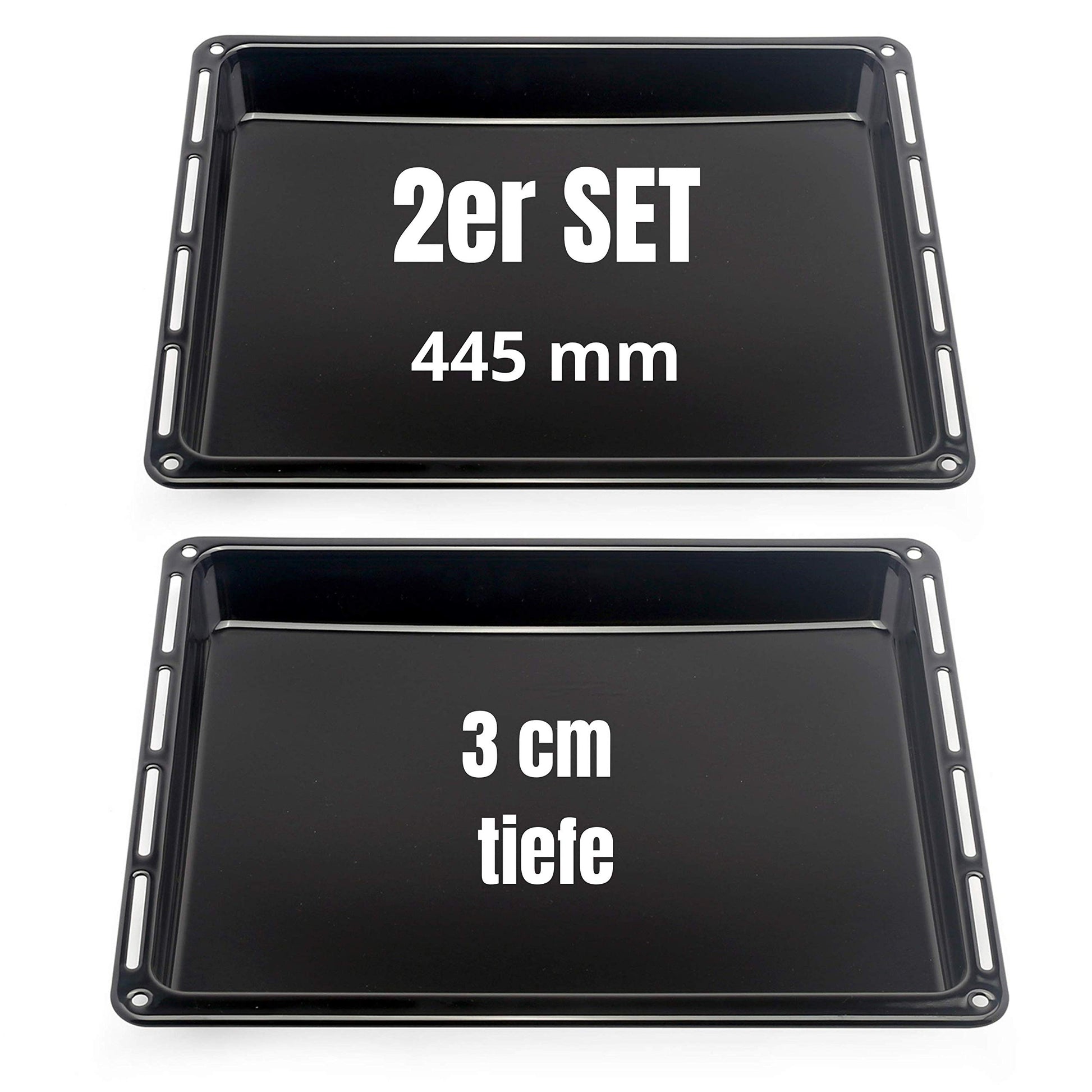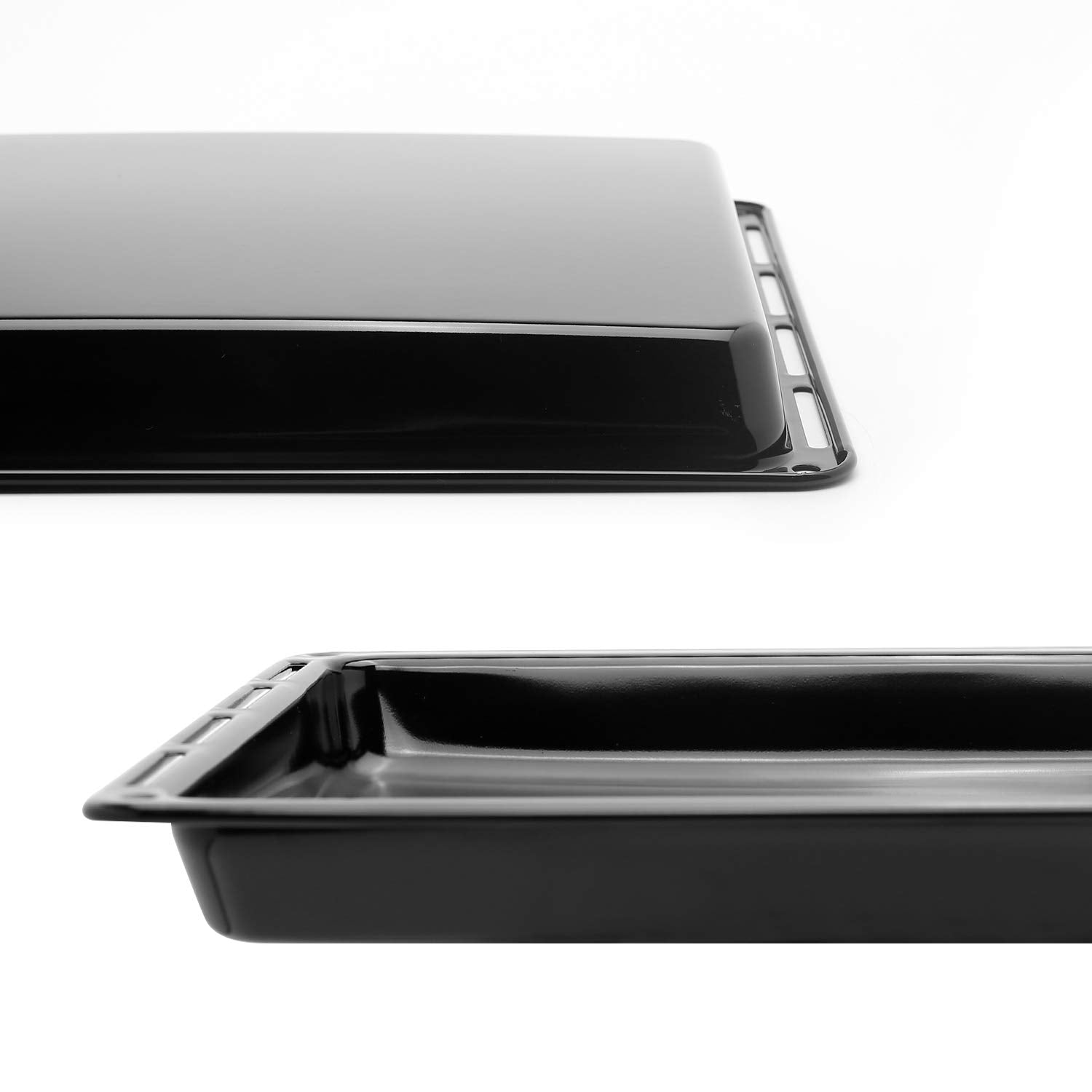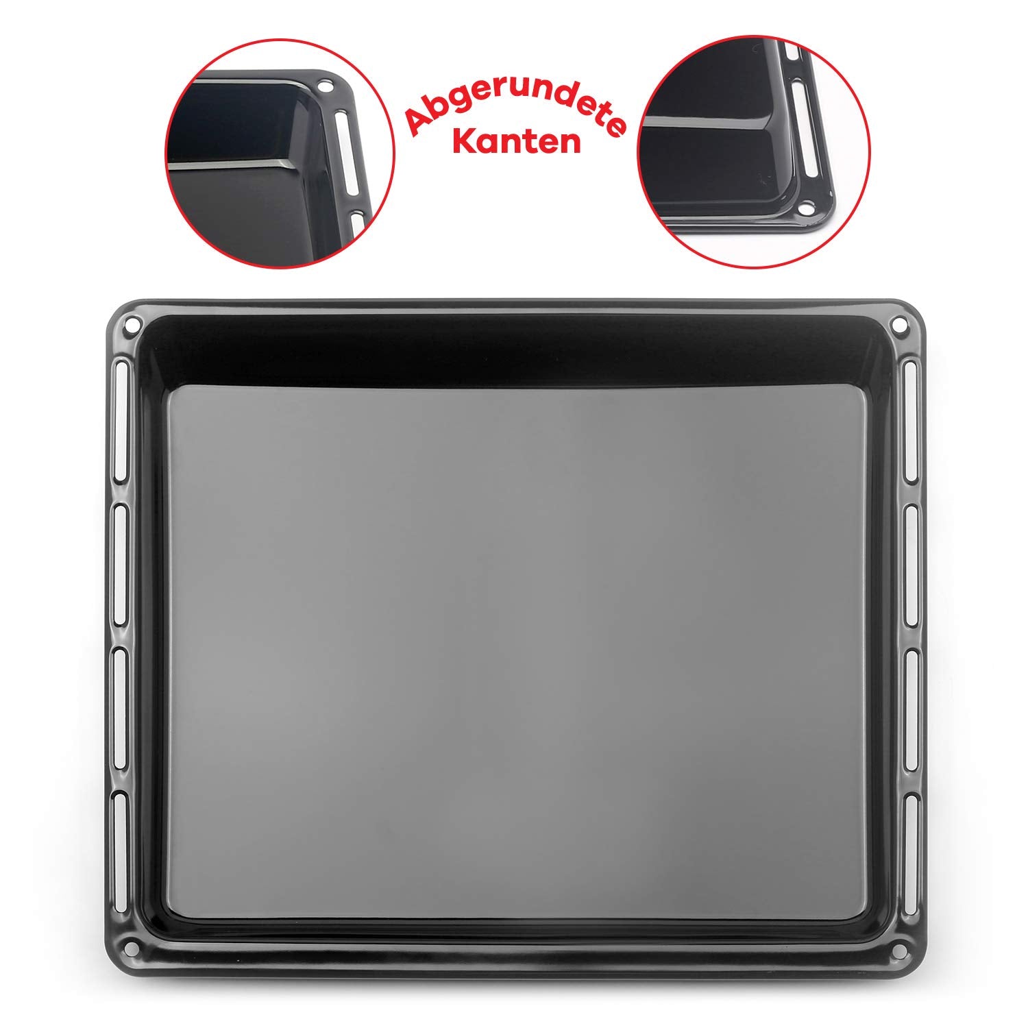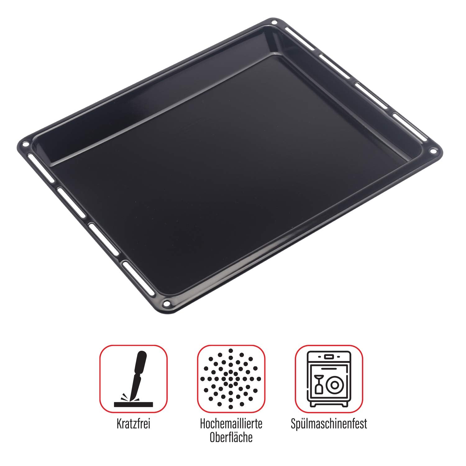["🌳Highly enameled, rustproof, can be cut directly on the sheet; scratch-resistant. Enameled sheets are much more durable and easier to care for than non-stick ones. Cleaning is done with a simple sponge and common detergent but also dishwasher safe. Due to the high-enameled material, you will use this sheet for a very, very long time.", "🏭 SUITABLE FOR MANUFACTURERS: Bauknecht, Ikea, Whirlpool, Indesit, Neckermann, Lloyds, Quelle, Privileg and Matura.", "↔️ DIMENSIONS 44.5 x 37.5 x 3 cm. For stoves and ovens with baking trolleys and smooth baking ovens. Color anthracite black.", "🍽️ENAMELED GREASE PAN AND BAKING SHEET suitable for all kinds of baked goods such as cake, cookie, muffin, cookie, bread and rolls, sweet bread and stollen but also roasting meat. High side areas are ideal for preparing a roast, as the dripping roast juice cannot overflow.", "💯 EVEN HEAT DISTRIBUTION due to high-enameled surface, high-quality workmanship, extremely heat-resistant, non-stick effect, high quality, very good value for money. IMPORTANT: unfortunately there are no standard sizes for baking sheets. Please ask us before your purchase if the baking sheet is suitable for your oven. You can also measure your existing baking sheet. Best regards."]