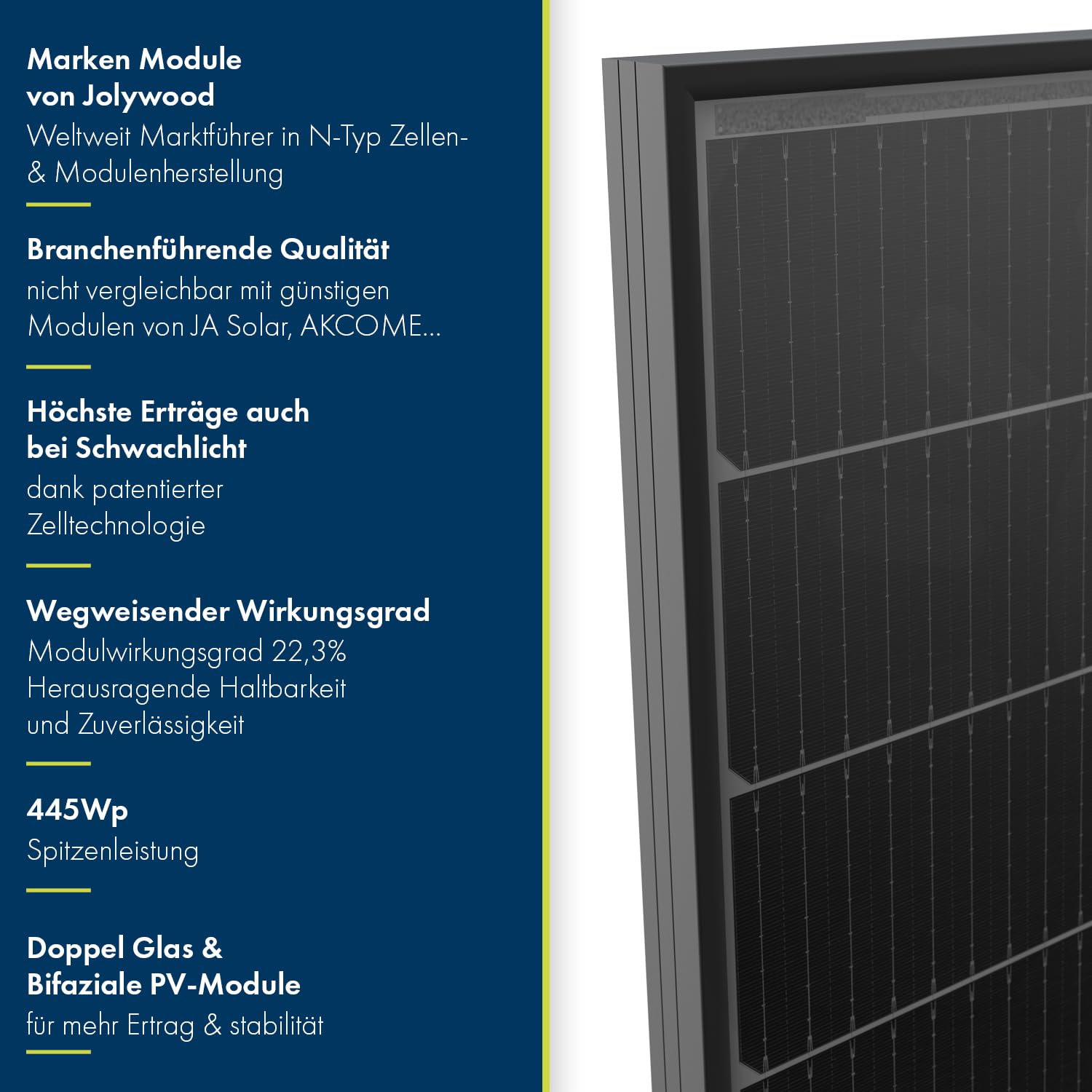 ["Low price. Great performance! The Plug&Play Mini-PV system consists of high-performance modules totaling 445Wp.", "Premium modules offer high yield even in cloudy conditions and winter thanks to exclusive cell technology and bifacial sunlight absorption - VDE relay integrated, certified and approved for Germany", "Excellent performance with cloud cover: High performance even on cloudy days. Maximum module efficiency: 22.3%", "25-year warranty & 30-year linear performance guarantee - The manufacturer promises linear performance for up to 30 years after purchase.", "Versatile for installation: Whether as balcony solar systems, balcony solar system storage systems in combination with the SPAUN Energy Master, stand-alone systems or on rooftops, this PV module offers a variety of installation options."]