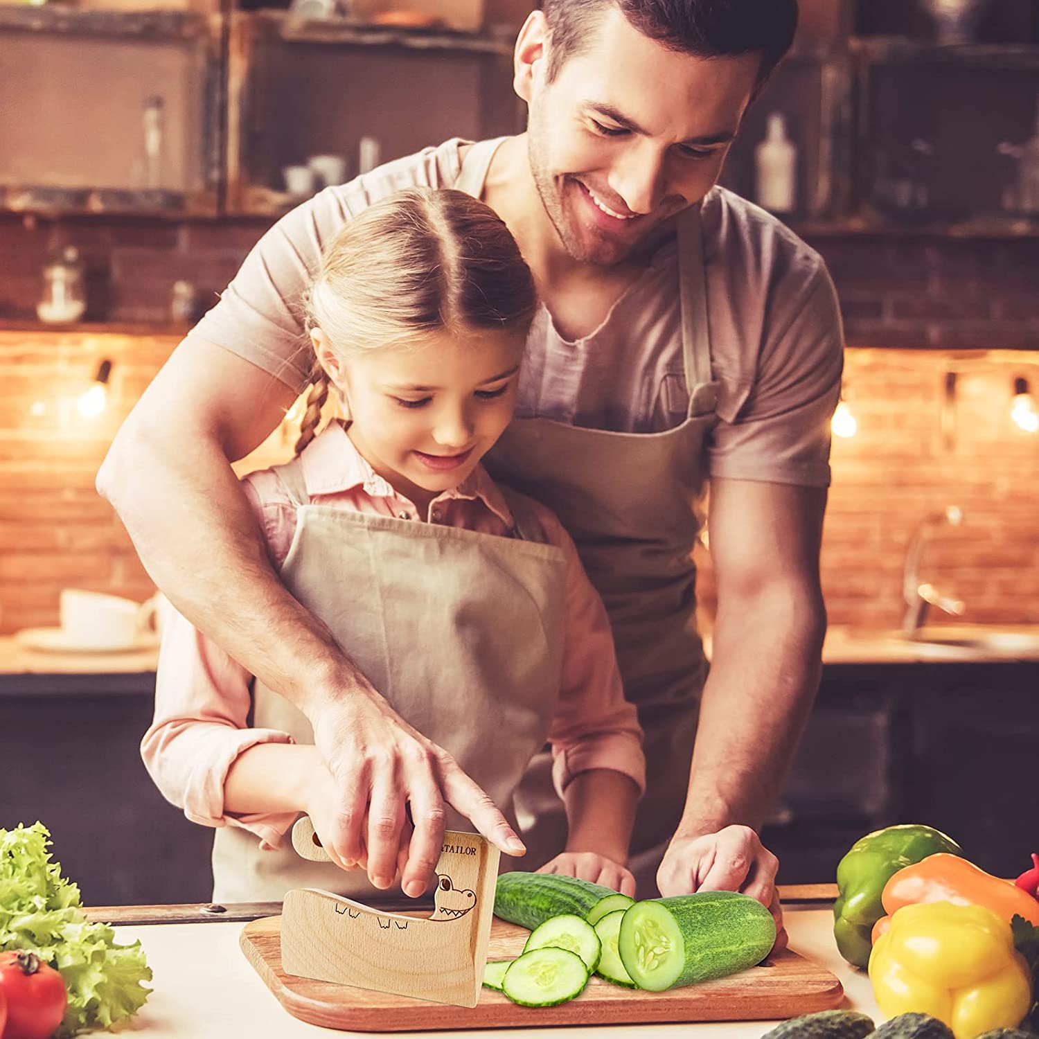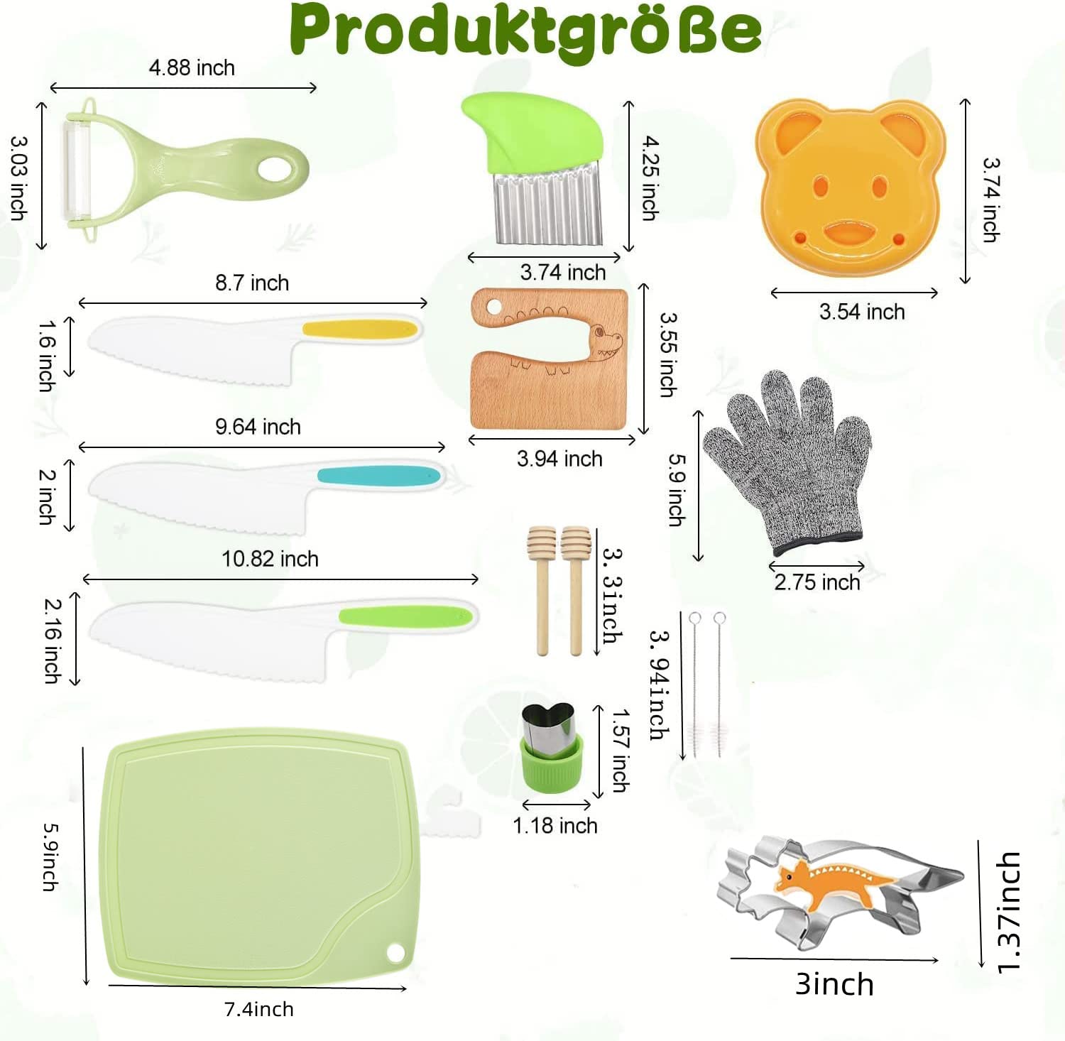 "Included in the package: You will receive 1 wooden child's knife, 8 dinosaur cookie cutters, 1 bear sandwich cutter, 3 child's knives with serrated edges in different sizes/colors, 1 child's kitchen glove, 1 potato cutter knife, 6 fruit cutter shapes, 1 Y-peeler, 1 cutting board, 20 fruit fork accessories (random fruit fork color) and 2 cleaning brushes. Perfect Gift: This child's knife and sandwich cutter set is a great gift for kids for birthdays or holidays, with its exquisite packaging. Safe for Kids: Specifically designed for toddlers, this set is easy to use and cannot cut the skin. Montessori kitchen tools allow children to participate in family dinner cooking. They can choose their favorite fillings and make delicious sandwiches to their taste. Scope of application: The toddler knife can cut bread, butter, vegetables, fruits and more. The sandwich set can add different fillings to make sealed sandwiches with different flavors, such as vegetables, fruits, butter, cheese, bacon, chocolate, etc. The sandwich shapes can also be used to make sandwiches and cookies. Full guarantee: If you are not satisfied with your purchase, just let us know and you will receive a FULL refund or replacement."