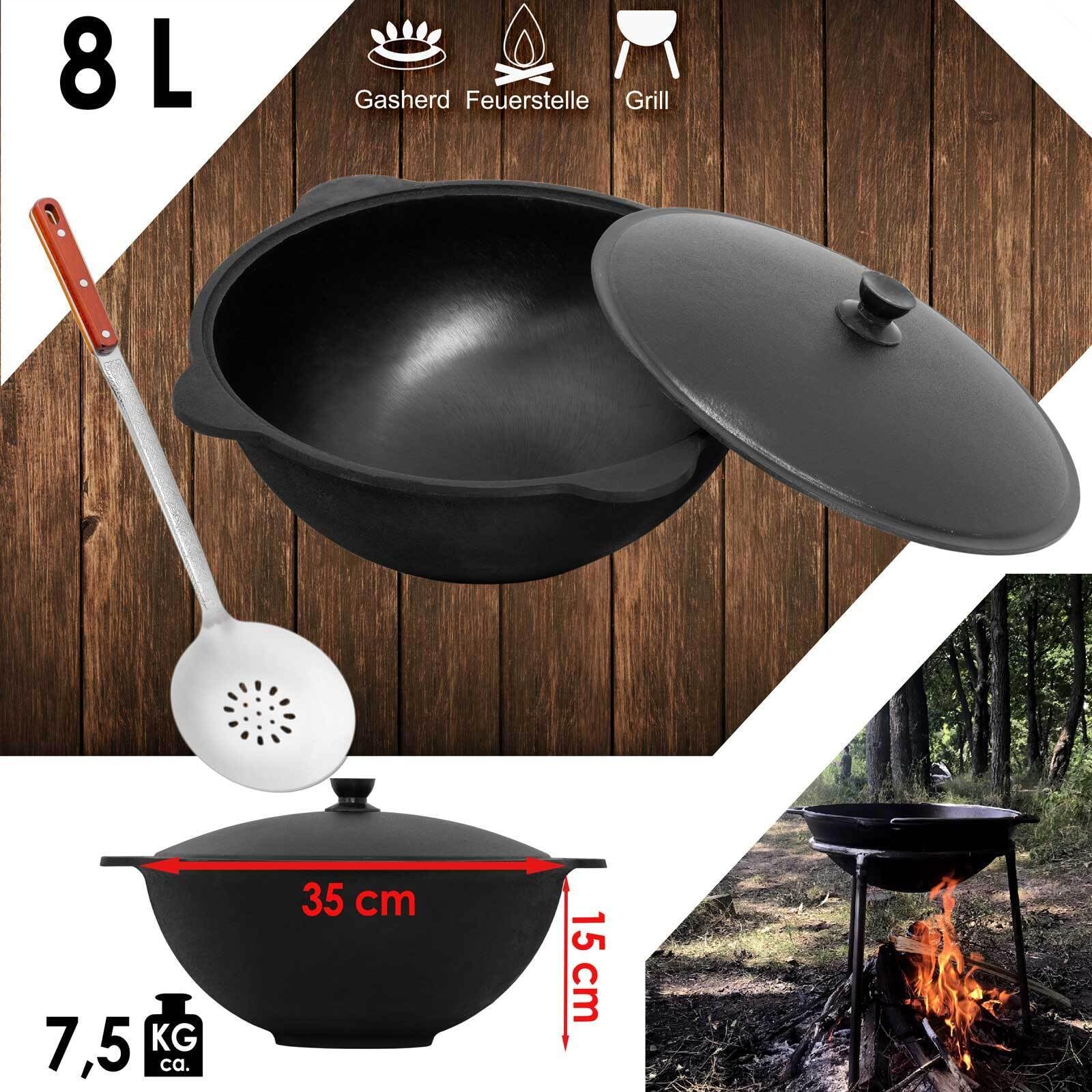 4BIG.fun Kazan 8 L made of cast iron with ladle NAMANGAN Kazan Uzbek with lid Cast Iron Kettle Uzbek Camping Uzbek Wok Pan Asia Wok Pot with aluminum lid Grill Wok Cast Iron Pot Wok Pan