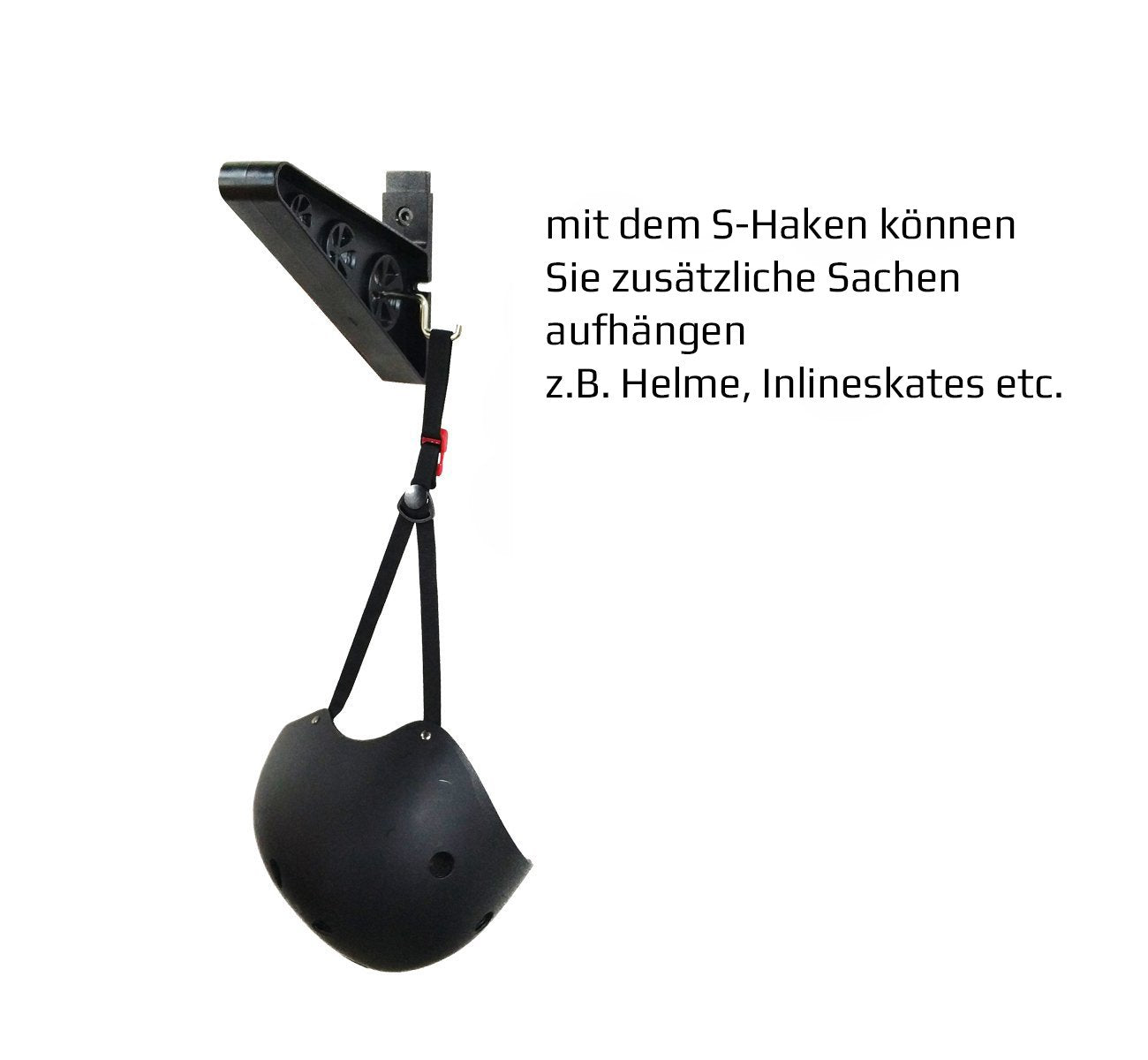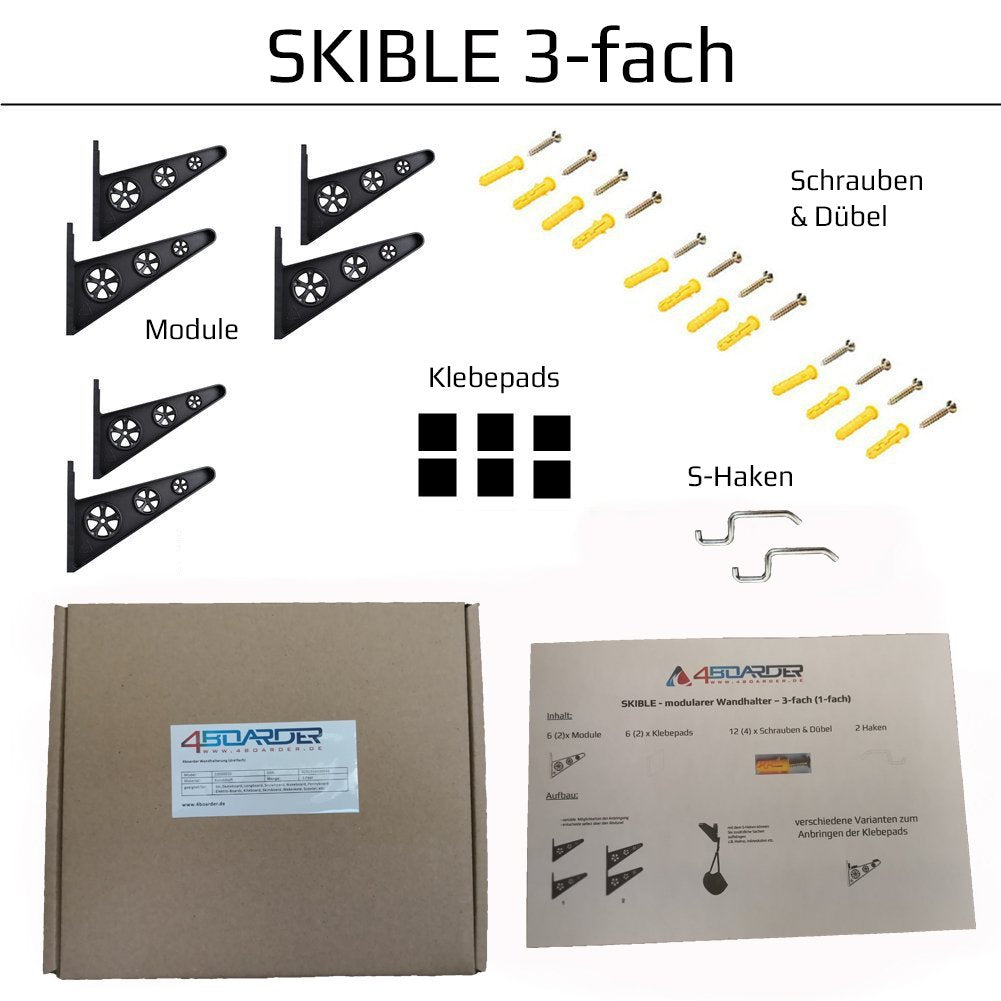 ["SKIBLE wall mount for longboard, skateboard, scooter, ski, wakeboard, snowboard, kiteboard, wakeskate, skimboard, pennyboard, e-skateboard, e-longboard, electric longboard, electric skateboard","Made of lightweight, durable, and sturdy ABS plastic","Modular system allows for 3 different adjustable heights and is expandable upwards/downwards","Width is individually adjustable, with short distance for skateboards or longer distance for SKI, for example","Includes: screws, dowels, adhesive pads for vertical board mounting (see image), and extra hooks for hanging helmets, etc."]