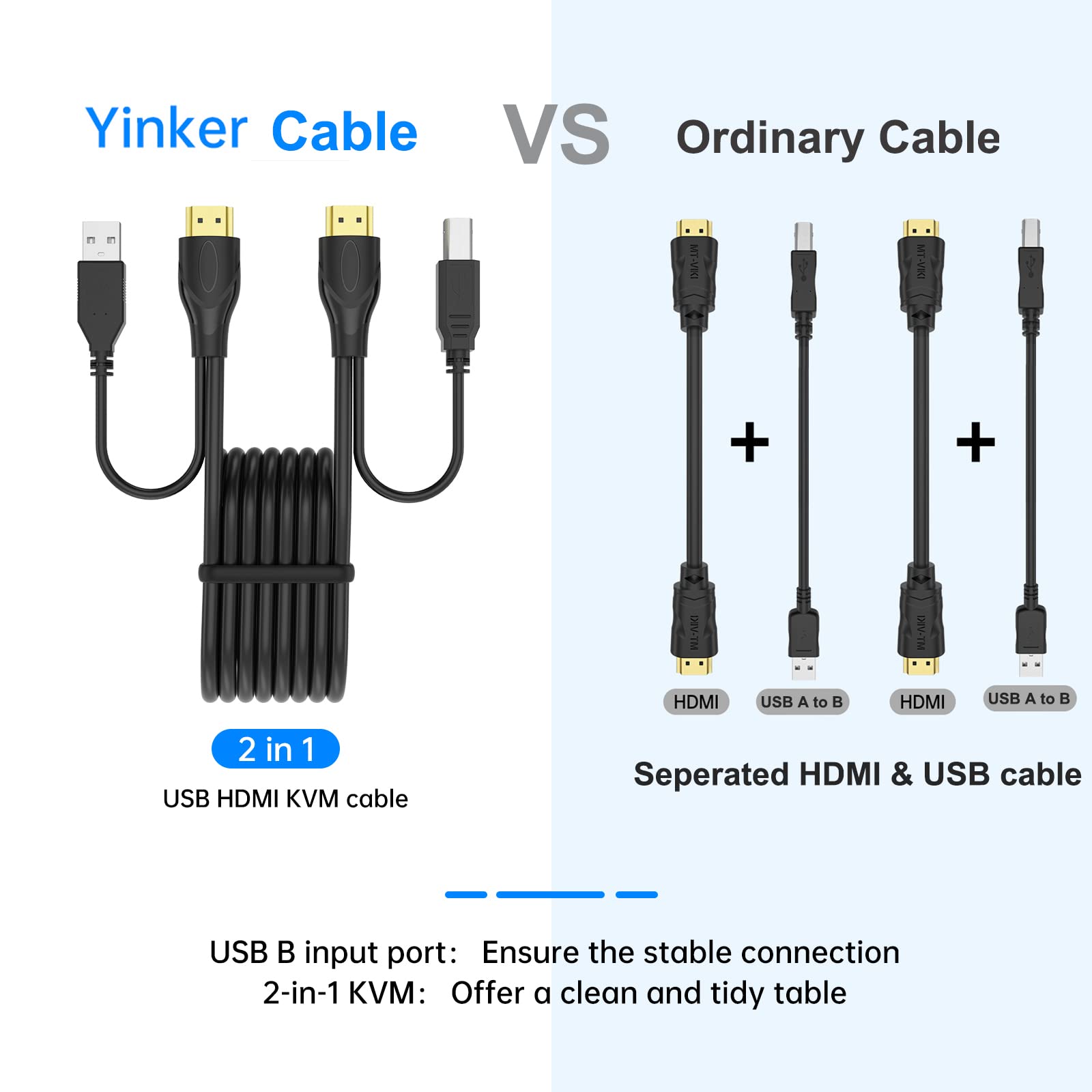 4K 60Hz HDMI KVM Switch 2 Port, Yinker HDMI KVM Switch 2 PC supports 2 computers with 1 monitor, keyboard, mouse, and 5V charging port. Includes 2xUSB A and USB B cables, and 4 USB ports.