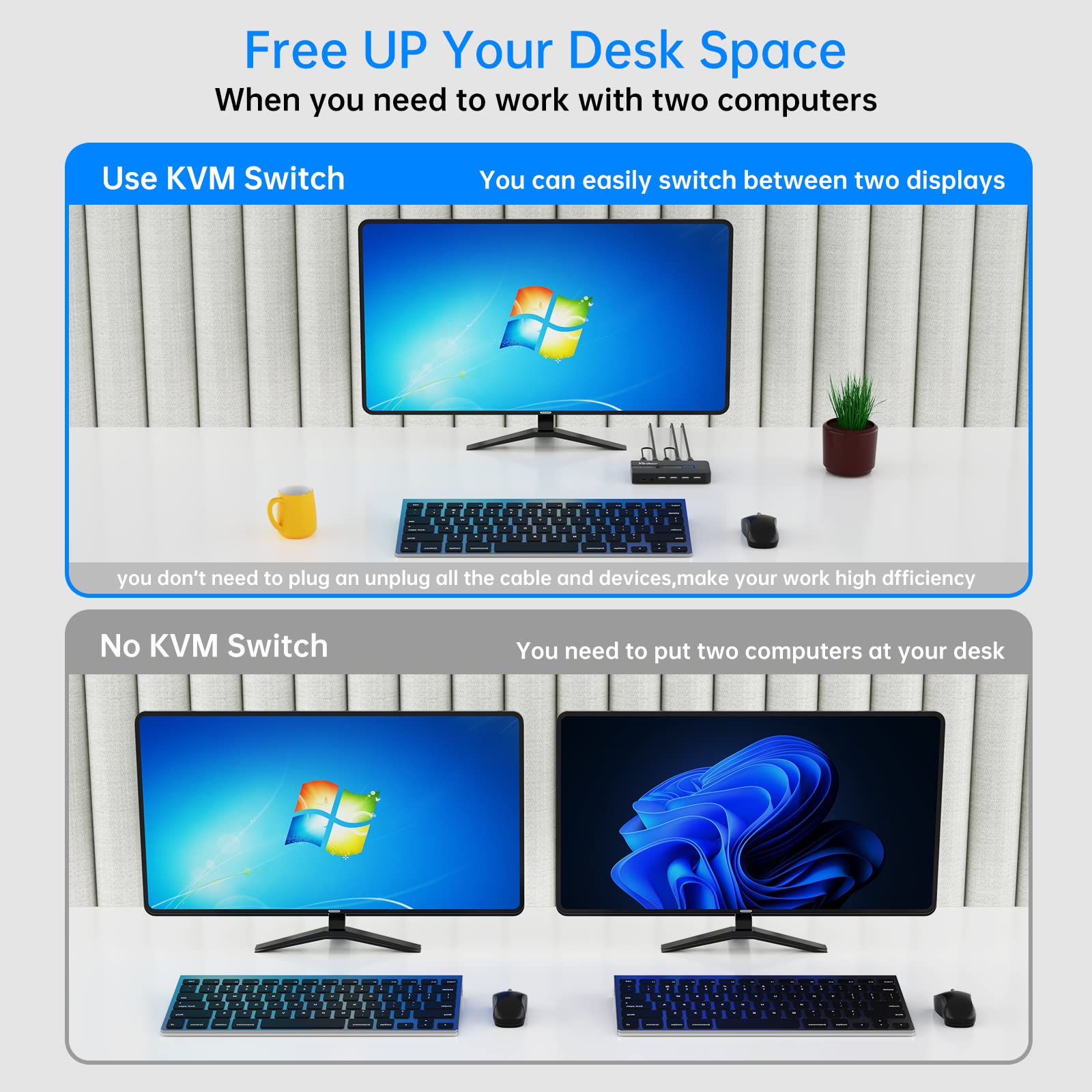 ["4K60Hz HDMI KVM Switch 2 PC supports 2 computers or servers sharing one monitor, keyboard, and mouse. It also has 4 USB ports. Compatible with most systems like Win, Mac.","Latest KVM Cable: 2 Port HDMI KVM Switch 2PC 1 monitor uses double 2 in 1 Pigtails, one is HDMI to USB A port, the other is HDMI to USB B port, minimizing cable clutter and preventing loose wires.","Signal Amplifier: KVM Switch 2 Port supports signal amplifier, HDMI cable within 3m can still output a stable image at 4K 60Hz. Switching time is around 4~6 seconds.","5V Charging Port: USB-C power supply port equipped with a power cable to prevent power shortage, leading to erratic signals. Even if a computer is turned off, the KVM switch can still be used as usual.","Ultra-HD 4K@60Hz Image Quality: HDMI KVM Switch supports up to 4K@60Hz for crystal clear, vibrant images, perfect for work, gaming, and multimedia. It is downward compatible with 4K@30Hz, 1080P@60Hz, etc., and works with various devices. For optimal 4K performance, use an HDMI 2.0 cable (shorter = more stable) and make sure your computer/monitor supports 4K. Perfect for home office, gaming setups – simplifies device management without loss of image quality."]