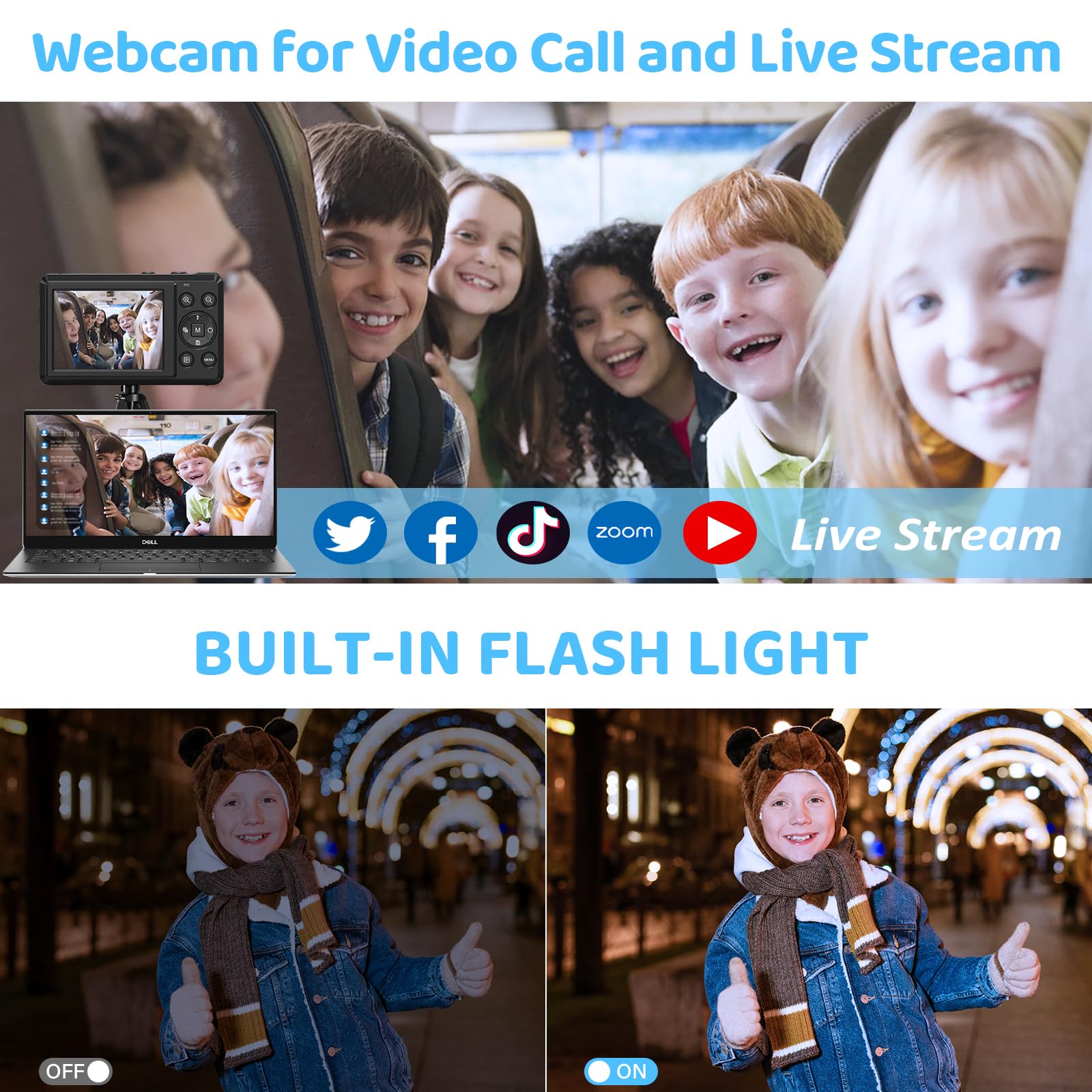 ["【FHD 4K Video and 64 MP Photo Resolution】 The compact camera uses a 13-megapixel CMOS IMX214 sensor with a maximum of 64 million pixels. The video resolution can reach up to 4K at 30 frames per second, allowing you to capture incredibly clear videos and photos.","【16x Digital Zoom and Flashlight】The digital camera for kids features a 2.4-inch TN screen and 16x digital zoom. While taking photos or videos, you can zoom in or out with the W/T button to capture detailed close-ups or distant objects. Additionally, the mini vintage camera has a built-in flash that can be adjusted with the flash button, allowing you to capture clear photos even in dark environments.","【Multifunctional Camera】 The pocket camera supports various functions such as self-timer, face recognition, burst mode, time-lapse recording, slow-motion recording, etc., all contributing to a better shooting experience. Additionally, the point-and-shoot camera has a built-in microphone and speaker, allowing you to capture crystal-clear sound while recording videos and play back your recordings with sound.","【Vlogging Camera as Webcam】 The digital camera can be used as a webcam by connecting it to the PC via a USB cable. This allows you to enjoy video calls on Skype or live streaming on Tiktok, YouTube, Facebook, or other social media platforms. The USB 2.0 cable ensures that you can charge the camcorder for an extended period during video recording.","【Portable and Practical】Included in the package are the digital camera, 2 1200mAh batteries, a 32GB memory card, a user manual, and a USB cable. The camera has a size of 3.85 * 2.16 * 0.90 (inches) and weighs 0.20 pounds, making it incredibly portable and easy to fit in your pocket."]