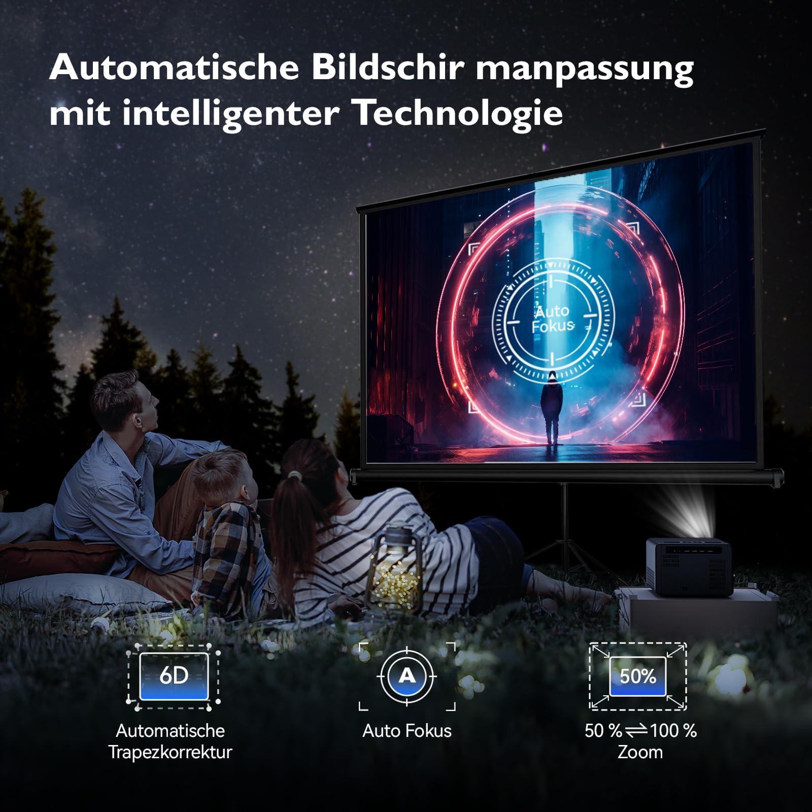 ["AI Autofocus and Automatic Keystone Correction"] The portable projector features an AI focus algorithm and a 6D 4P keystone correction, which allows for a clear rectangular image to be created in just 3 seconds without tedious manual operations. Equipped with sensors and a multidirectional gyroscope, it automatically detects changes and movements in the environment and adjusts the image accordingly to ensure clarity.