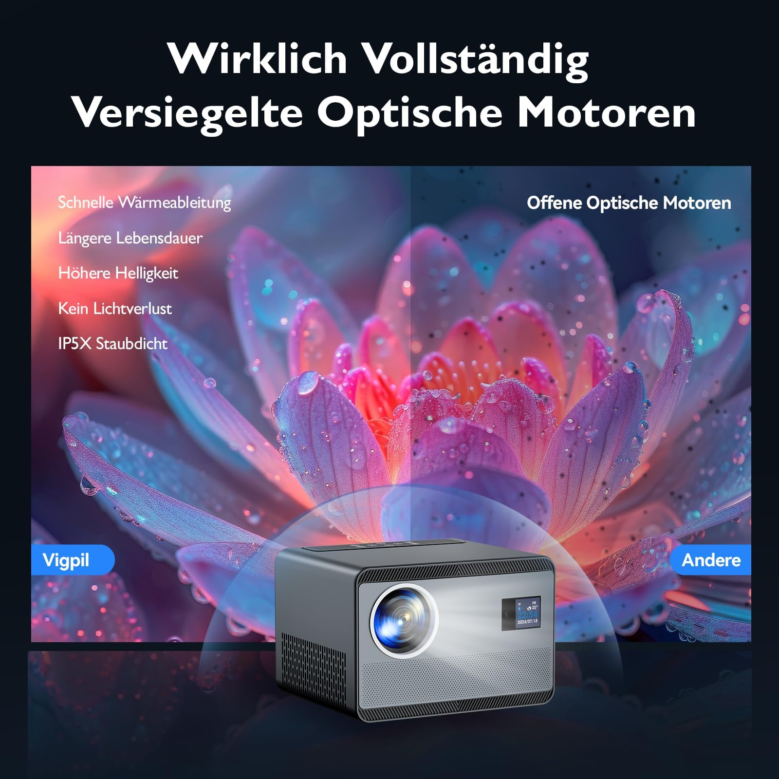 ["Fully Sealed Optical Engine and 50% Zoom"] It uses a fully sealed optical design that effectively prevents dust from entering, reduces black spots and image loss, and extends the life of the projector. The 4K home theater projector is equipped with a 50% to 100% zoom function. You can freely adjust the size of the projected image according to the scene and enjoy a visual feast at the highest level.
