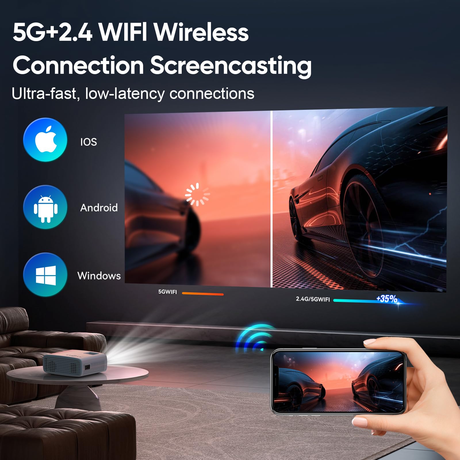 ["【True Native 1080P 5G WiFi Projector】To meet the needs of our customers, the new model has been updated to native 1080P, 5G & 2.4G compatible, 15000L brightness. Supporting 4K resolution and 10000:1 contrast ratio, this product delivers a vibrant and colorful image, providing you with a true cinema experience, whether for home movie nights or evening activities with family or friends.","【Advanced 5G WiFi Connection in 5 Seconds】Equipped with the latest 5G/2.4G dual-band WiFi, the projector can connect directly to your devices via home WiFi in 5 seconds, with no audio or video latency. Unlike other projectors on the market, you don't need to buy additional adapters to connect your mobile phones/tablets or laptops.","【Not Just a Projector, But Also a Speaker】This projector features improved dual-way Bluetooth 5.2 connectivity. When in Bluetooth transmission mode, you can wirelessly pair external speakers or headphones for an impressive audio experience and enjoy cinema-level surround sound. When in Bluetooth reception mode, you can connect to your smartphone via Bluetooth to use the projector as a speaker. (Note: Bluetooth does not support screen mirroring with your phone)","【Portable Yet Powerful】Thanks to its compact size, you can easily take it on the go. Its small size also fits well in your home. You can set it up anywhere to enjoy a cinema experience with even better brightness and sharpness than larger projectors. Adjust the distance from 1.5 to 5 meters to display a larger 40 to 200-inch screen. With a 100% to 50% zoom function, you can adjust the screen size without moving the projector.","【Easy Setup】The small projector comes with HDMI, USB, and aux connections, making it easy to connect to laptops, phones, tablets, and USB for more exciting entertainment. Adjust the vertical keystone correction of ±15° and focus control on the projector to easily obtain perfectly rectangular and clearer images. Set a specific time for the projector to turn off in case you forget to power it off."]