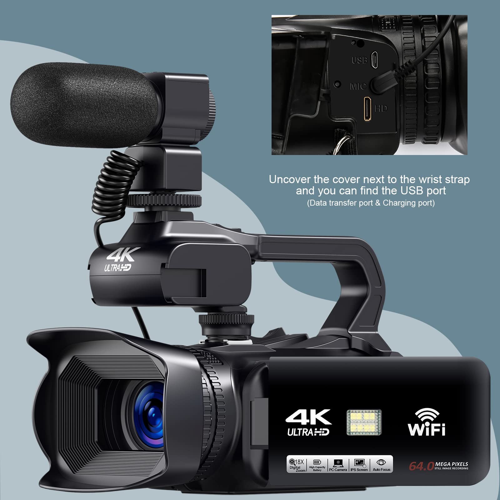 ["4.0-Inch Touchscreen 4K 64MP & 60FPS Video Camera】It uses the latest updated 13.0MP sensor and the maximum image pixel size is 64.0M. The Vlogging Camera supports an 18x digital zoom and a 4.0-inch touchscreen that can be rotated up to 270 degrees, allowing this camcorder to capture high-quality images with plenty of details and record vibrant videos of your meaningful time.","Camcorder with Autofocus Function】This 4K camcorder features a new autofocus function, it can automatically focus and make images clearer. Note: The trigger is set so that autofocus is activated when half-pressed (at least 10cm away from the object, shooting distance is 10cm to infinity). photographing when fully pressed. Compared to the traditional remote control, the 2.4G remote control can be wirelessly controlled 360°.","【WLAN Connection and Webcam Function】The 4K video camera supports WLAN function. You can download the "XDV PRO" APP to your phone to control the camera and easily transfer the videos and images to your phone. This camcorder can also be used as a webcam, you can use it for work, streaming on Twitch or video chats with family.","【Multifunctional 4K Camcorder】This camcorder video camera 4K supports recording while charging, slow motion, time lapse, webcam, self-timer, HDMI output, external microphone, WIFI control, max. 256 GB SD card etc. It also supports a standard tripod (not included). All functions are sufficient for daily shooting, you can use it for church recordings and capture every moment.","【4K Camcorder Kit Bundle】The entire camcorder bundle kit includes a 64GB SD card, an external microphone, a camera backlight hood, a 2.4G 360-degree remote control, a 4500mAh battery, stabilizers, and so on. One purchase meets all your photo needs."]