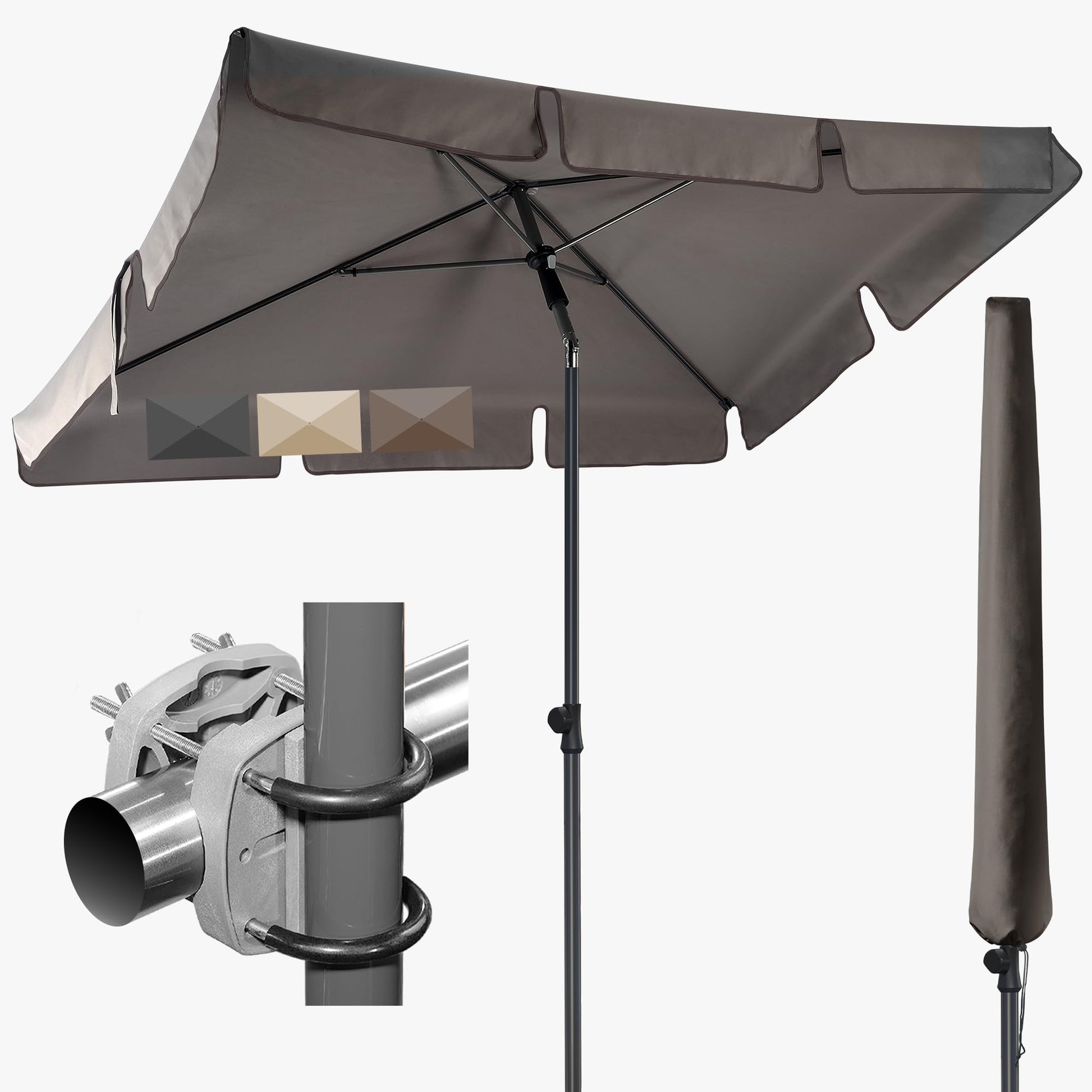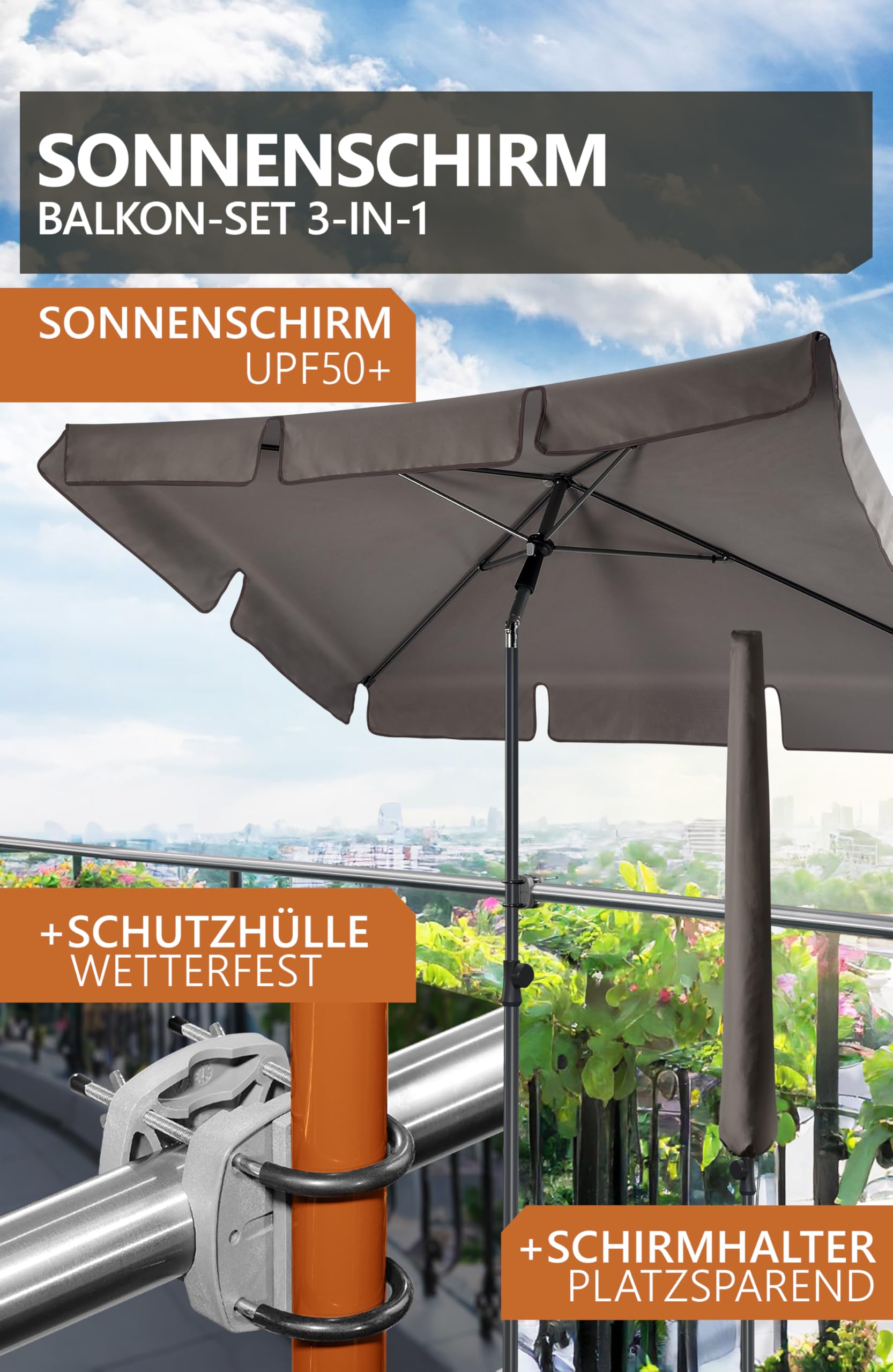 "3-IN-1 BALCONY SUNSHADE SET - Rectangular balcony sunshade with bracket and sunshade cover as a brilliant all-in-one solution for balcony sun protection. Create shady oases with the UPF 50+ balcony umbrella with tilt function that protects securely from the sun; rectangular balcony sunshade 190 x 125 cm. Quickly mount the sunshade holder on round and square railings, handrails, posts vertically or horizontally. Perfectly solve sun protection on the balcony with the space-saving umbrella holder securely and stably attached to the balcony railing. Umbrella balcony in ideal size and shape, specifically optimized dimensions and functions for balconies"