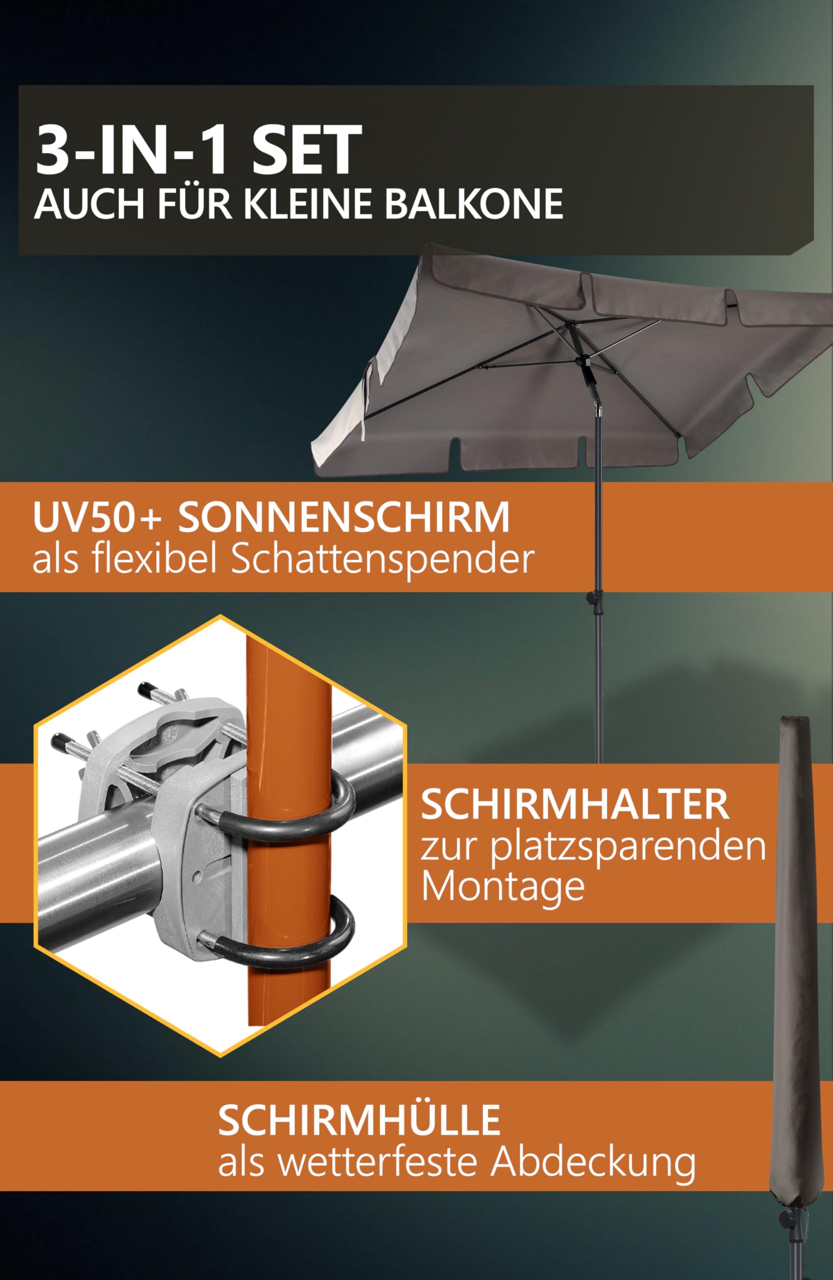 4smile balcony umbrella SunnyShade Plus, Sun protection balcony SET 3-in-1, Taupe - UV50+ rectangular umbrella 200 x 125 cm + umbrella holder balcony railing + umbrella cover.