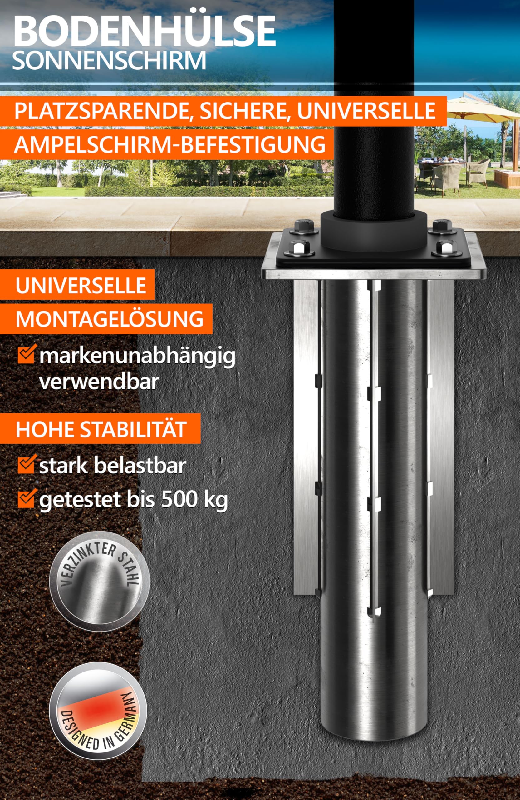 SPACE-SAVING AND UNIVERSAL - By concreting, the ground socket for sun umbrellas is a space-saving and inconspicuous umbrella stand replacement; Universal ground socket cantilever umbrella."