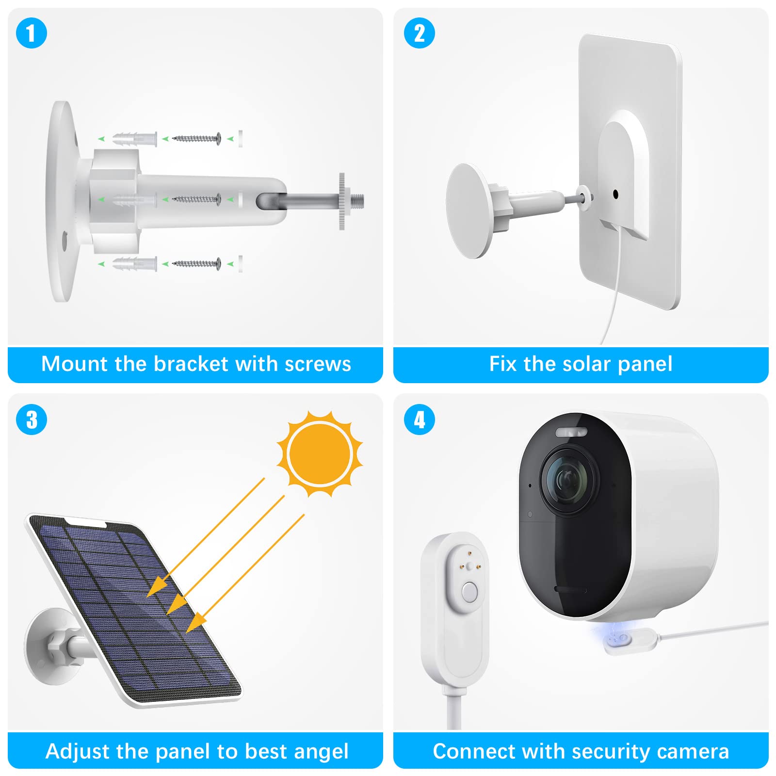 ["Perfect Compatibility: Solar panel charger only for Arlo Pro 3/Pro 4/Pro 5S/Ultra/Ultra 2/Go 2. A set-it-and-forget-it solar panel makes your life easier, no more battery changes, no power adapter required.","[Easy Installation] Solar panels for Arlo Pro 3 come with 360° adjustable wall mounts to ensure maximum sunlight exposure flexibly, so you can get plenty of sunlight for a good charge all day long. A 3m long cable helps you place the panel in the best-lit spot. Plug and works great don't have to climb the ladder anymore!","Efficient Solar Cells: The solar panel is made of high-quality PV cells, with conversion efficiency 1.3 times that of other solar panels with 5V 4W (max) output power. Multiple hours of lighting keep your camera charged around the clock, so you can truly relax knowing you are protected day and night.","[IP65 Solar Panel for Ring Camera] With IP65 monocrystalline silicone, waterproof and rust-free, the solar panel keeps your camera safe in rain and snow without worrying about power outage. Solar panel for the camera also performs well in hot weather or very bad weather.","Note: Only compatible with Arlo Pro 3/Pro 4/Pro 5S/Ultra/Ultra 2/Go 2. 1 x 4W solar panel, 1 x 3m long cable with magnetic connection, 1 x 360° mounting bracket, 3 x screws and anchors, and a user manual (may not be in German language)."]