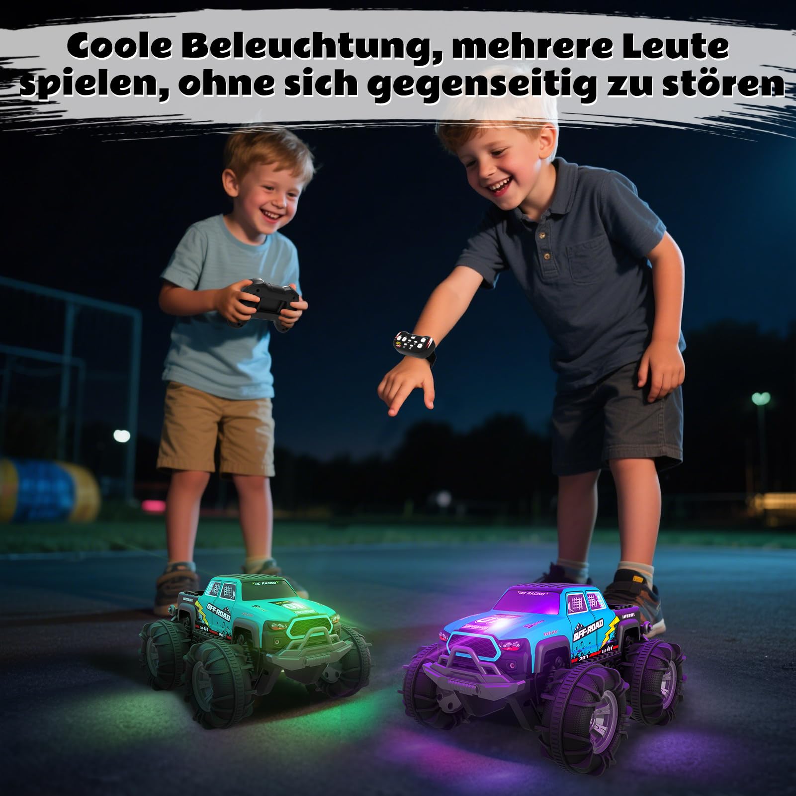 "【Off-Road Capability & Waterproof Design - For Any Terrain】 With its strong 4WD all-wheel drive and a speed of up to 15 km/h, the amphibious car conquers sand, grass, mud, and water. Thanks to IPX5 water protection, it is perfect for the garden, snow, beach, or pool - a perfect outdoor toy for little adventurers.",