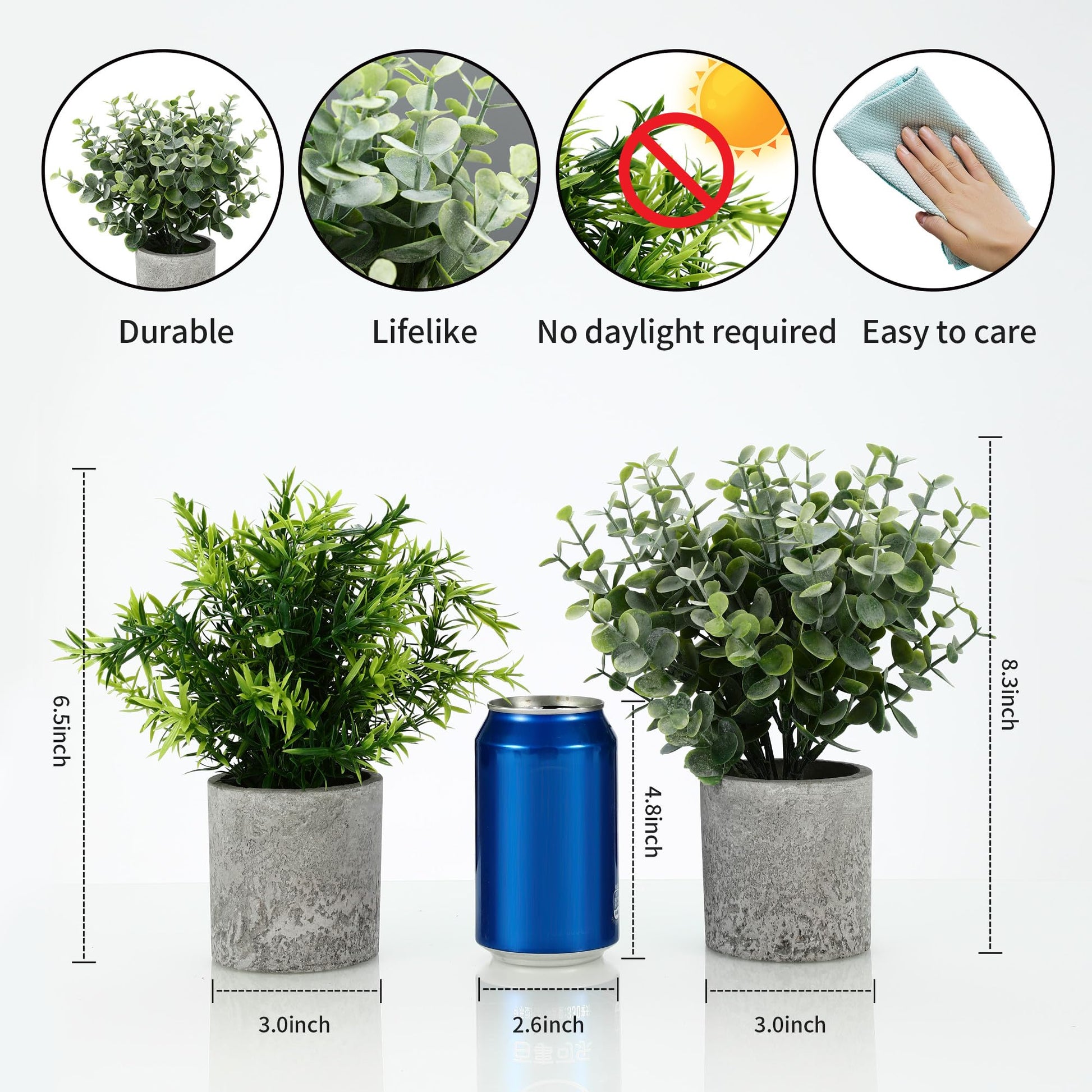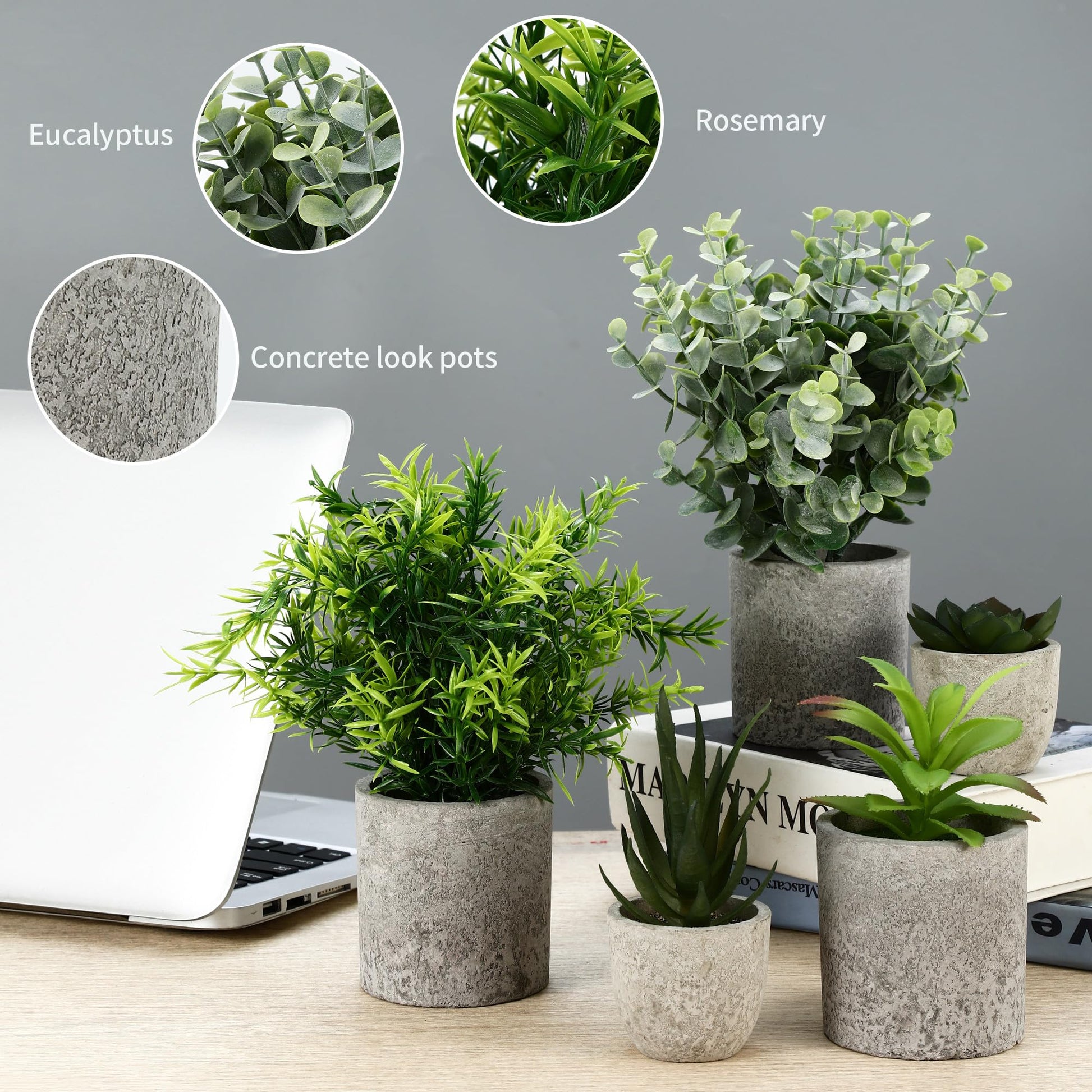 ["Easy Care: Artificial plants do not need sunlight, water, or fertile soil. They do not need to be watered or pruned, and they do not wilt or fade. Simply wipe the leaves to remove dust if desired.","High-Quality Material: Artificial plants are made of environmentally friendly PVC material, safe and eco-friendly. The plant container made of pulp is durable and not easy to break. Please do not soak or place in water.","Beautiful Decoration: Our artificial plants are lifelike and perfect for furniture and office decoration. You can place our artificial plants on desks, coffee tables, window sills, and more.","Exquisite Gifts: Mini decorative artificial plants are green, natural, easy to care for, and durable. Perfect for birthday gifts, wedding decorations, and holiday gifts for friends and family.","Package Content: The package includes 5 different artificial plants: eucalyptus, rosemary, and succulents. The lifelike decorative plants require no daily care and do not fade or rot. Busy people can easily choose."]