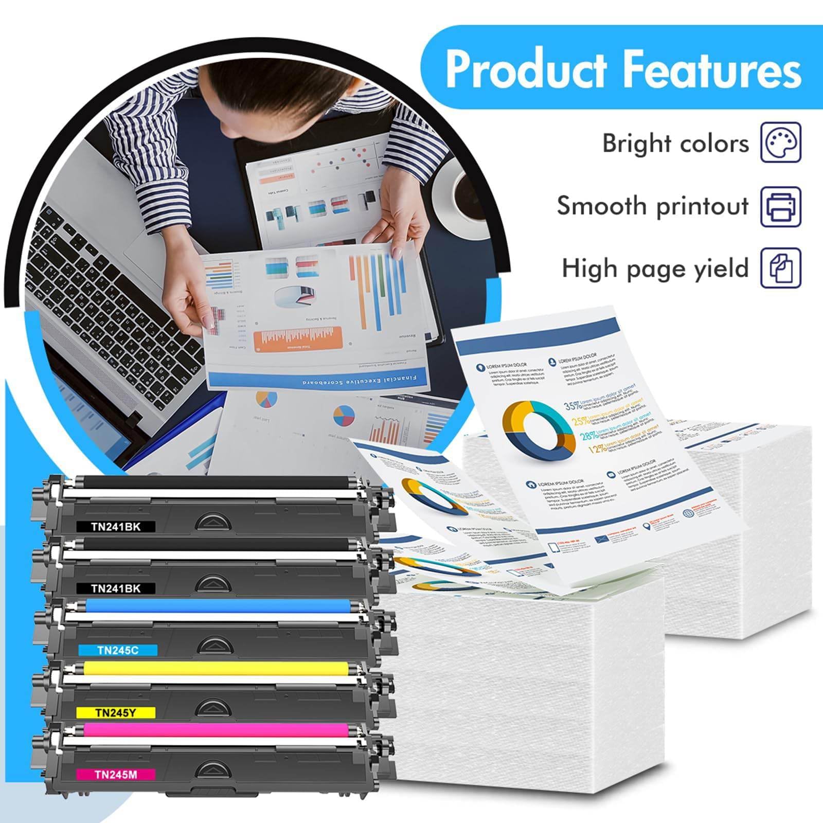["Compatible Toner Cartridge Replacement for TN-241 TN-245 TN242 TN246 TN242CMY TN-241BK TN-245C TN-245M TN-245Y for MFC 9332CDW Toner","Package Contents: 2 Black TN241BK TN242BK, 1 Yellow TN245Y TN246Y, 1 Cyan TN245C TN246C, 1 Magenta TN245M TN246M Toner for Brother DCP 9022CDW","Page Yield: TN-241BK Black Cartridge 2,500 Pages, TN-245C TN-245M TN-245Y TN-242CMY Color Toner Cartridge 2,200 Pages (Based on 5% Coverage)","Compatible Printers: DCP-9020CDW MFC-9332CDW HL-3140CW DCP-9022CDW MFC 9340CDW MFC-9330CDW HL 3142CW Laser Printer","Compatible Printers: HL-3152CDW HL-3170CDW HL-3150CDW HL-3150CDN HL-3172CDW, MFC-9142CDN MFC-9342CDW MFC-9140CDN MFC-9130CW MFC-9130CDN, DCP-9015CDW DCP-9017CDW Printer Cartridges"]