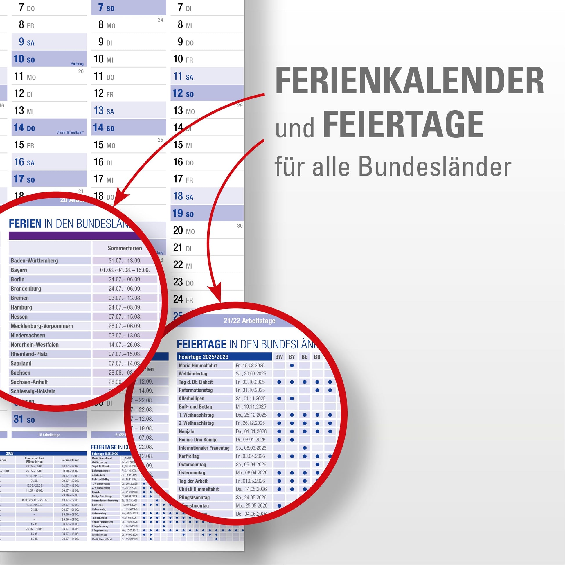 Clear design: Colored holidays and weekends, as well as a separate overview of school vacations, provide a good overview in our Wall Calendar 25/26.