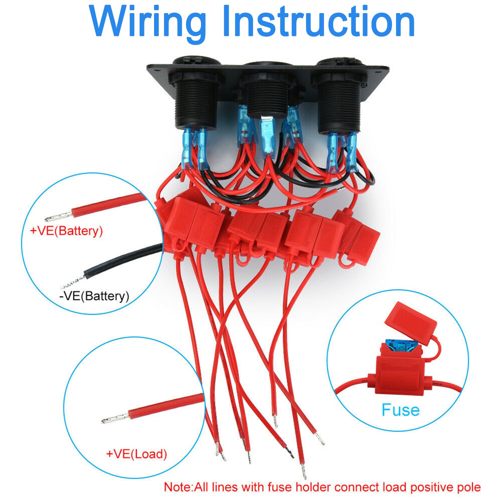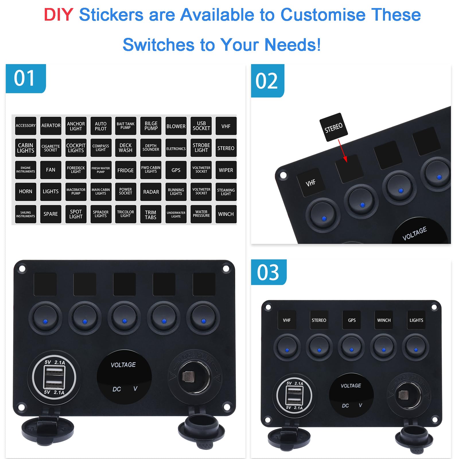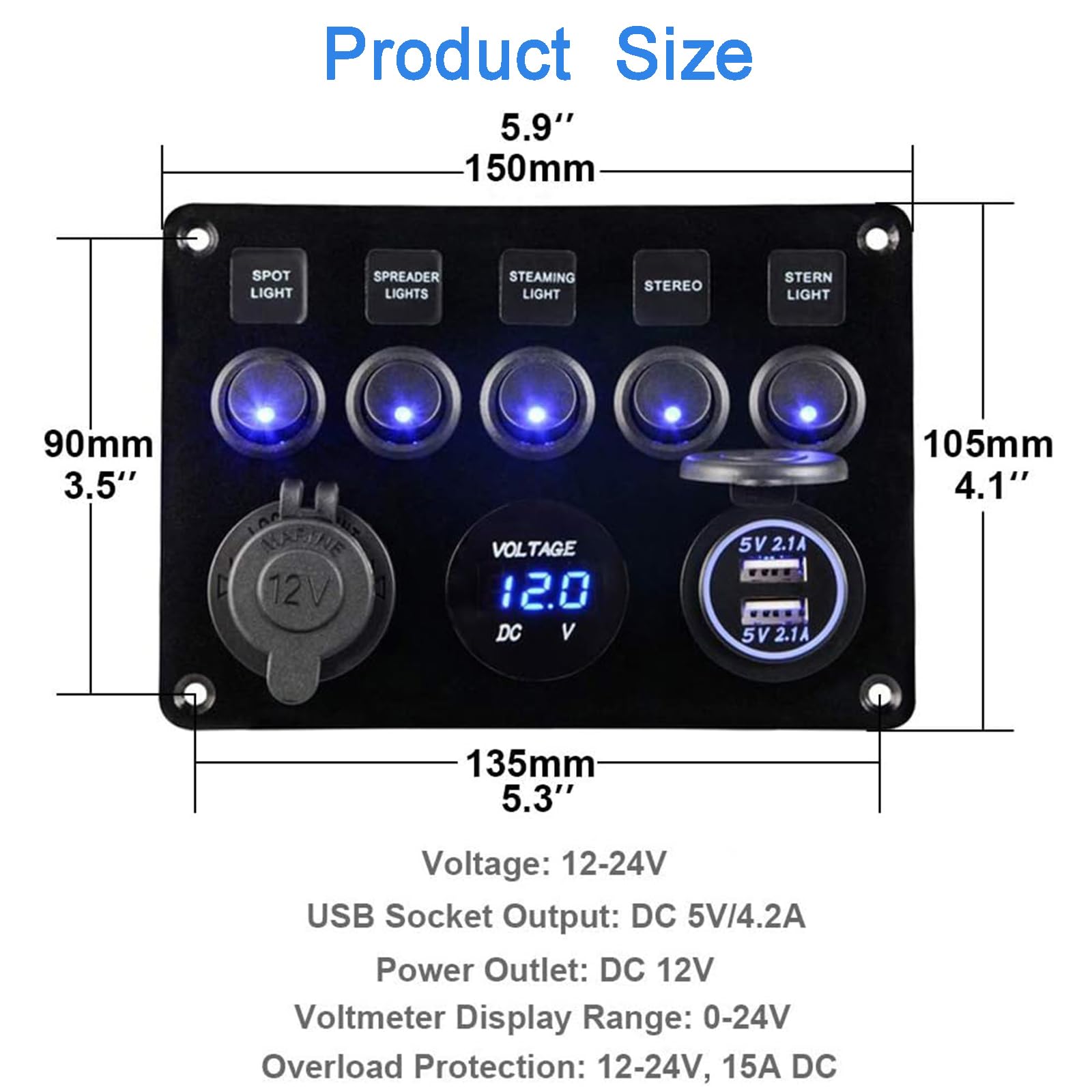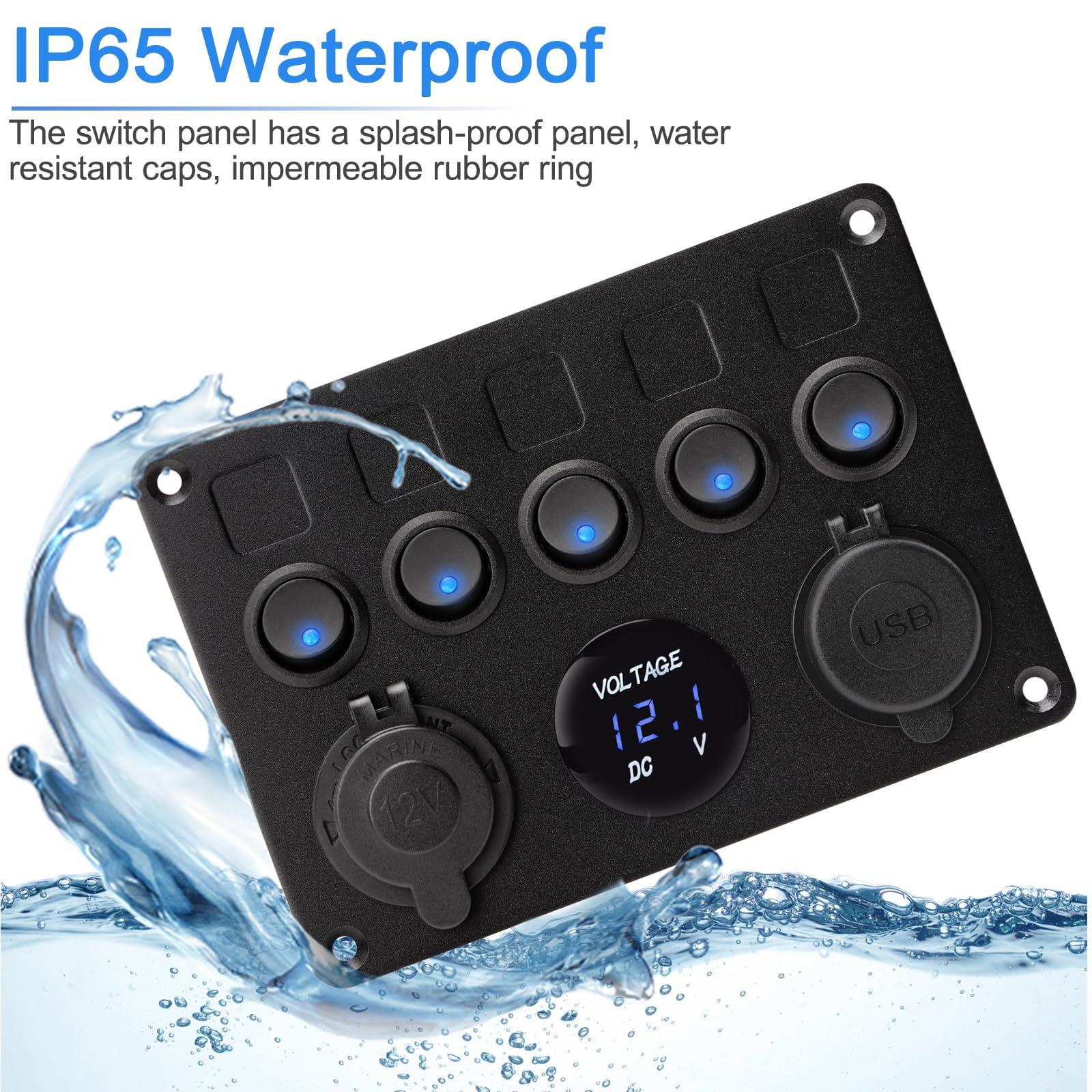 ["Multifunction Marine Switch Panel Including 5 ON-OFF blue LED toggle switches, 12V cigarette lighter sockets, dual USB charger (5V 2.1A), and 12V/24V LED digital voltmeter. Great for circuit control, charging needs, and voltage monitoring.","Waterproof Protection IP65 waterproof, the switch button has been rigorously tested. It features high-quality aluminum plate, scratch-resistant and corrosion-resistant, with rubber sealing cap for all sockets to be dustproof and dirtproof.","Durable to Use The panel is made of high-quality aluminum sheet, making it scratch-resistant and corrosion-resistant. You can even use it at -25℃~85℃. Built-in red LED light so you can clearly see the switch in dark environments.","Easy Installation Panel is pre-wired, you just need to connect the red wire to the "+" of the power supply and the black wire to the "-" of the power supply. 4x stainless steel screws and labels included, easily installed in 12V systems.","Wide Application These blue LED illuminated toggle switches are widely applicable for marine boats, cars, RVs, vehicles, trucks, yachts, off-road, caravans, etc."]