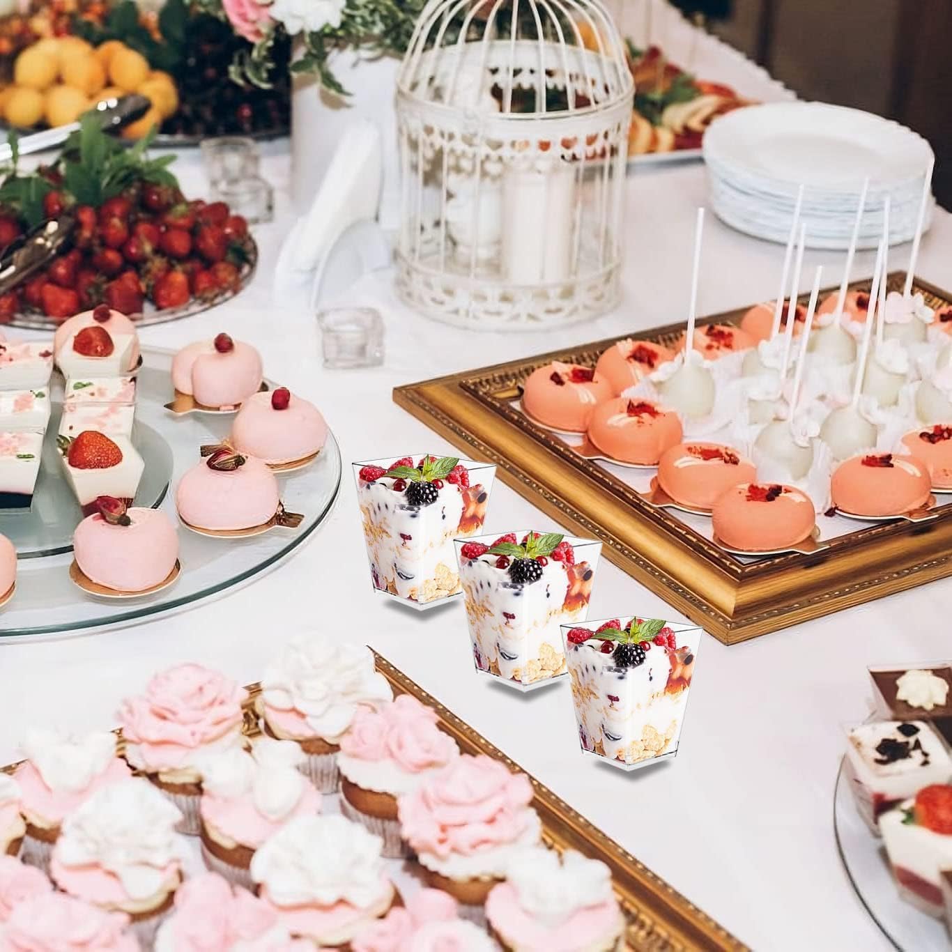 50 pieces of dessert cups with 50 spoons, 8 OZ/240ML clear dessert bowls. Reusable square and trapezoid dessert cups for home, desserts, pudding, mousse, ice cream, and parties.