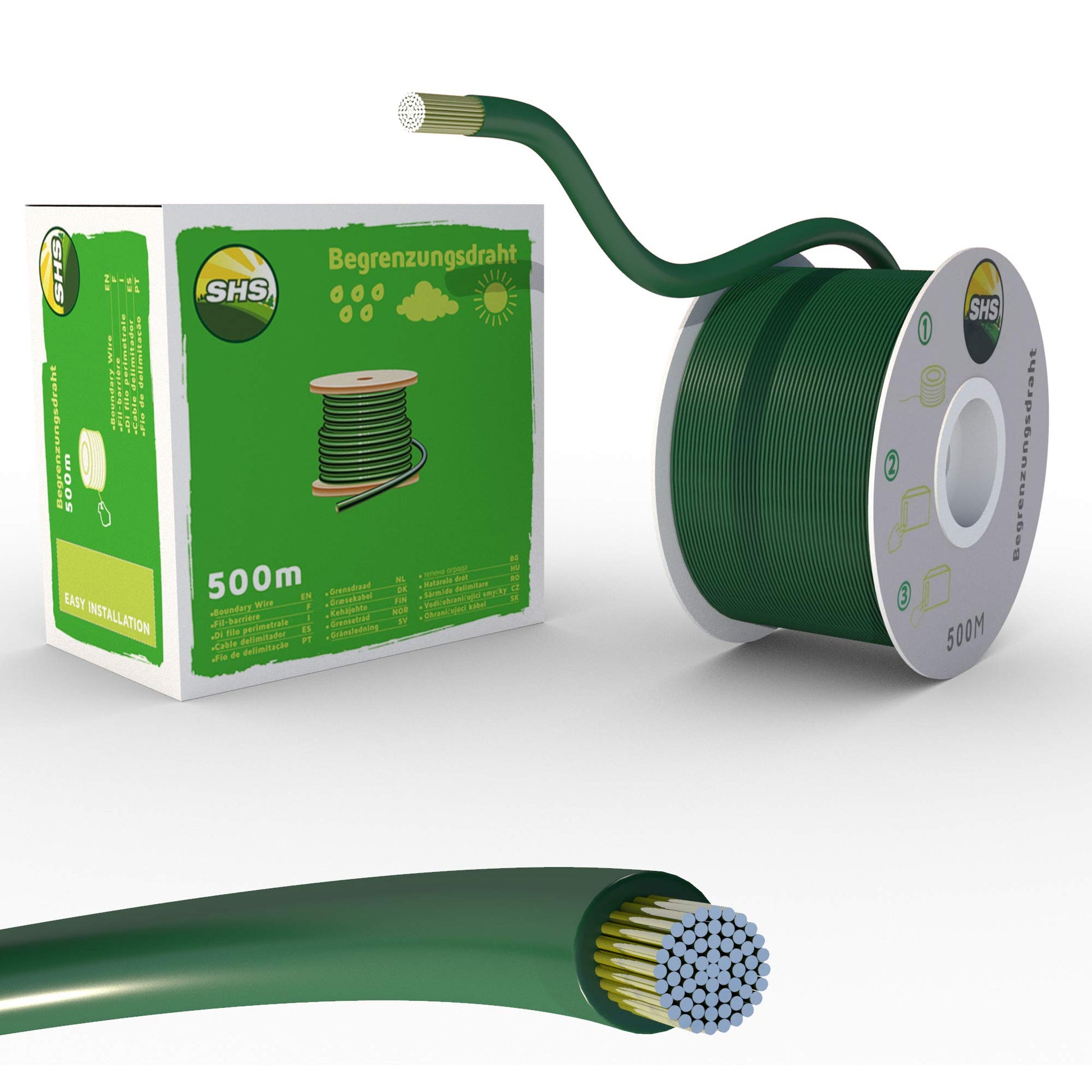 ["Boundary cable from SHS - PLUG & PLAY packaging","500m length - Flexible cable for easy installation","In the convenient unwinding and storage box","Lawn-like green color. 0.13 inch diameter","Weatherproof insulation"]