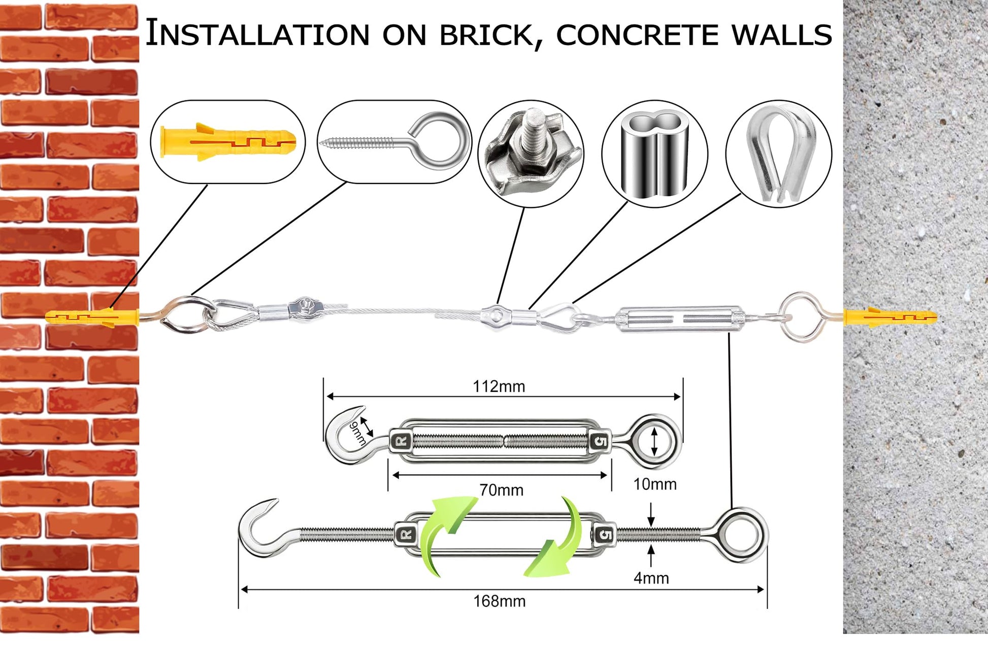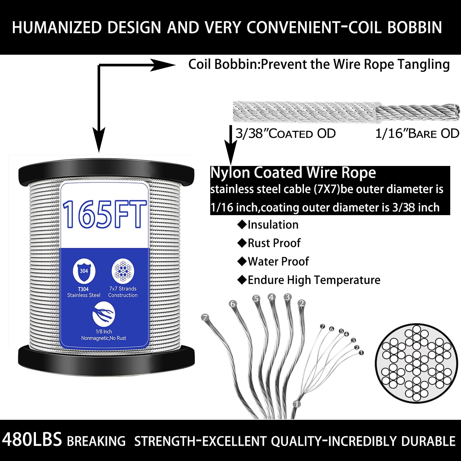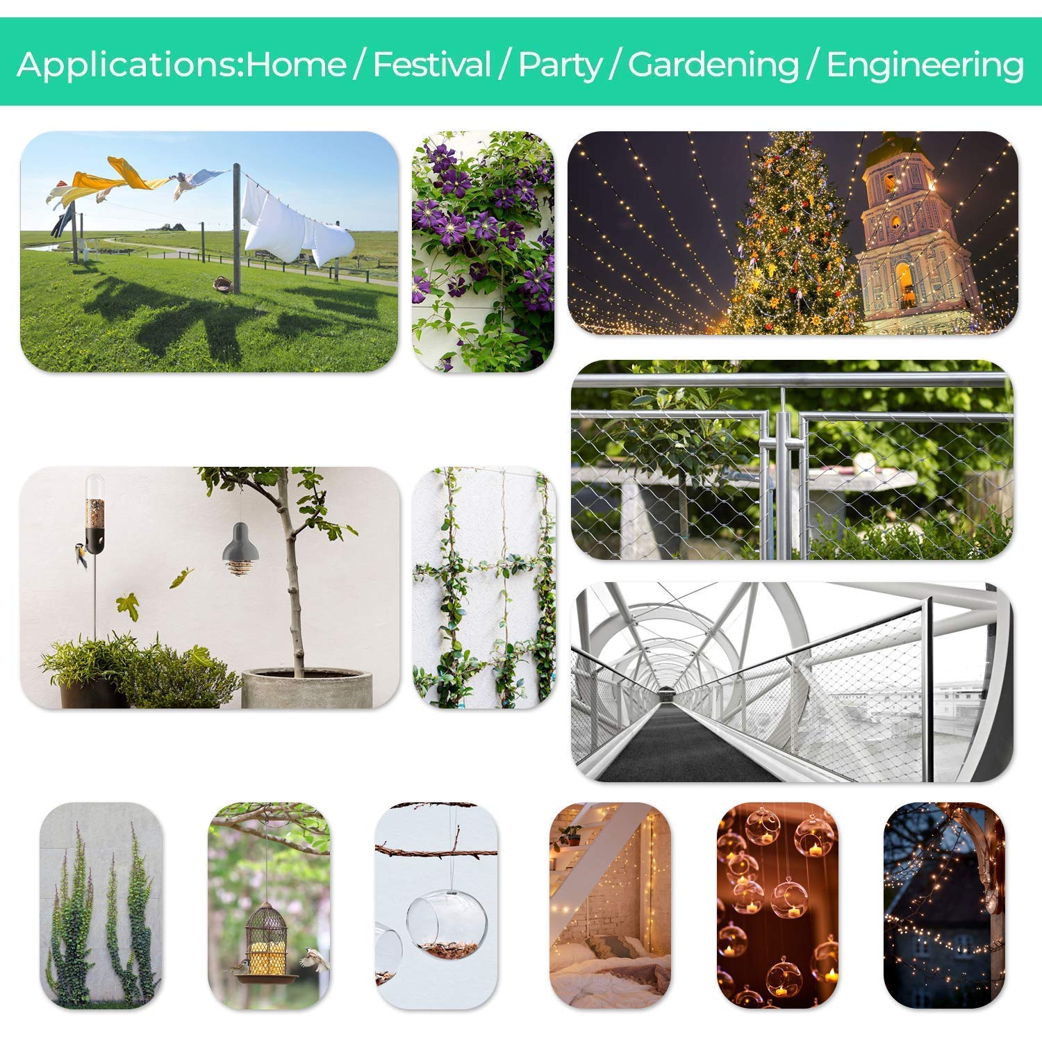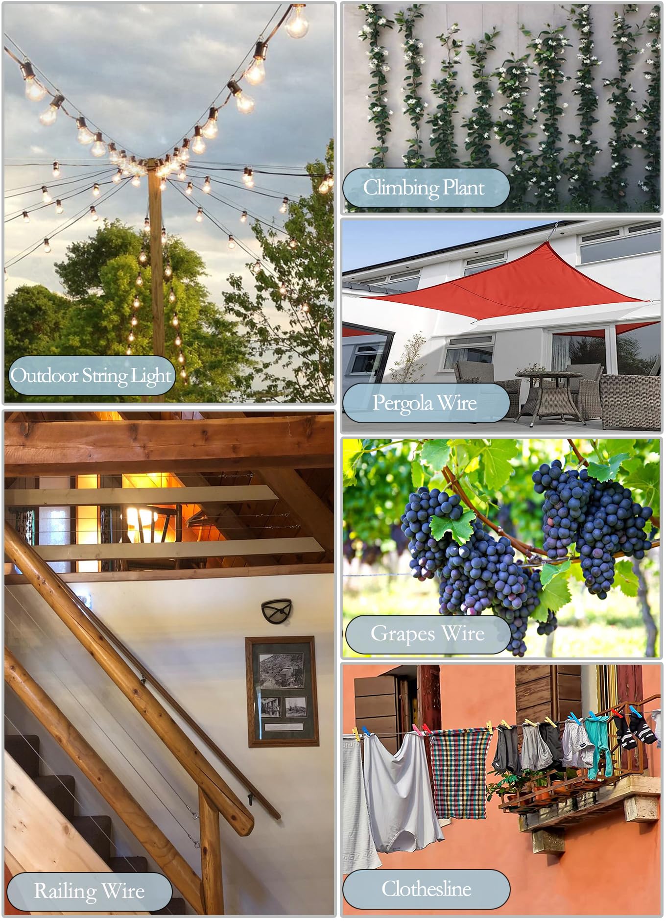 ["Wire Rope Kit】2mm wire rope 164ft, 5pcs M5 turnbuckle tensioner, 10 pcs M2 304 stainless steel wire rope thimble, 10pcs M5 304 stainless steel screw eyes, 30pcs M2 aluminum wire rope clamp, 4pcs M5 carabiner hooks, 10pcs 8 *40 expansion screws, 10pcs M3 wire rope clips,"Stainless Steel Wire Rope 2mm】Made of 304 stainless steel, 7X7 structure, Stronger load capacity, toughness, and durability, 2mm steel rope coated with plastic layer to make the surface smoother and burr-free, isolate the steel wire from external contact, improve rust resistance, fine workmanship, strong and durable,"Stainless steel wire 2mm】Wire rope tensioner stainless steel kit is very easy to install. Only aluminum crimp sleeve tools and cable cutters are needed to complete the deck cable railing. The turnbuckle can be adjusted to tighten the wire rope. Removable and reusable,"M5 turnbuckle】Sturdy M5 stainless steel turnbuckle for easy and secure installation of the wire rope. Easily adjustable to control the tension of the steel cable. Ideal accessory for fence, vine, and trellis projects,"Coated Steel Cable 2mm】Suitable for wire rope curtain hanging, hanging fairy lights, hanging globe lights, hanging patio lights in the garden, hanging pictures, outdoor applications of tent ropes, clotheslines, hanging outdoor lights, deck cable railing, etc."]