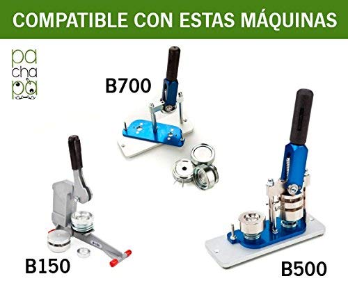 ["BUTTON BLANKS 59MM COMPLETE SETS FOR BADGEMATIC & EU-BUTTON MACHINES TYPE 900, FLEXI consisting of:","500 pieces of metal tops","500 pieces of metal backs with inserted safety pin","500 pieces of clear film sheets (Ø 69.8mm)","You can be confident that our products are precision-made. These button blanks are specially made for Badgematic and EU button machines. They are not suitable for button machines from other manufacturers. If anything is not to your complete satisfaction, we will find a solution."]