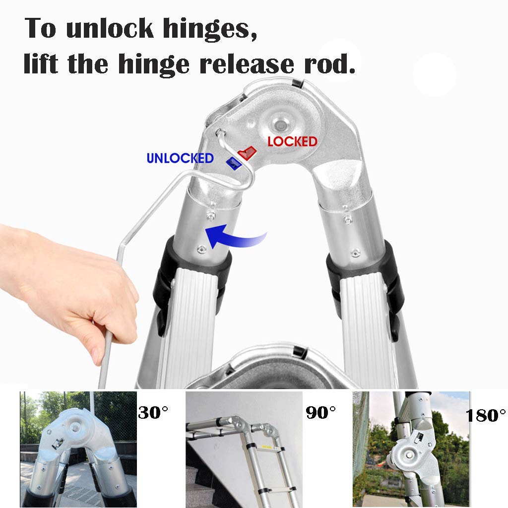 ["5 m Telescoping Ladder: 5 m extendable telescoping ladder with 16 steps. The folded height is 86 cm, while the full height of this extension ladder is 5m, it can be an A-frame folding ladder or a tall straight ladder. Width of steps: 30 cm. You can easily adjust step by step to reach and achieve any desired height","Aluminum Alloy Ladder: This foldable 5m telescoping ladder is made of high-quality aluminum alloy, which is corrosion-resistant, rust-proof, and durable. The maximum load capacity of the telescoping ladder is up to 150 kg / 330 lbs","Safe and stable: ① This 5m extending ladder comes with a stabilizer that keeps the entire ladder stable. ② With anti-slip design for the feet and steps of this 5m extendable ladder to avoid accidents slipping when you","Easy to extend and adjust height: When extending this folding ladder, pull up the steps equipped with independent locking mechanisms on each rung, it will automatically lock. Unlock each section independently in 30cm to adjust the ladder height to your needs. To retract, simply unlock step by step","Easy Transportability: With a length of 5m (16.5 ft), this telescoping ladder can be easily stored in your car or other tight spaces. Convenient and useful collapsible ladder for individuals and professionals"]