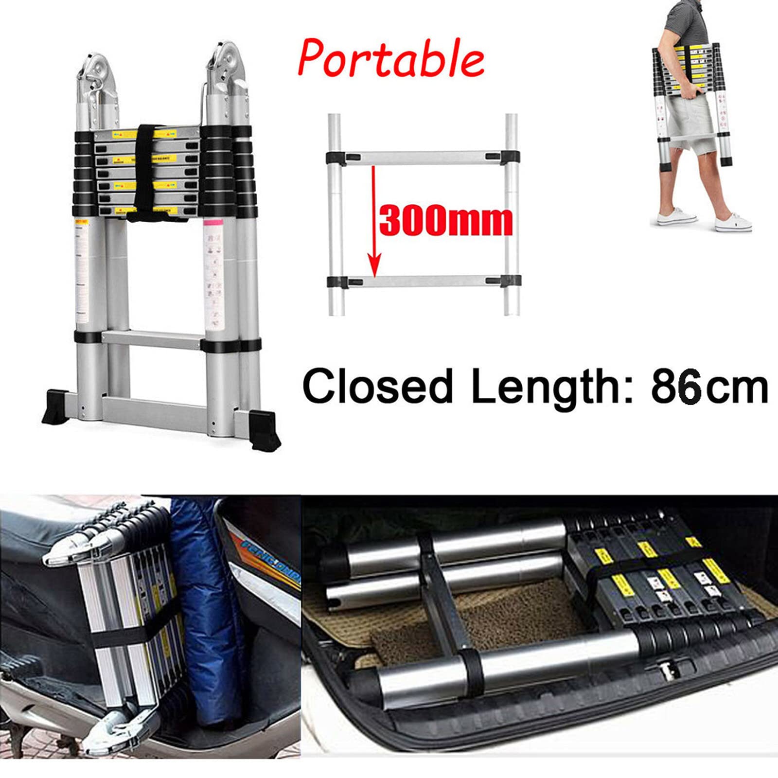 "5m Telescopic ladder: 5m extendable telescopic ladder with 16 steps. The folded height is 86 cm, while the full height of this extension ladder is 5m, it can be a A-frame folding ladder or a tall straight ladder. Step width: 30. You can easily adjust step by step to reach and achieve any desired height","Sturdy Aluminum Telescopic Ladder: This foldable 5m telescopic ladder is made of high-quality aluminum alloy, which is corrosion-resistant, rust-proof, and durable. The maximum load capacity of the telescopic ladder is up to 150kg / 330lbs","Safe and stable: ① This 5m extendable ladder comes with a stabilizer that keeps the entire ladder stable. ② With anti-slip design for the feet and steps of this 5m extendable ladder to avoid accident slipping when you","Easy to extend and adjust height: When extending this folding ladder, pull up the steps equipped with independent locking mechanisms on each rung, it will automatically lock. Unlock each section independently in 30cm increments to adjust the ladder height to your needs. To retract, simply unlock step by step","Easy portability: With a length of 5m (16.5 ft), this telescopic ladder can be easily stored in your car or other tight spaces. Convenient and useful collapsible ladder for individuals and professionals"