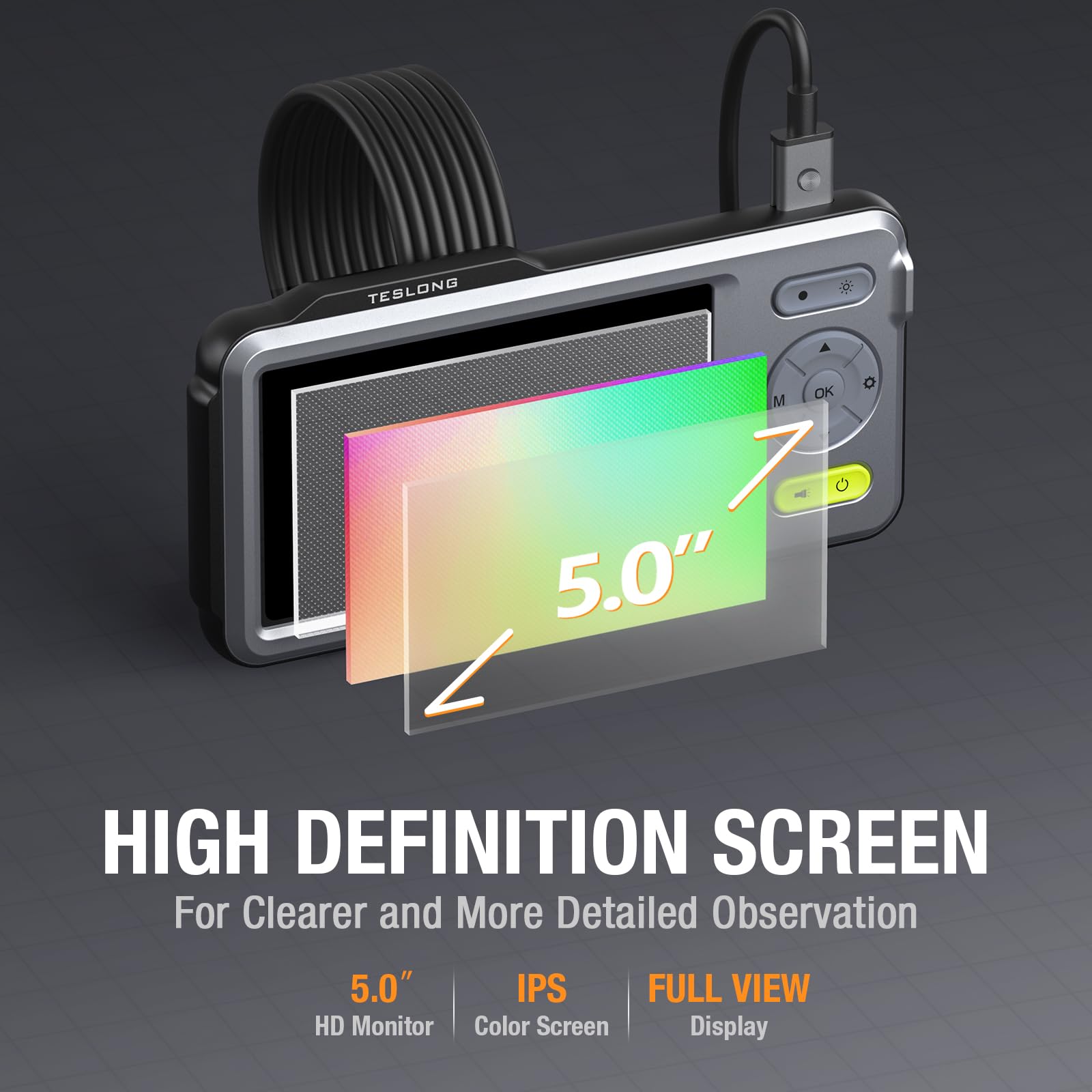 "High-Resolution 5-Inch Screen Endoscope Inspection Camera The lightweight and portable 5-inch large screen has a higher resolution than normal screens. This configuration ensures that users can easily and quickly capture photos or videos. The screen is equipped with tempered glass, which can display videos and photos clearly even in strong sunlight, so users can be satisfied when working outdoors."