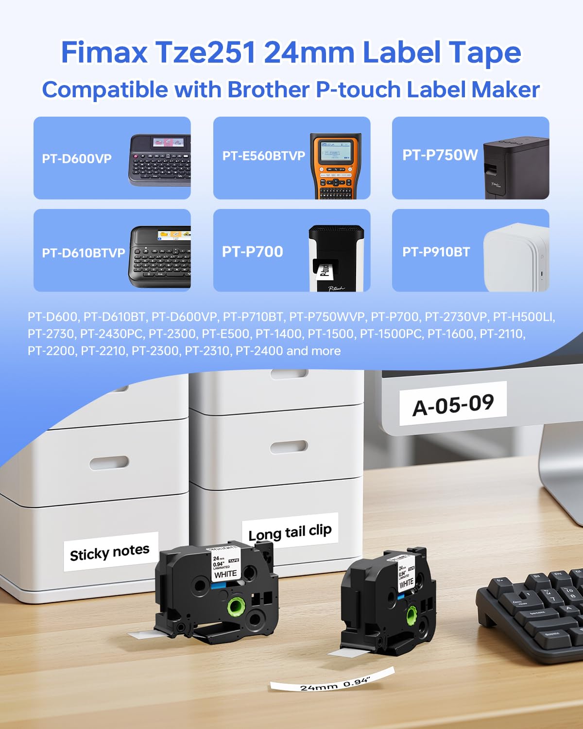["5-pack compatible with Brother P-touch tapes 24mm TZ TZe-251 TZe251 TZ251. Color: black on white. Dimensions: 24 mm x 8 m. Type: laminated tape","The Tze251 label tape offers various applications. It can be used at home for labeling items such as clothing, toys, spice bottles, etc. In the office, it is ideal for organizing documents, such as labeling folders and archive boxes. In the industry, it is suitable for marking cables and wires. In retail, it can be used for price tags and shelf labels. It also provides customizable labels for creative crafts, making it a practical and versatile solution for efficient and clear labeling.","Features of the label tapes: Versatile and clearly printable, easy to peel, good adhesion, resistant to fading, water resistance, abrasion resistance, oil resistance, high and low temperature resistance, chemical resistance.","Tze251 24mm tapes compatible for Brother P-touch labeling machine: PT-330 PT-350 PT-520 PT-530 PT-540 PT-550 PT-E550W PT-580C PT-D600 PT-P700 PT-2410 PT-2420PC,PT-2430PC PT-2500PC PT-2600 PT-2610 PT-2700 PT-2710 PT-2730 PT-2730VP PT-3600 PT-7500 PT-7600 PT-9200PC PT-9200DX PT-9400 PT-9500PC PT-9600 PT-9700PC PT-9800PCN","Perfectly compatible for Brother P-touch labeling machine: PT-P710BT PT-P750W PT-E800T PT-E800TK PT-E800TKW PT-P900 PT-P900W PT-950NW PT-1400 PT-1500PC PT-1600 PT-1650 PT-2200 PT-2210 PT-2300 PT-2310 PT-2400"]