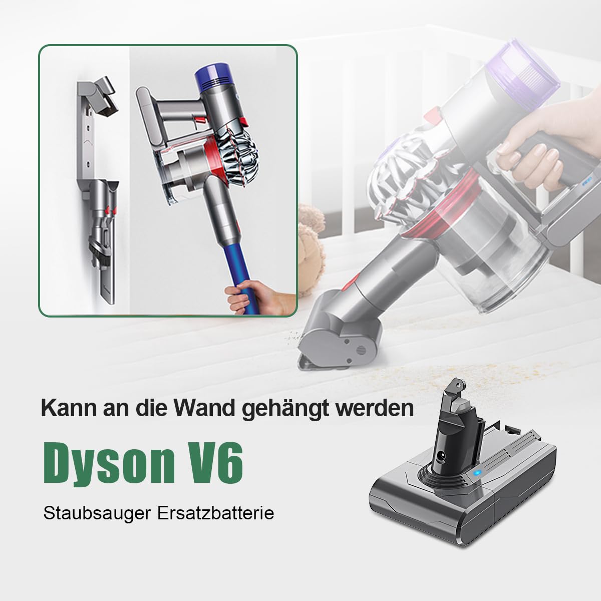 "【Excellent Capacity】This BuTurepre Dyson DC62 Battery Ball is compatible with the Dyson V6 Absolute Series, Dyson V6 SV03 SV05 SV05 SV06 SV07 SV07 SV09, also suitable for Dyson DC58, DC59, DC61, DC62, DC72, DC74, Vacuum Compatible, etc. Like the size of the original battery, you can always hang it on the wall to charge. Please make sure your vacuum model fits before purchasing the V6 battery."