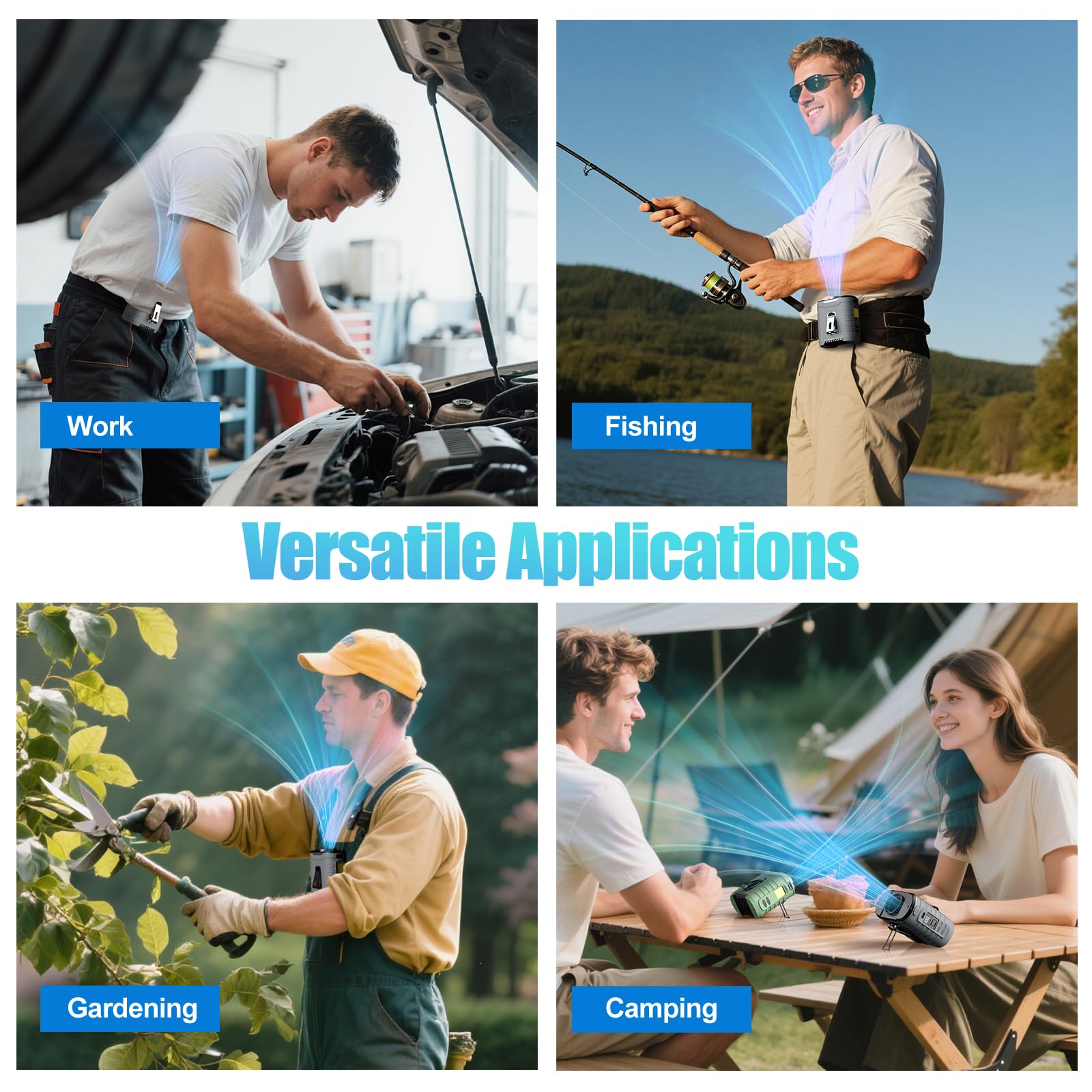 ["【6-in-1 Versatility】Use as a Personal Waist Fan, Belt Fan, Clip Fan, or Table Fan - this Camping Fan fits any situation. With built-in power bank for charging on the go and bright COB light with SOS red light - great for outdoor activities. The fan battery makes it the perfect companion for hot workdays or any camping trip.","【5-speed Adjustable Wind Speed】Choose from five speed levels with up to 16,000 RPM and 18 m/s airflow - ideal as a Clip Fan in hot weather. The powerful motor delivers consistent power even as the battery level decreases. Whether as a Camping Fan in a tent or as a work fan - the individually adjustable wind strength provides cool comfort at all times.","【Durable Battery】The built-in 10,000mAh fan battery allows for 8-40 hours of cooling - perfect for long workdays or camping nights. Rechargeable via USB-C through a car, power bank, or outlet. Can also be used while charging - a real advantage on the go. This Camping Fan won't let you down even in the heat.","【Innovative COB Light】COB light shines brighter and more evenly than traditional LEDs - perfect for use as a Camping Fan with an additional function. Two SOS modes provide safety during outdoor adventures. Whether hiking, in a tent, or as a Clip Fan on clothing - the combination of light and fan battery offers maximum utility.","【Suitable for any situation and durable】Sweat-resistant, lightweight, and portable - this Clip Fan is ideal for camping, hiking, or working. USB and Type-C ports are rustproof and durable. With a powerful fan battery and COB light, this Camping Fan is the perfect gift for adventurers and heat workers alike."]