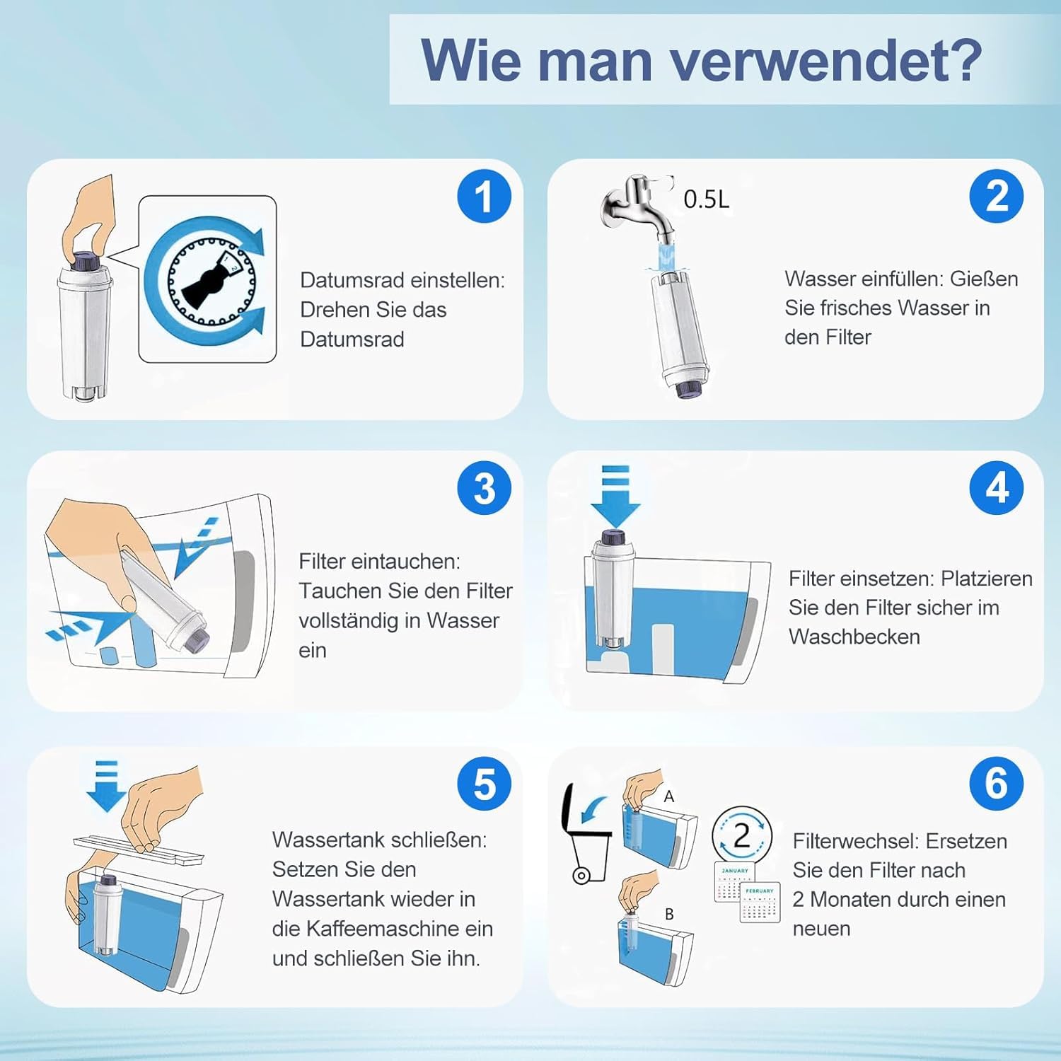 "✔️【Wie zu verwenden】Soak the filter in clean tap water for 5-10 minutes before use to rinse out the filter and remove air bubbles. For the best taste, it is recommended to change the filter every 2 months. It depends on your water quality."