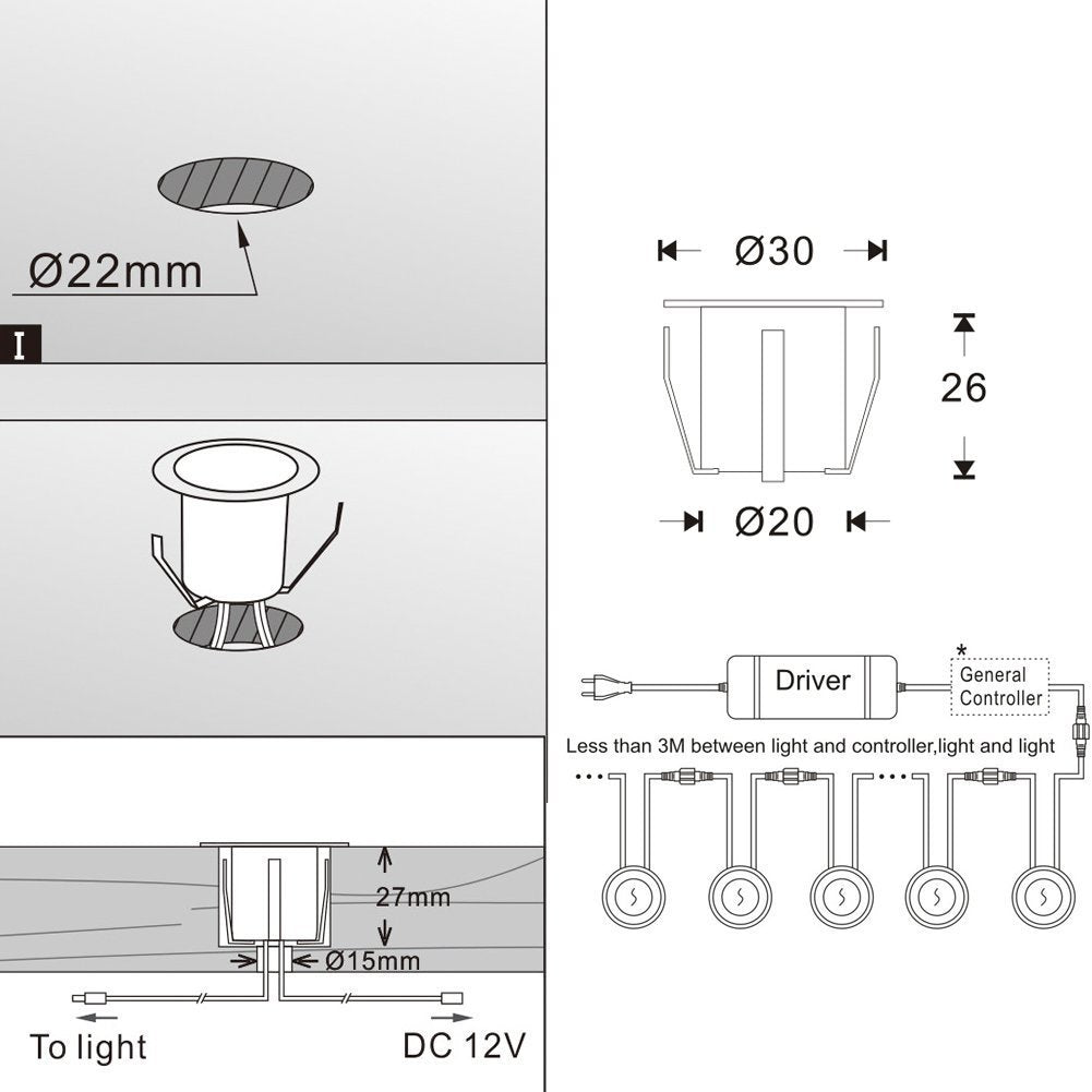 "Dimensions: Diameter 30mm * Height 26mm. 2.2M long power cable, maximum distance between 2 lights is 1m."